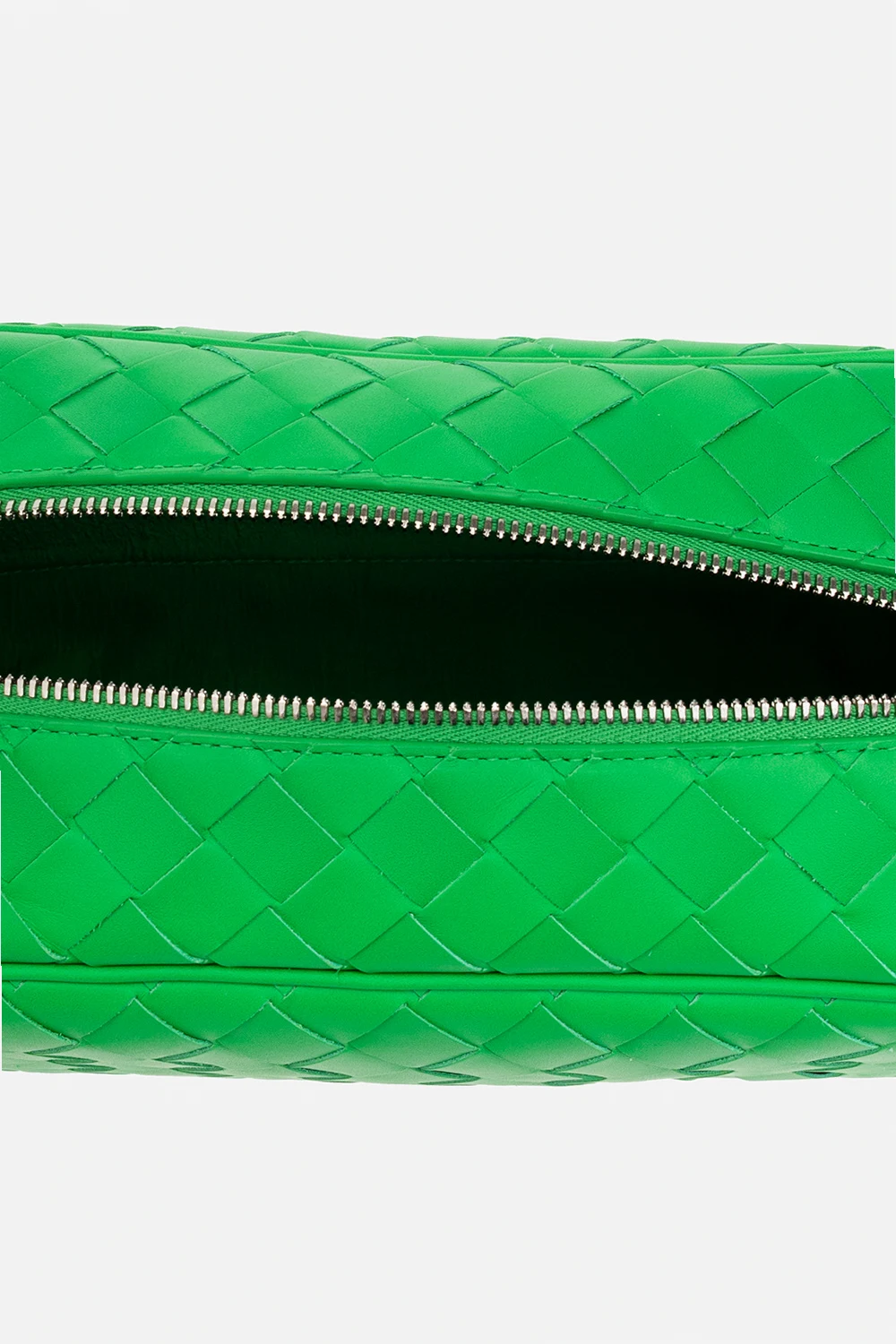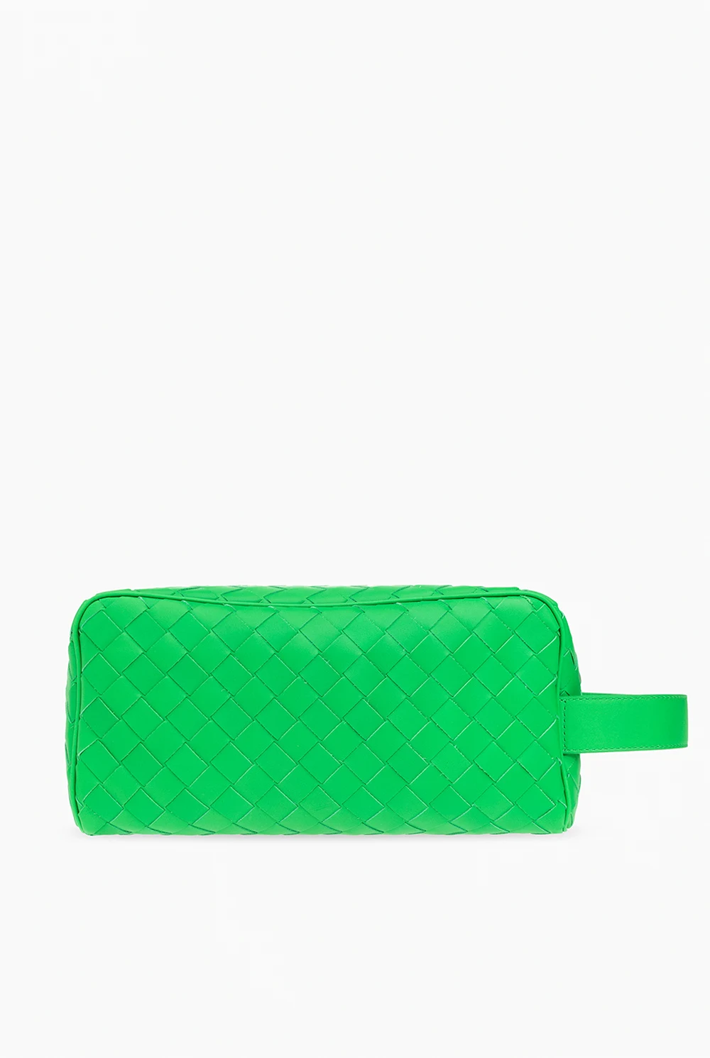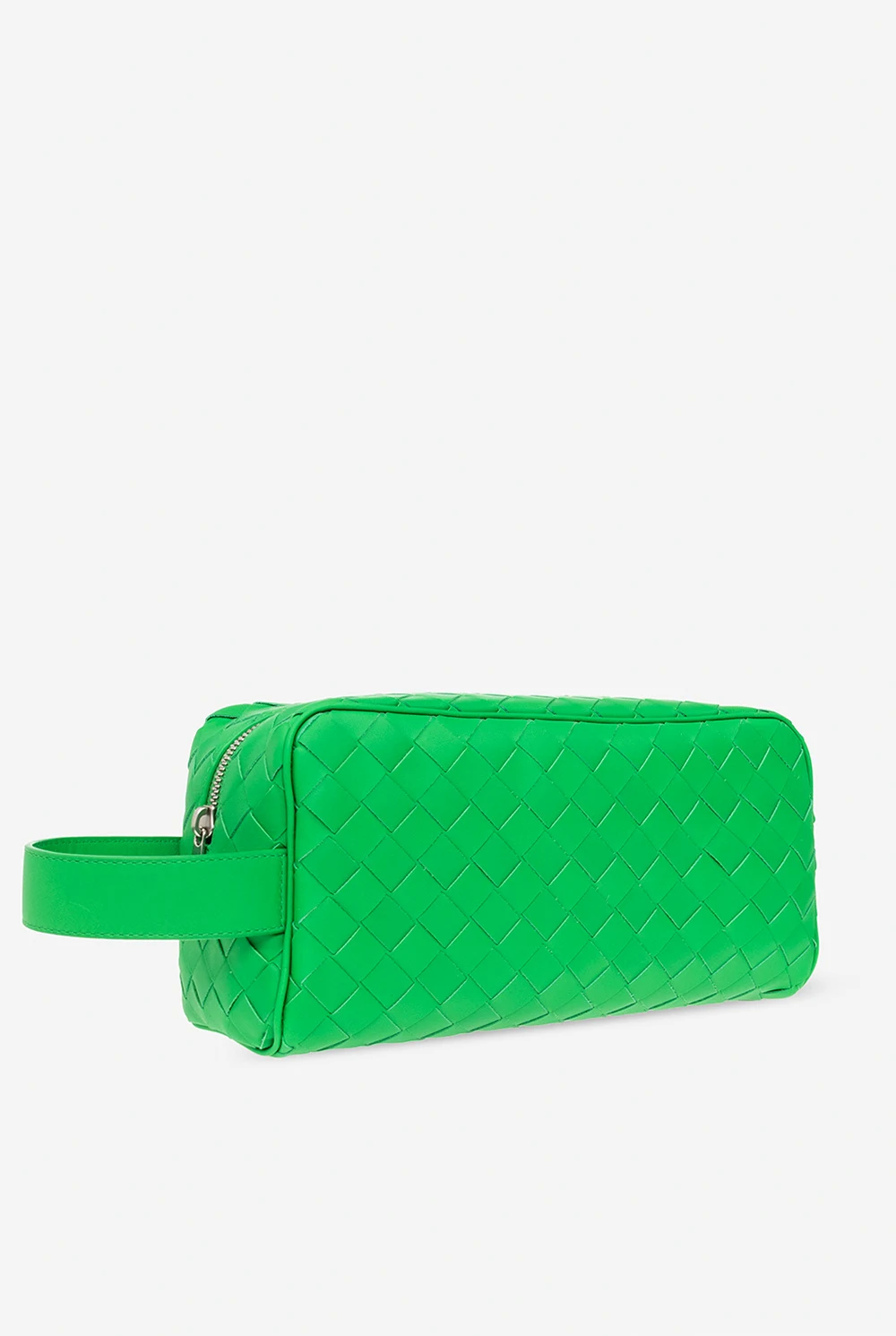 Zielona kosmetyczka Bottega Veneta. Wykonana ze skóry cielęcej. Zapinana na zamek. Charakterystyczna dla marki plecionka ‘Intrecciato’. Półokrągła rączka. Wewnątrz komora.