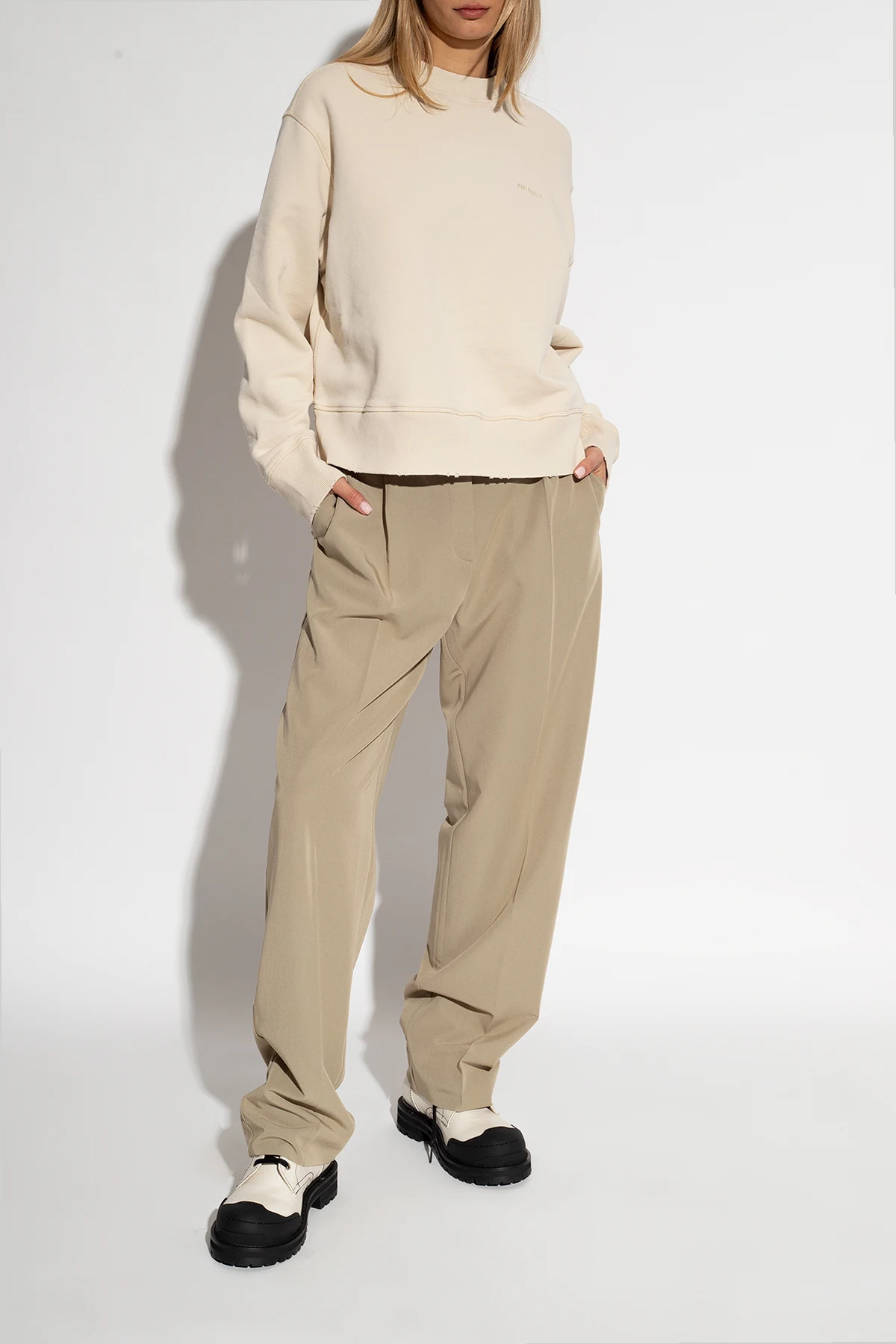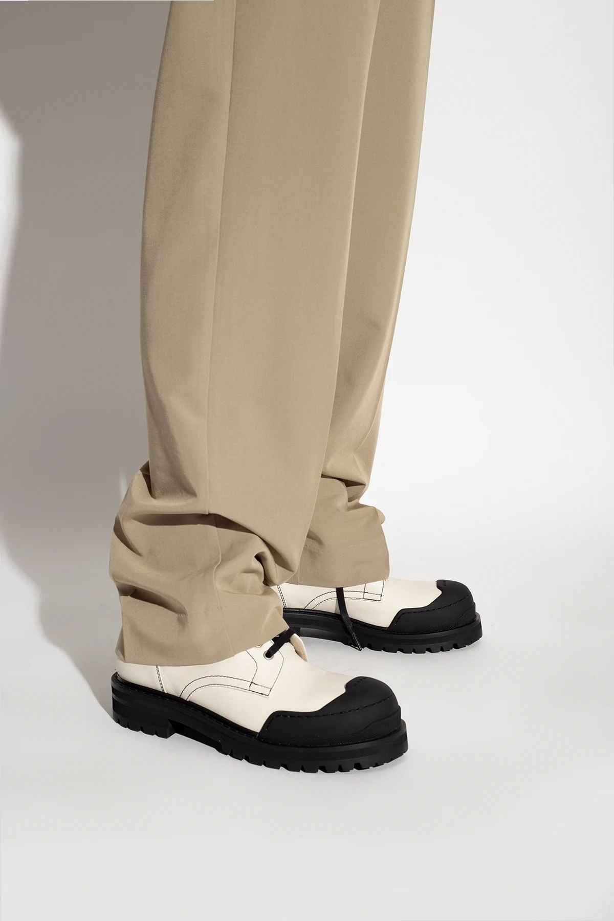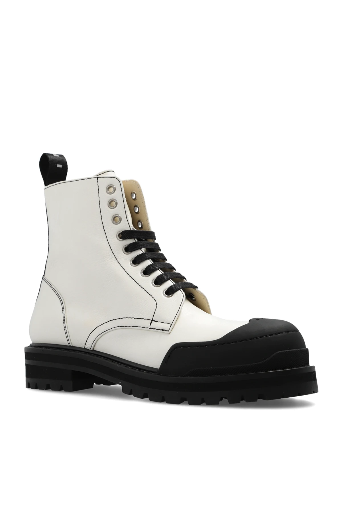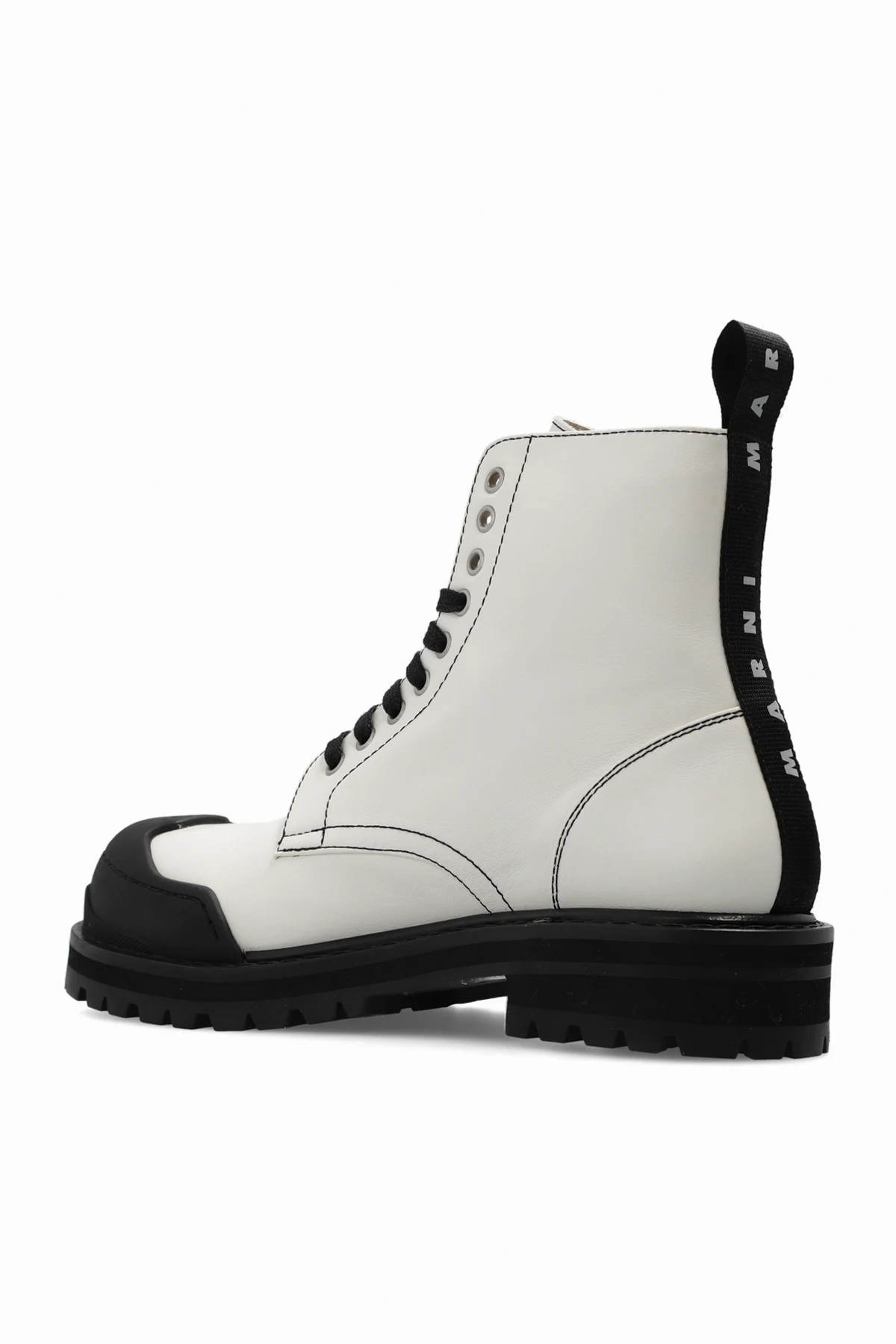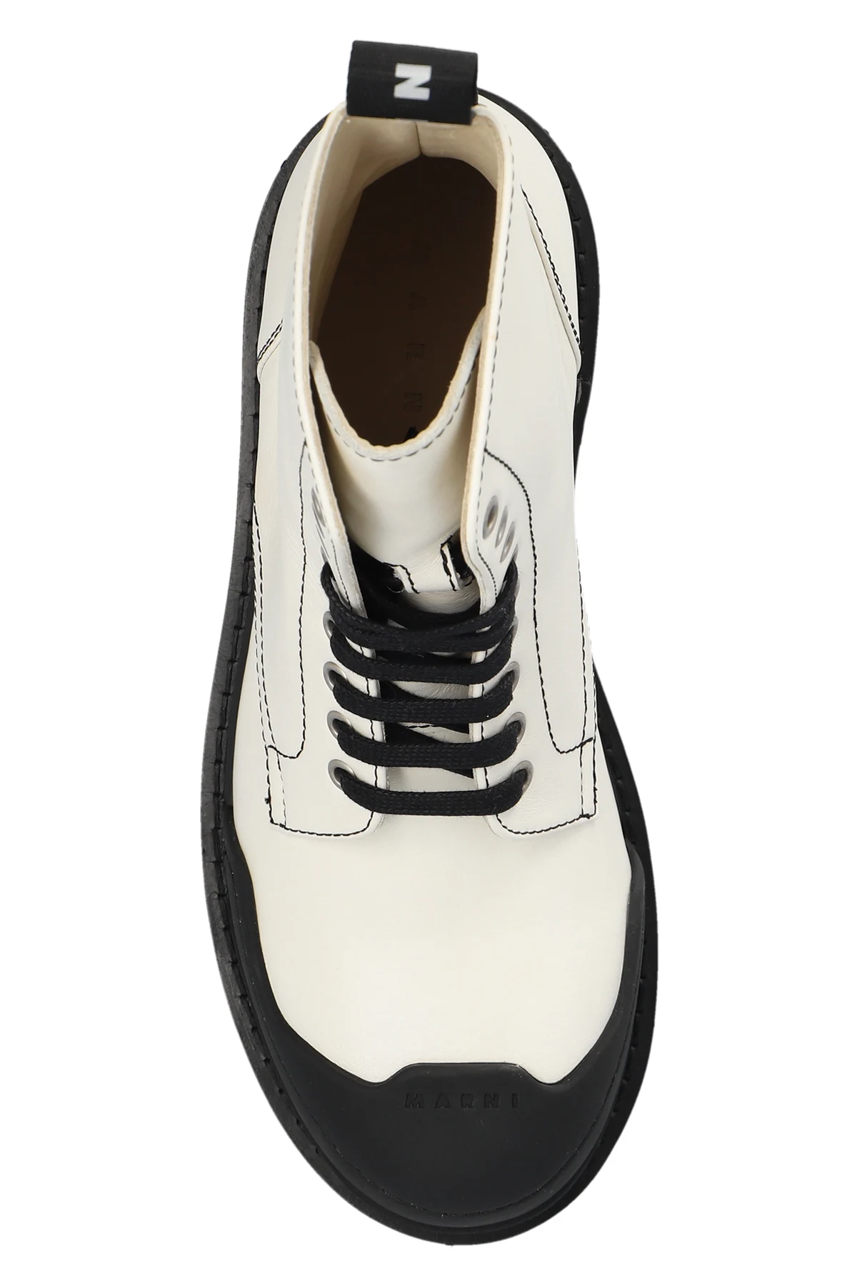 Kremowo-czarne, sznurowane botki Marni. Wykonane ze skóry. Z tyłu pasek ozdobiony odblaskowym logo. Czarna, gumowa podeszwa.