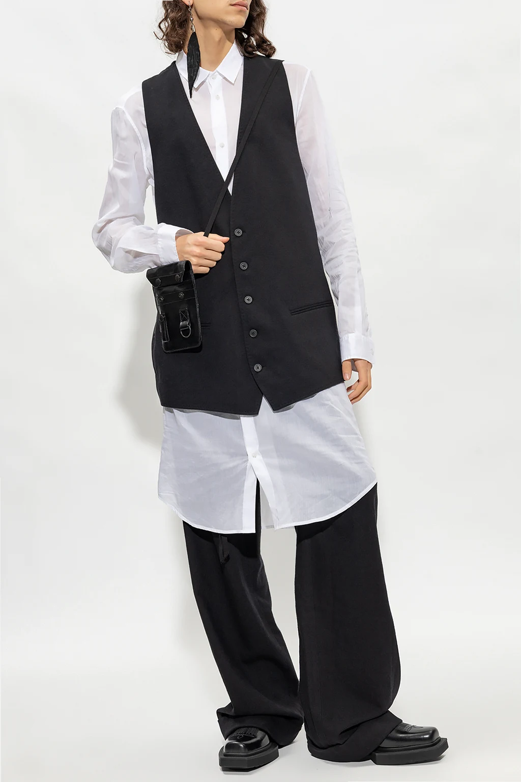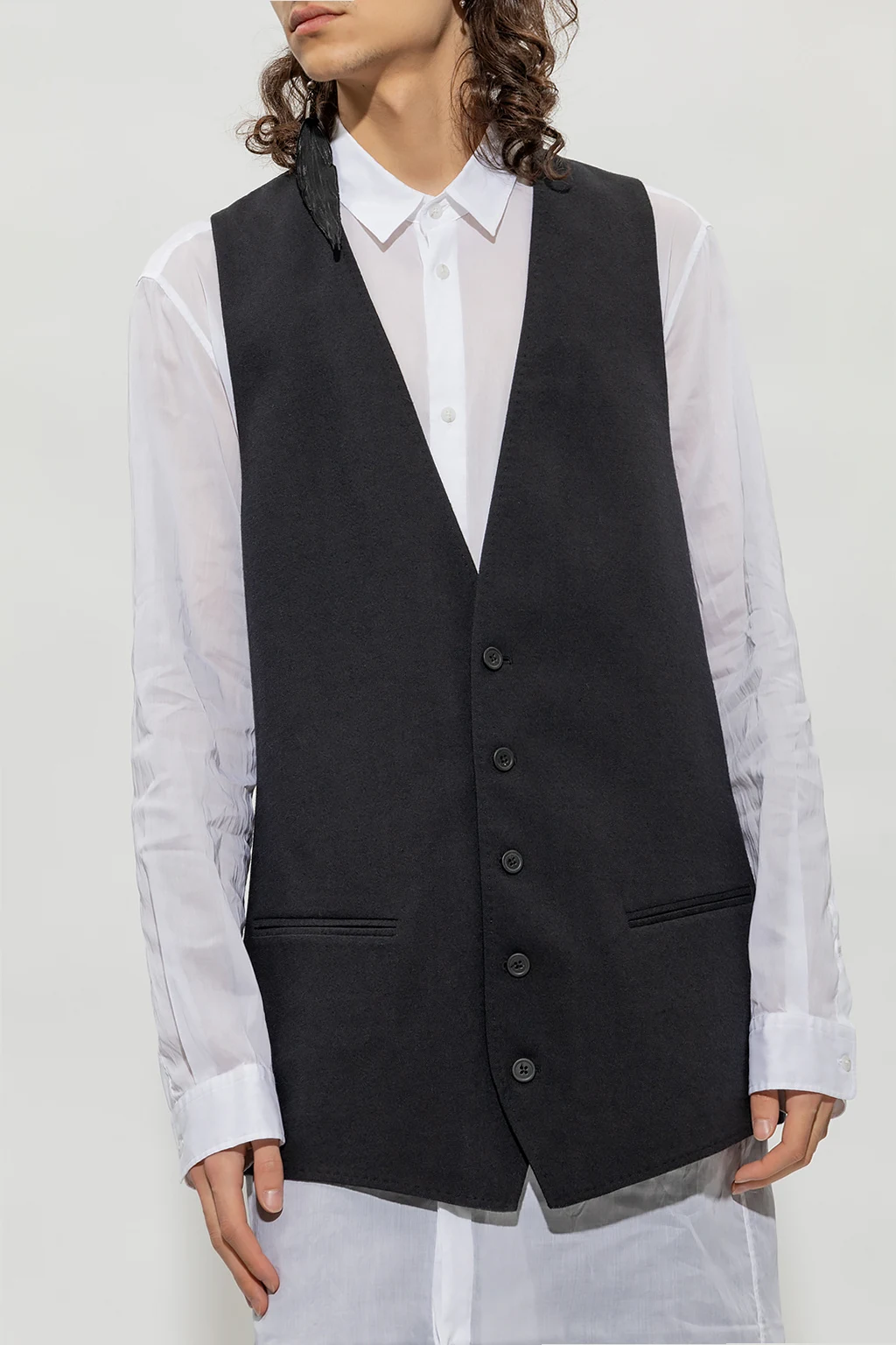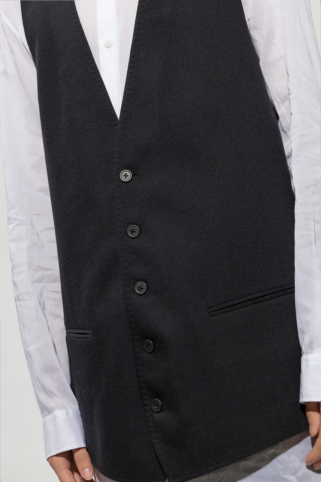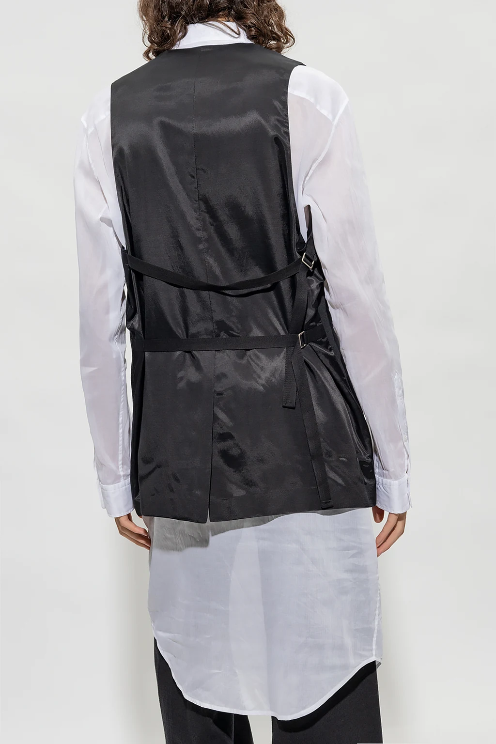 Czarna kamizelka, model ‘Pierre’ Ann Demeulemeester. Wykonana z wełny. Zapinana na guziki. Z przodu dwie wsuwane kieszenie. Z tyłu regulowane paski i pojedyncze rozcięcie.