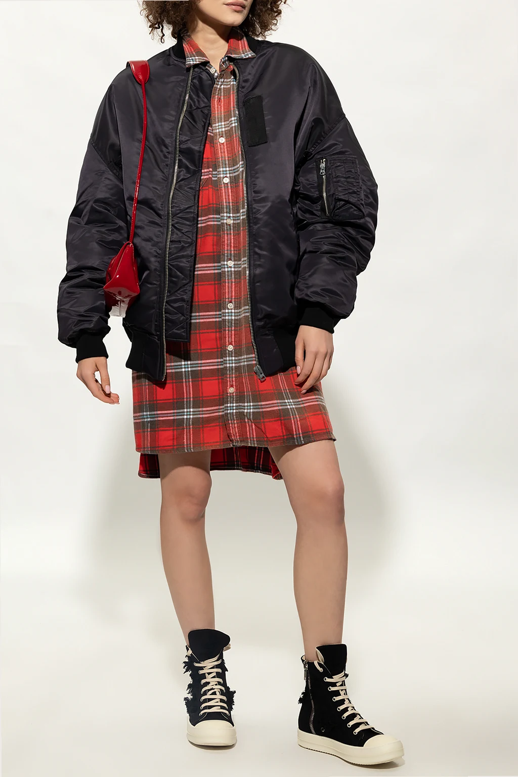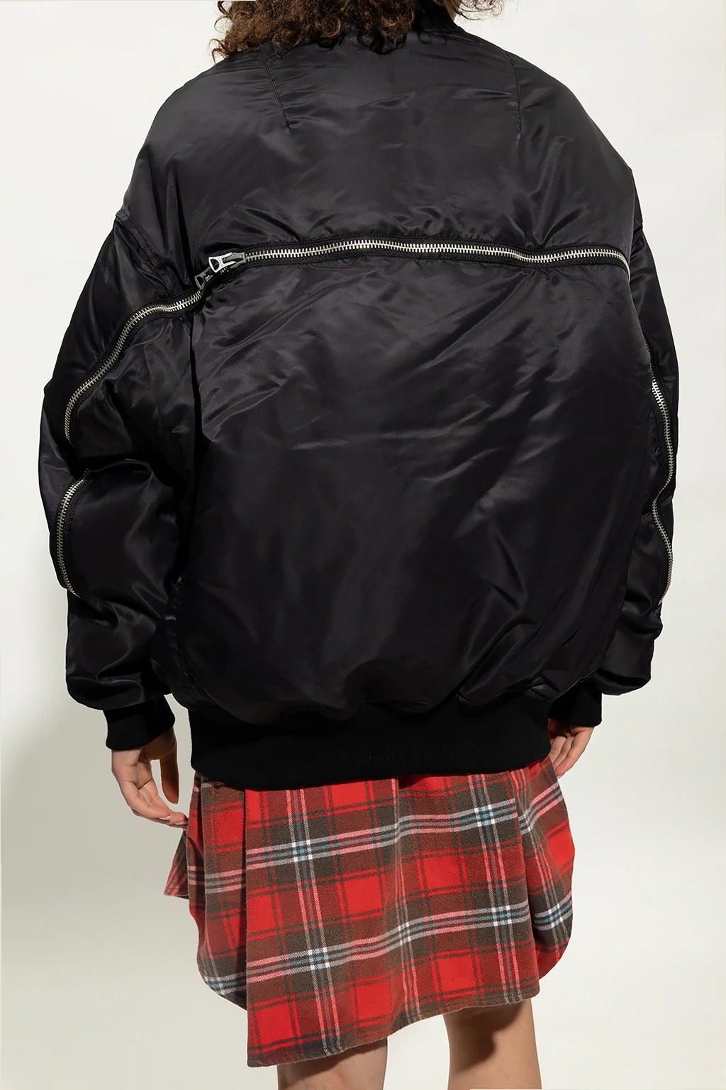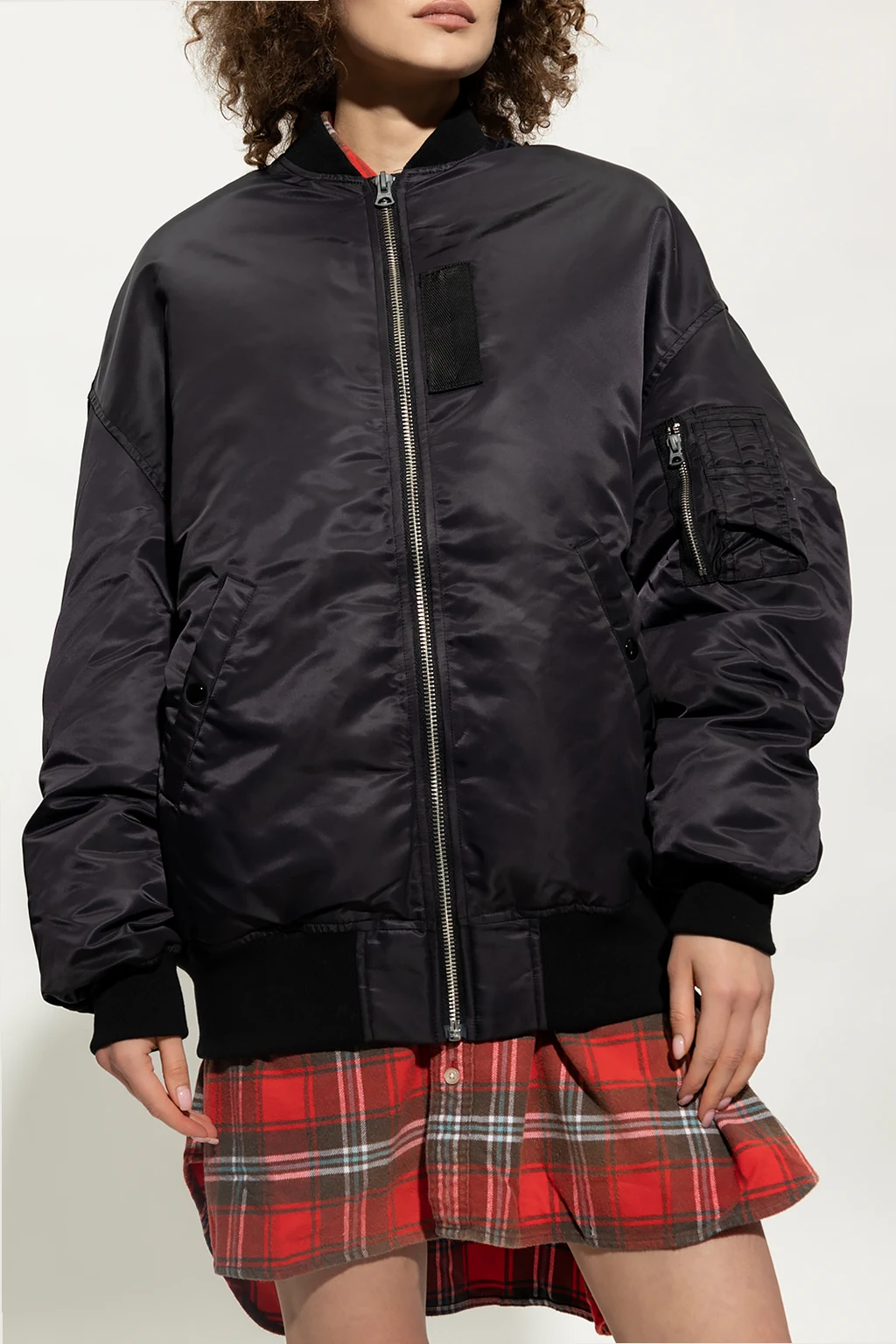 Czarna, puchowa kurtka typu ‘bomber’ R13. Wykonana z tkaniny technicznej o satynowym wykończeniu. Zapinana na zamek. Z przodu dekoracyjne zatrzaski i rypsowy pasek. Z tyłu oraz na ramionach wszyty zamek. Dwie kieszenie z zapięciem na zatrzaski z przodu, liczne kieszenie na ramieniu. Kołnierz, długie rękawy oraz dół wykończone ściągaczem.
