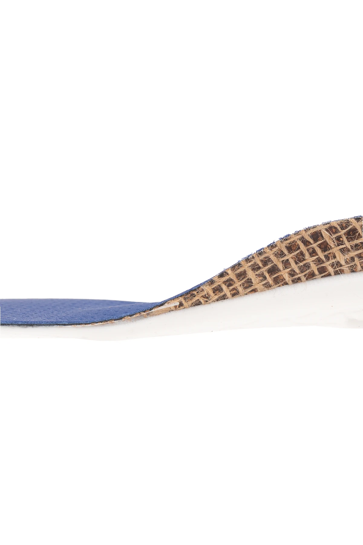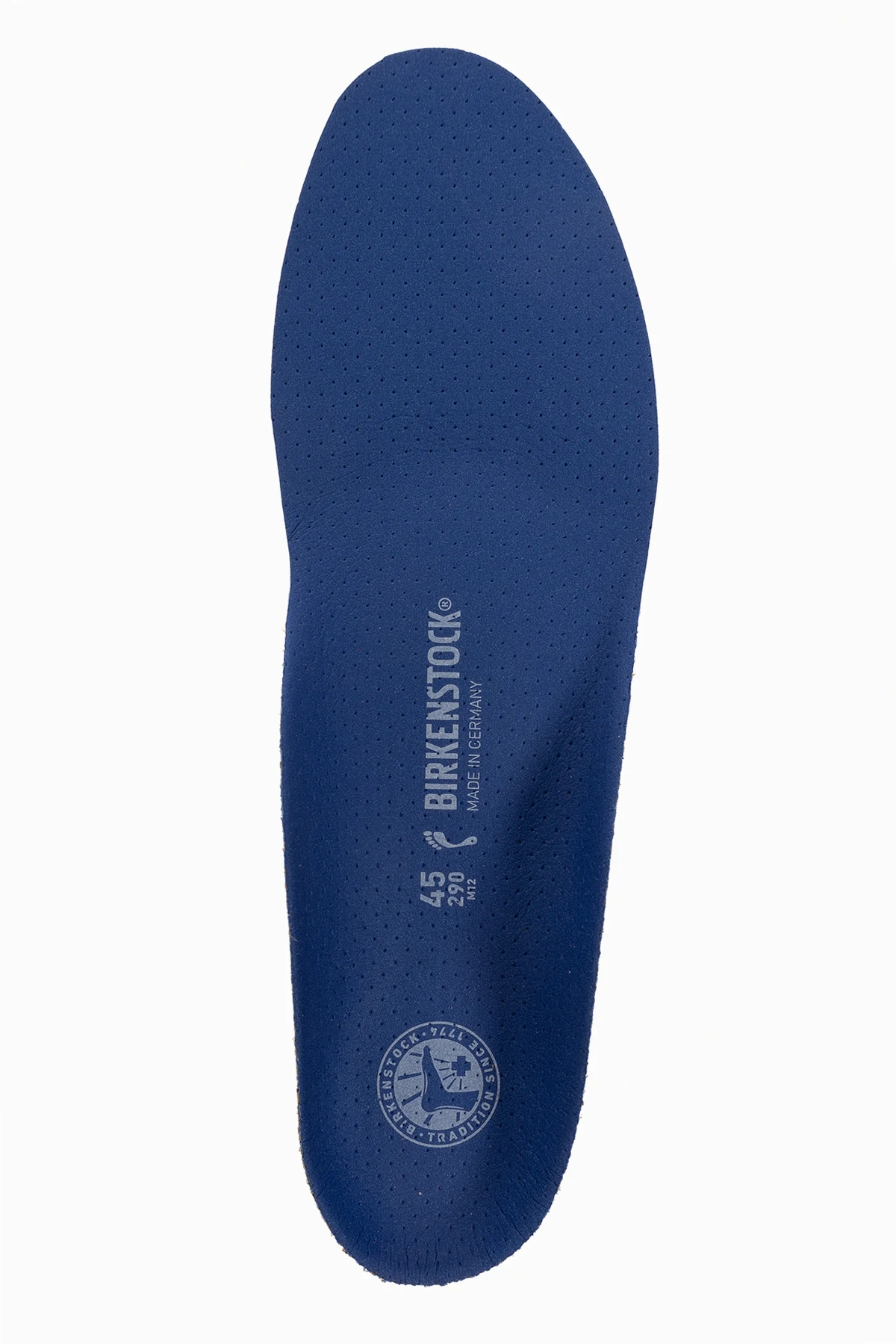 Niebiesko-biała, anatomicznie ukształtowana wkładka o zwężanej szerokości, model ‘Blue Footbed’ Birkenstock. Wykonana z mikrofibry i naturalnego korka, przeznaczona do biznesowego, codziennego i sportowego obuwia bez obcasa. Wielowarstwowa konstrukcja z warstwą pochłaniającą wilgoć i podwyższeniem w strefie pięty zapewniającym doskonałą stabilność i wygodę. Dodatkowo stanowi ona naturalne podparcie dla sklepienia stopy.