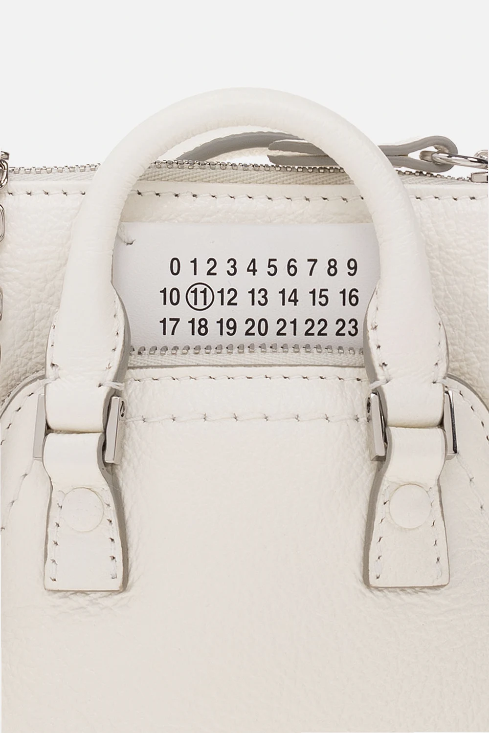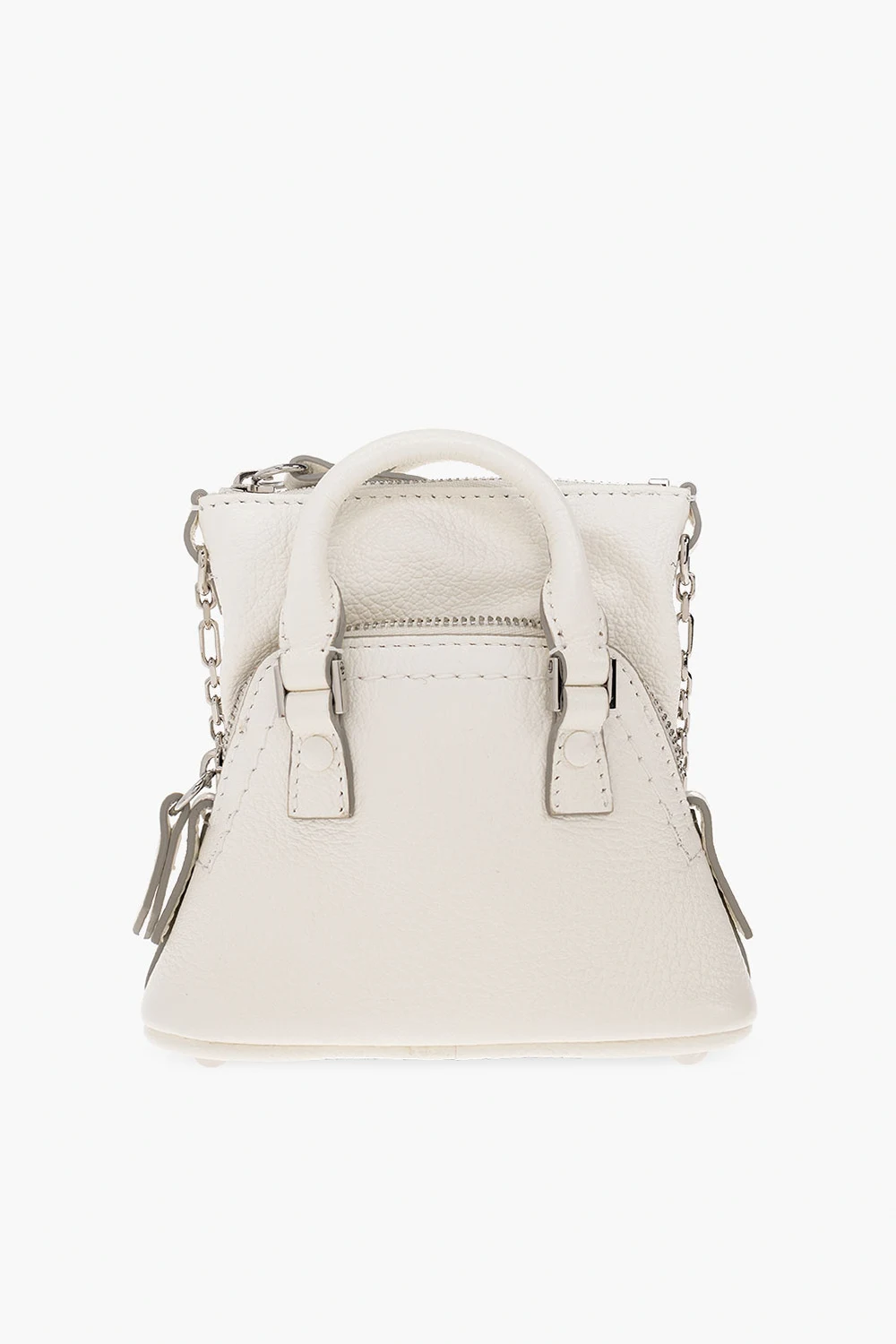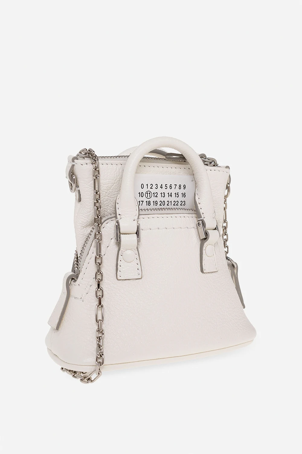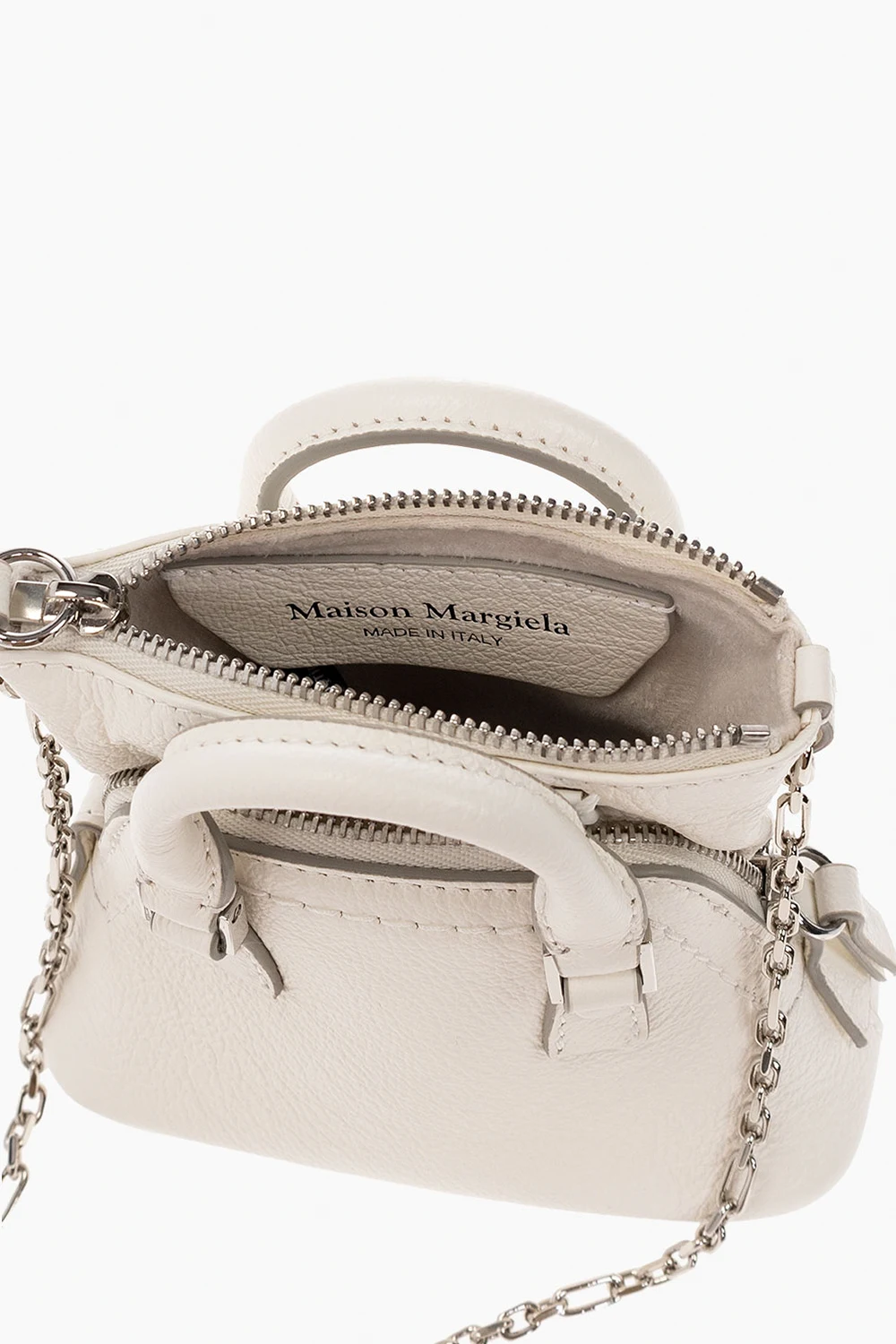 Biała torba na ramię, model ‘5AC Baby’ Maison Margiela. Wykonana ze skóry. Zamykana na zamek. Z przodu biała, charakterystyczna naszywka z logo. Dwie półokrągłe rączki. Długi łańcuch przepleciony skórą. Wewnątrz komora. Metalowe elementy w kolorze srebrnym.