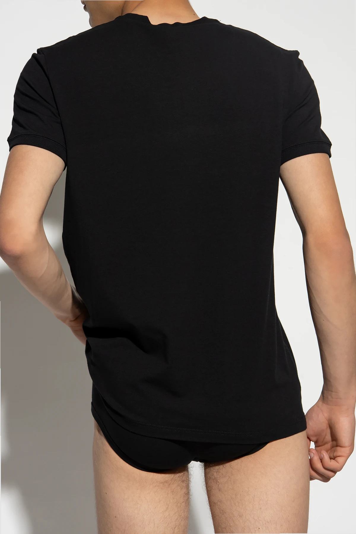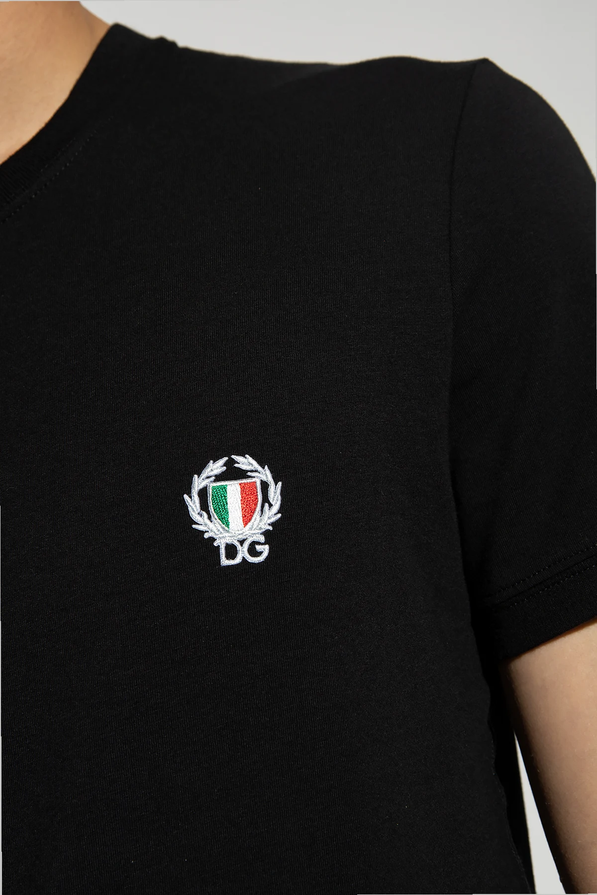 Czarny t-shirt Dolce & Gabbana. Wykonany z bawełny. Ozdobiony z przodu kolorową naszywką z motywem liści laurowych, herbu oraz logo. Okrągły dekolt wykończony ściągaczem, krótkie rękawy.