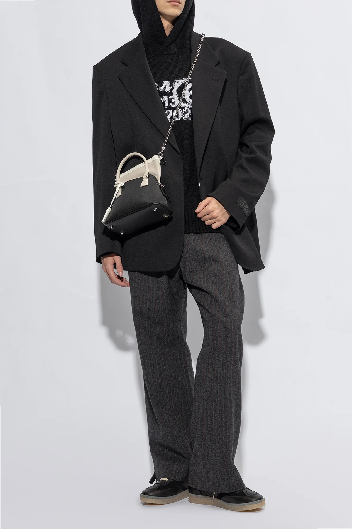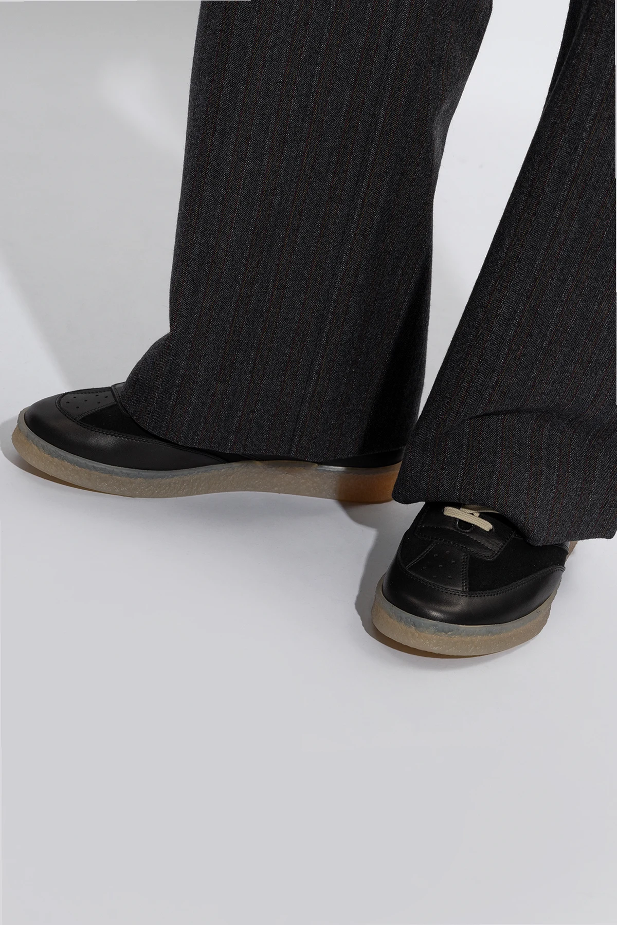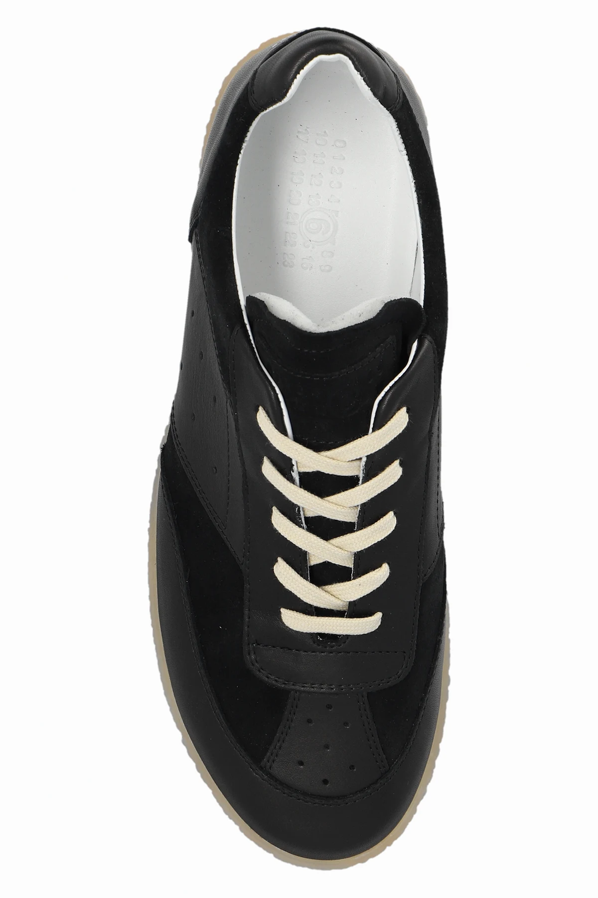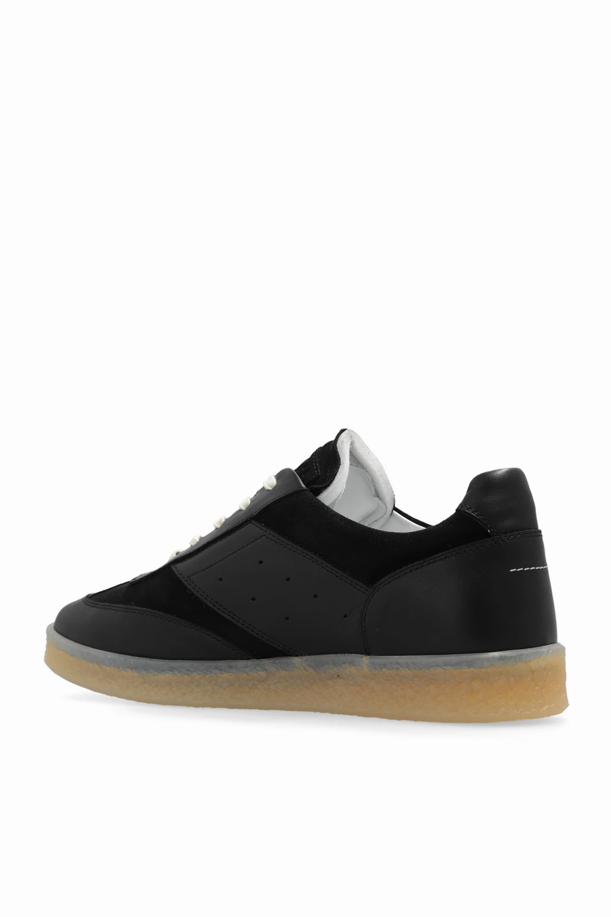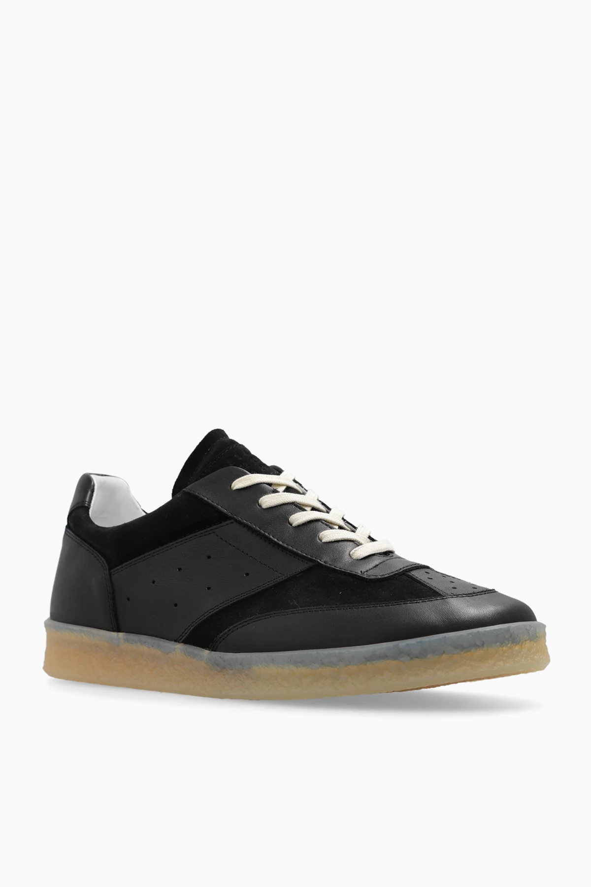 Czarne, sznurowane buty sportowe MM6 Maison Margiela. Wykonane ze skóry i zamszu. Po bokach perforacja. Z tyłu charakterystyczne białe przeszycie. Jasnobeżowa, lekko transparentna, gumowa podeszwa.
