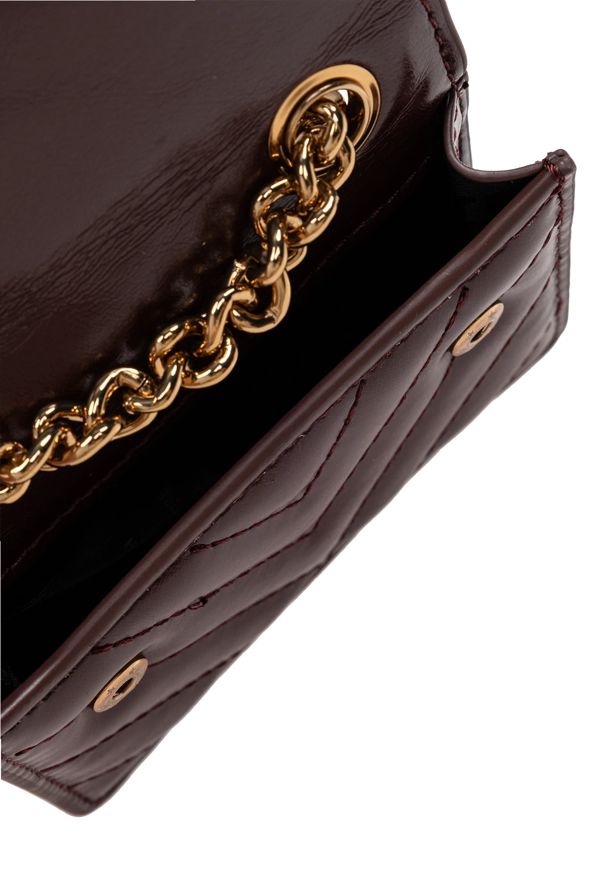 Torba wykonana jest z pikowanej skóry, której wzór przypomina romby, nadając jej niepowtarzalnego charakteru. Kompaktowy, prostokątny kształt sprawia, że jest poręczna i praktyczna, doskonała do noszenia na ramieniu dzięki złotemu łańcuszkowi pełniącemu funkcję paska.