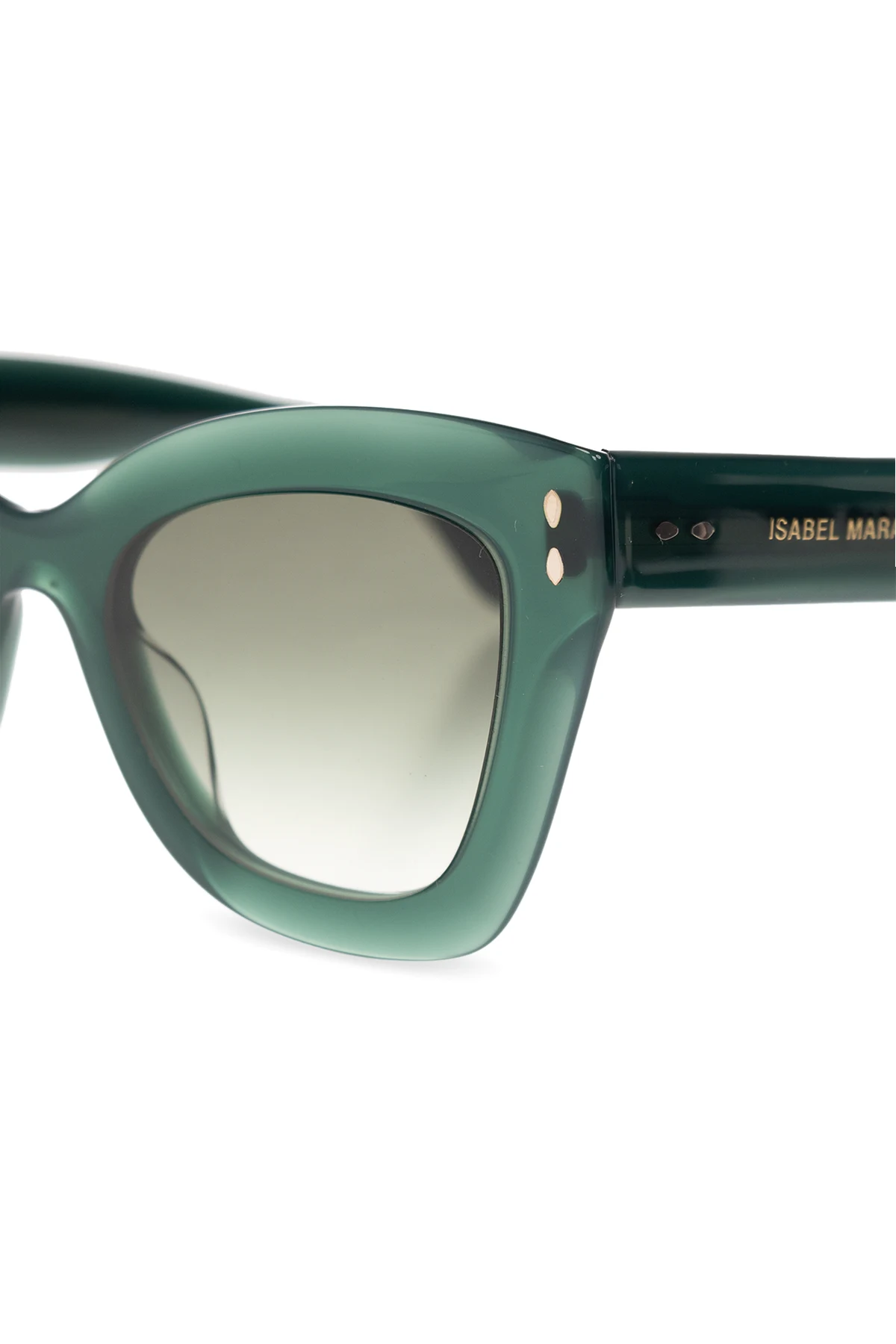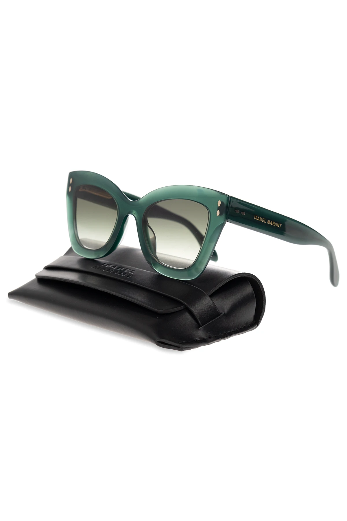 Zielone okulary przeciwsłoneczne Isabel Marant. Z boku ozdobione logo w kolorze złotym. Zielone, gradientowe soczewki ze 100% ochroną przez promieniowaniem UV. Dołączone etui.