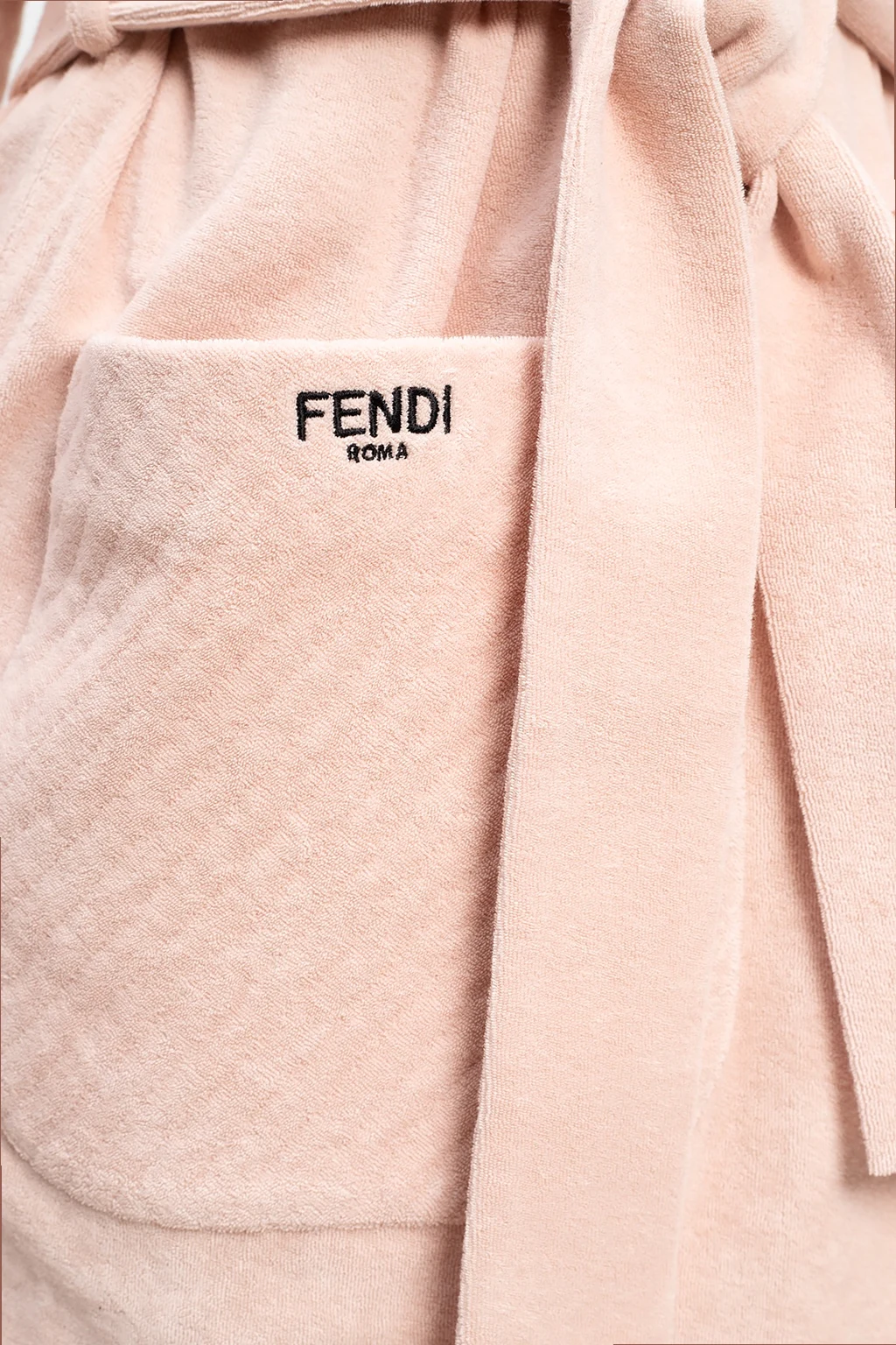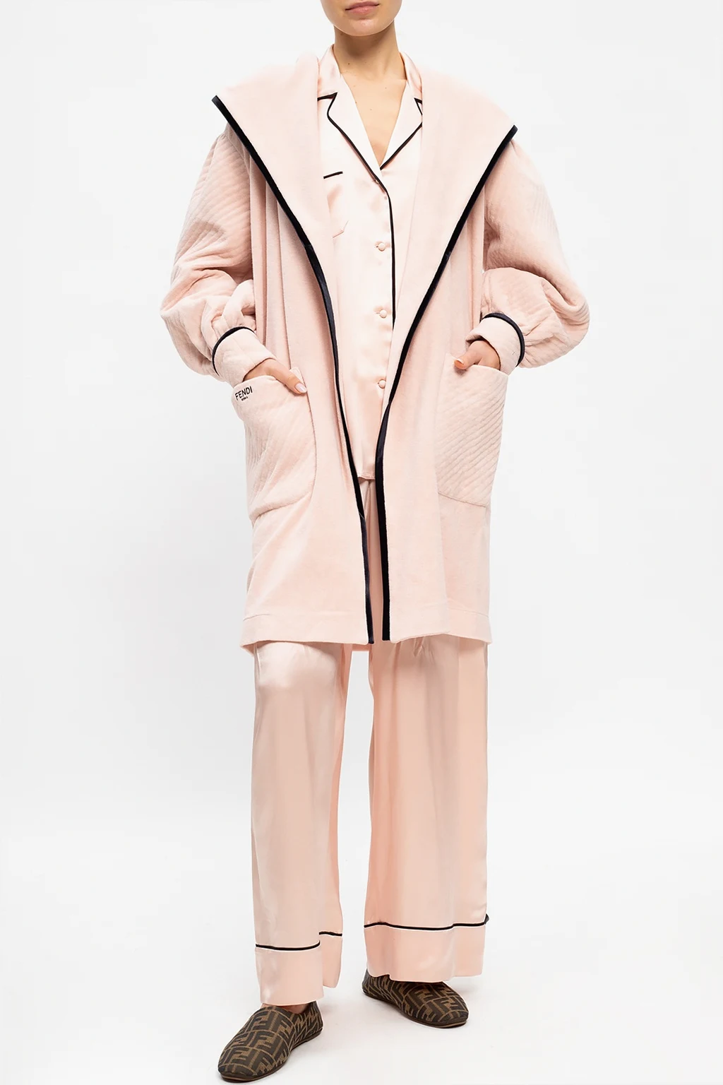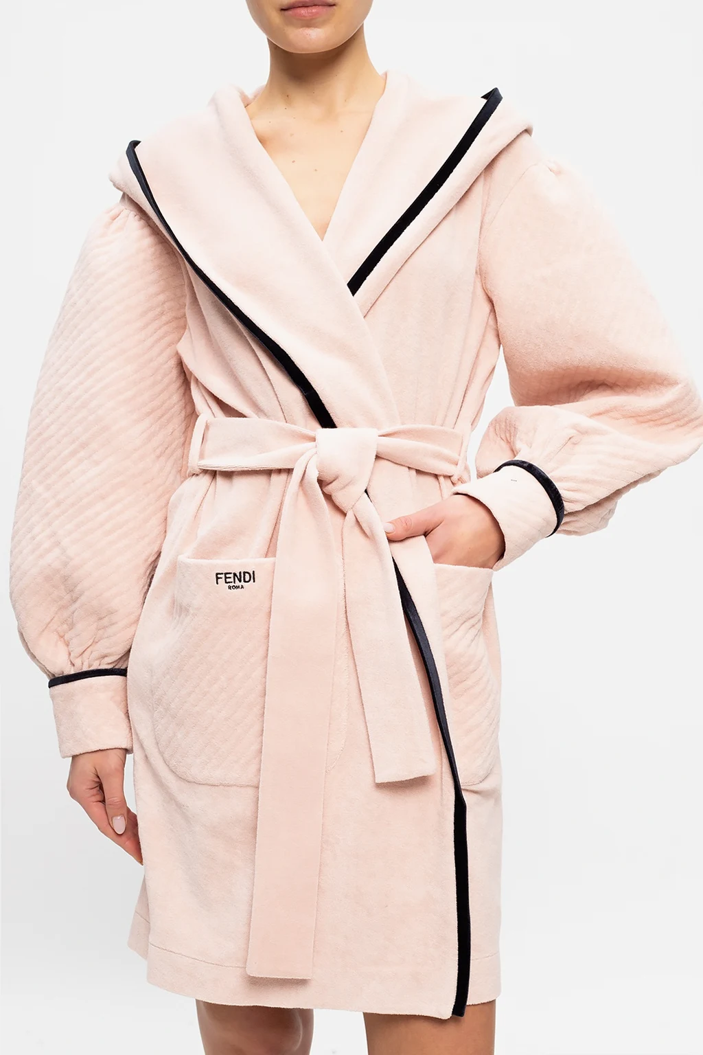 Pudroworóżowo-czarny, bawełniany szlafrok z kapturem Fendi. W talii wiązany paskiem. Długie rękawy. Z przodu dwie wsuwane kieszenie na jednej wyszyte logo.