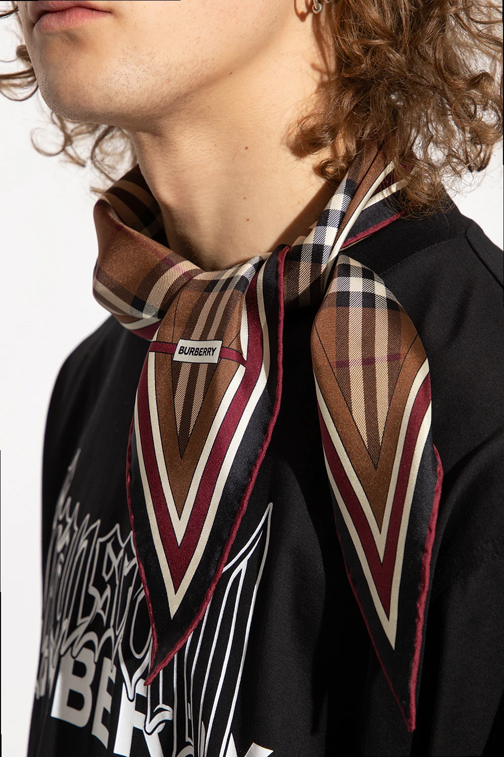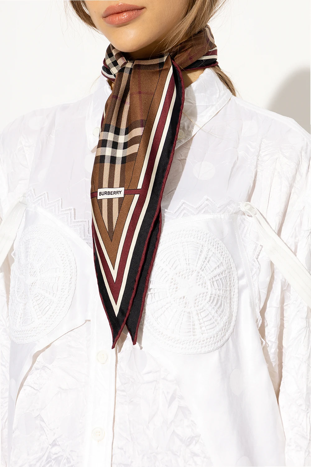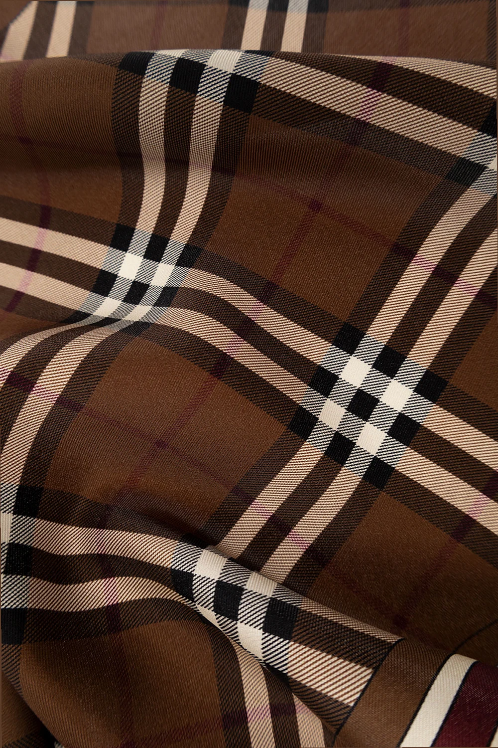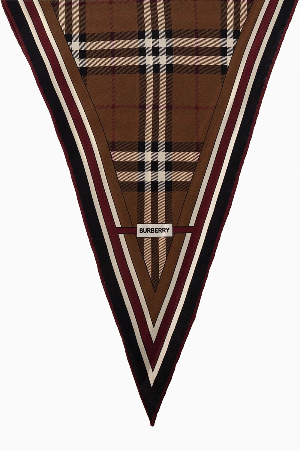 Kolorowy, jedwabny szal w kształcie rombu Burberry. Ozdobiony wzorem w charakterystyczną kratę.