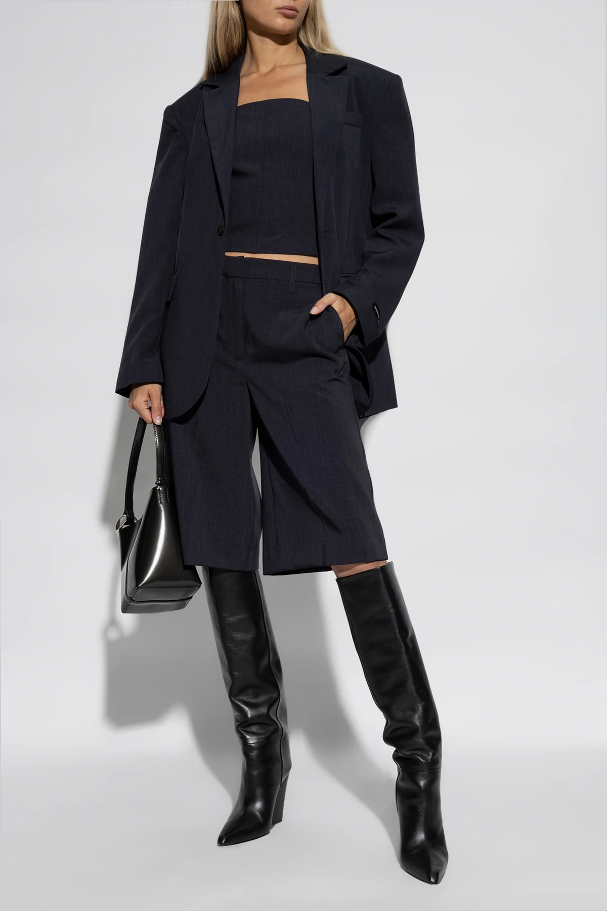 Na jednym ze zdjęć marynarka jest zestawiona z dopasowanymi szortami i topem, co nadaje jej nowoczesnego, modnego charakteru. Stylizacja uzupełniona jest o wysokie czarne kozaki oraz elegancką torebkę, co podkreśla jej współczesny wygląd.
