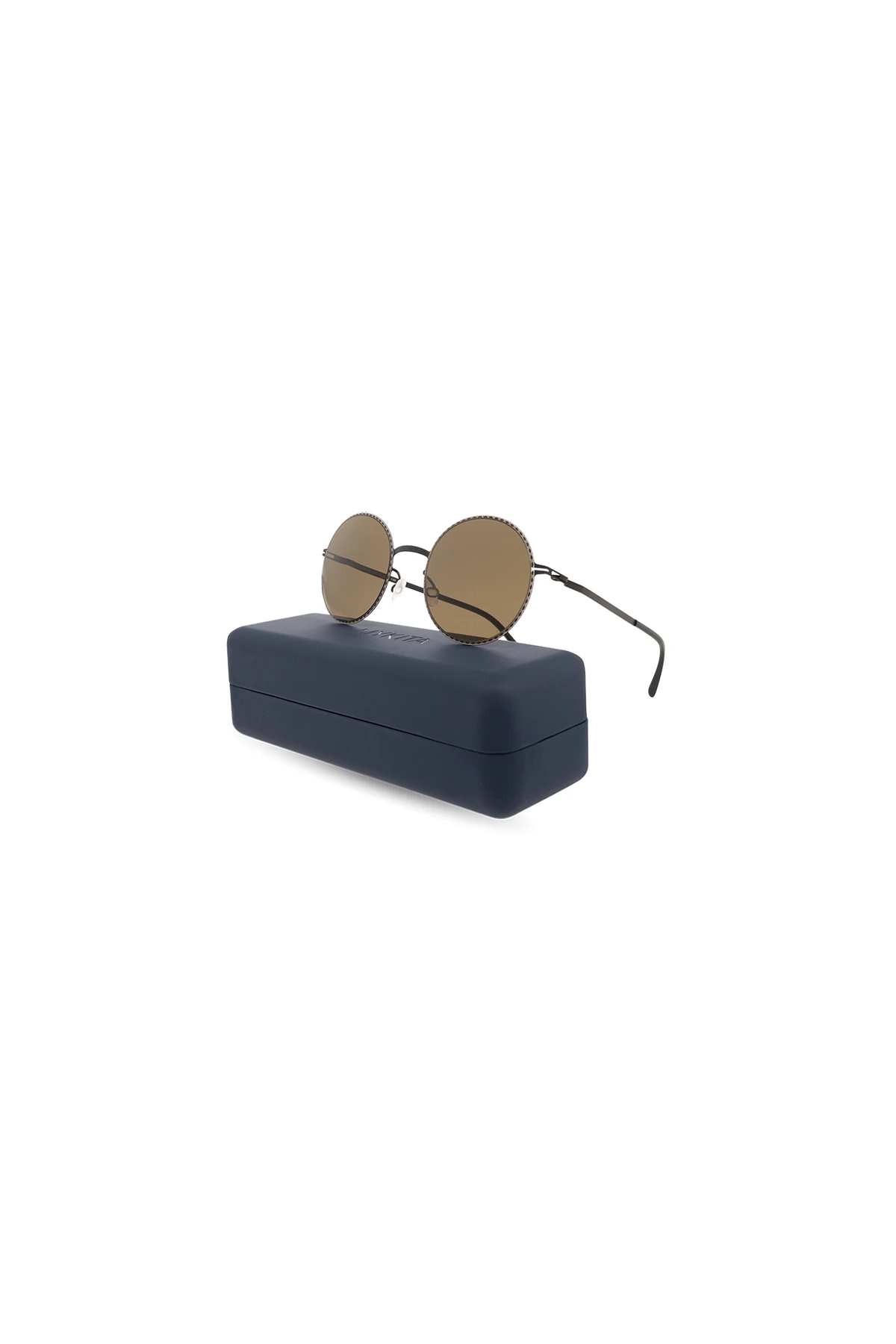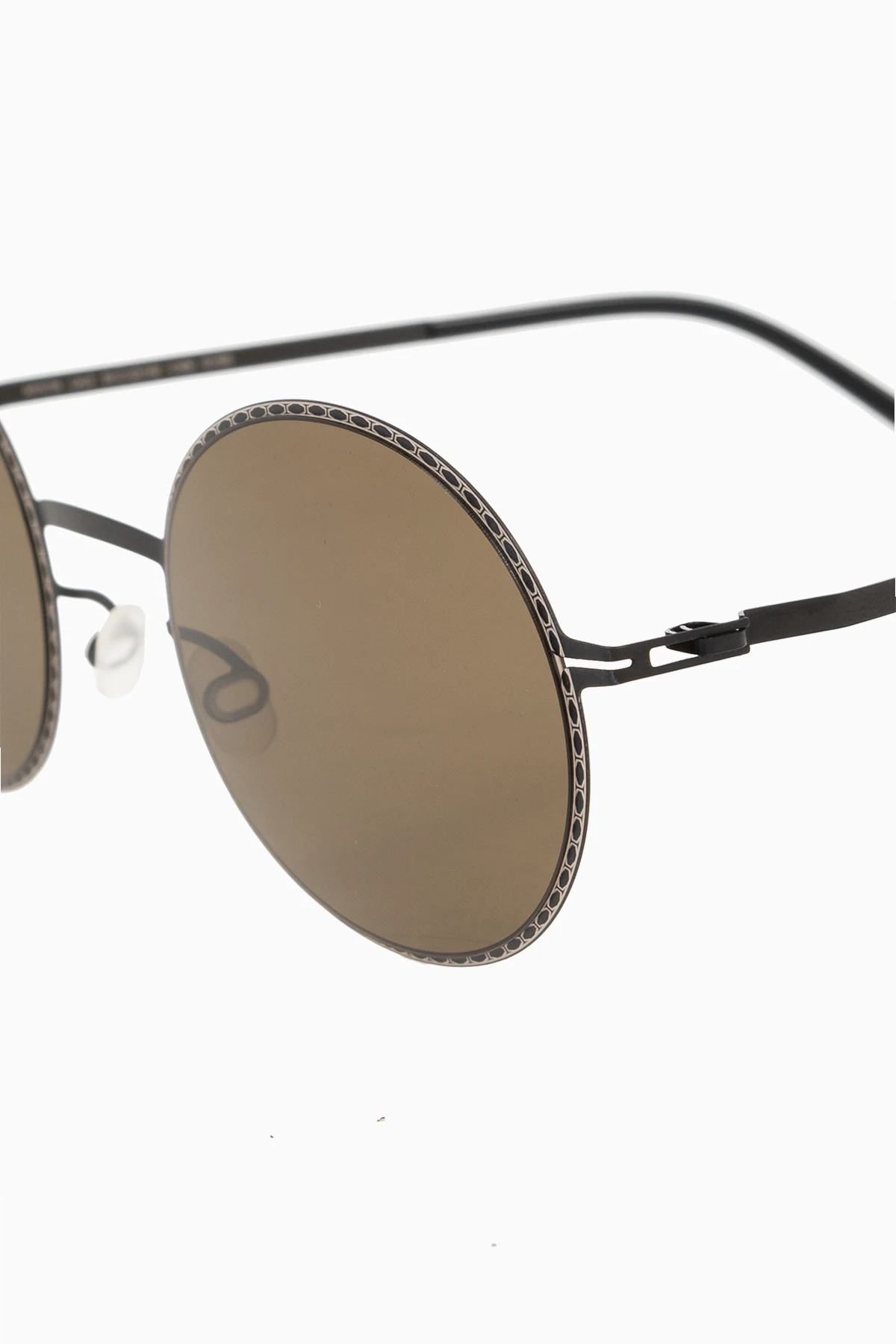 Czarne okulary przeciwsłoneczne, model ‘Lale’ Mykita. Wykonane z lekkiej stali nierdzewnej. Okrągłe oprawki ozdobione kremowo-szarym wzorem. Opatentowany zawias spiralny. Zielone soczewki Raw Green Solid ze 100% ochroną przed promieniowaniem UV. Ręcznie wykonane w Berlinie. Dołączone etui.