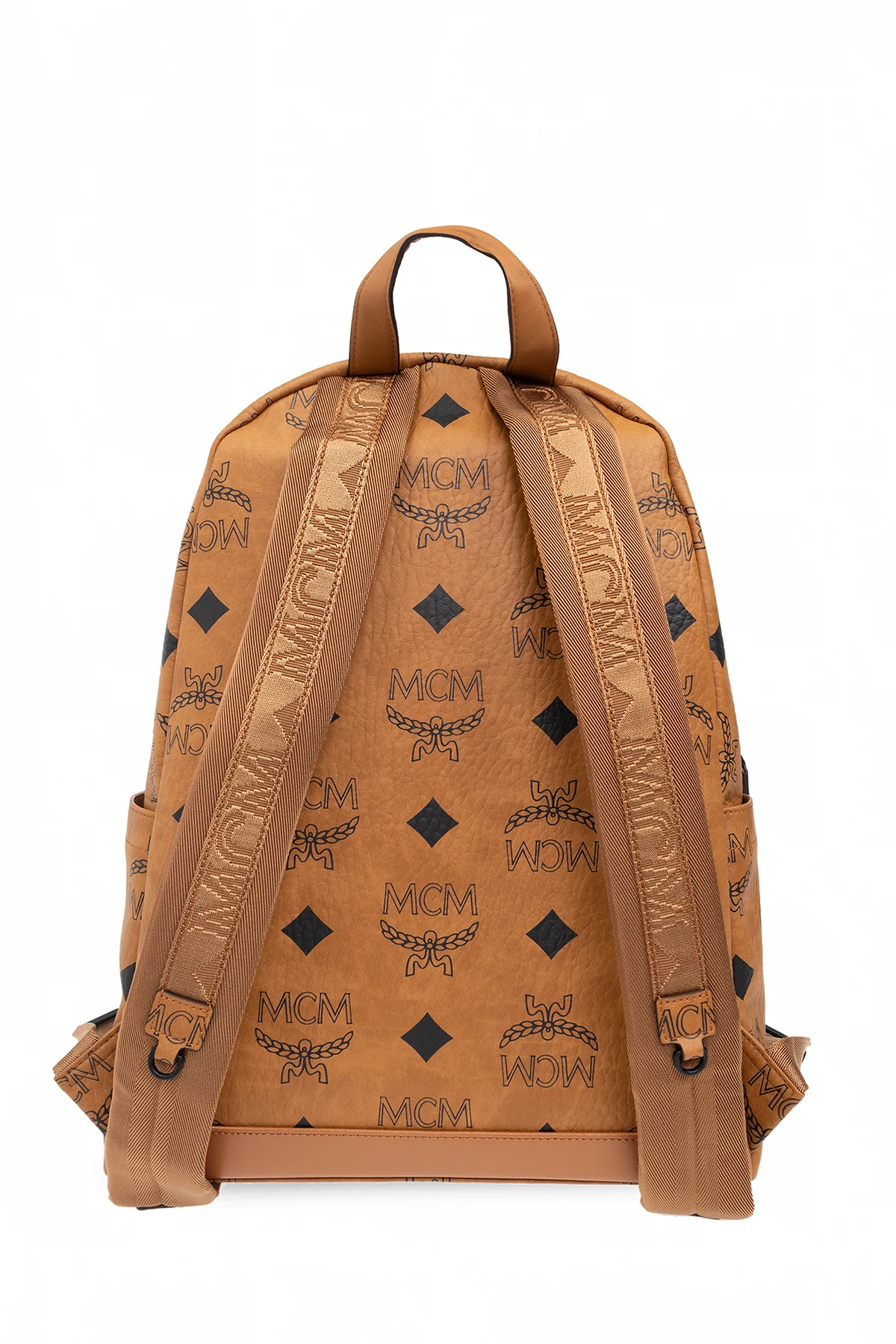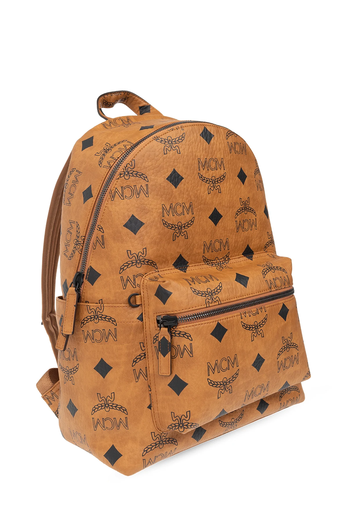 Brązowy plecak, model ‘Stark’ MCM. Wykonany z charakterystycznego płótna powlekanego ozdobionego wzorem z monogramem ‘Visetos’ w kolorze czarnym. Wykończony skórą. Zamykany na dwubiegunowy zamek. Z przodu kieszeń zamykana na zamek. Po bokach wsuwana kieszeń. Półokrągła rączka. Regulowane szelki. Wewnątrz komora i dwie wsuwane kieszenie, jedna zmieści laptop 13-calowy.