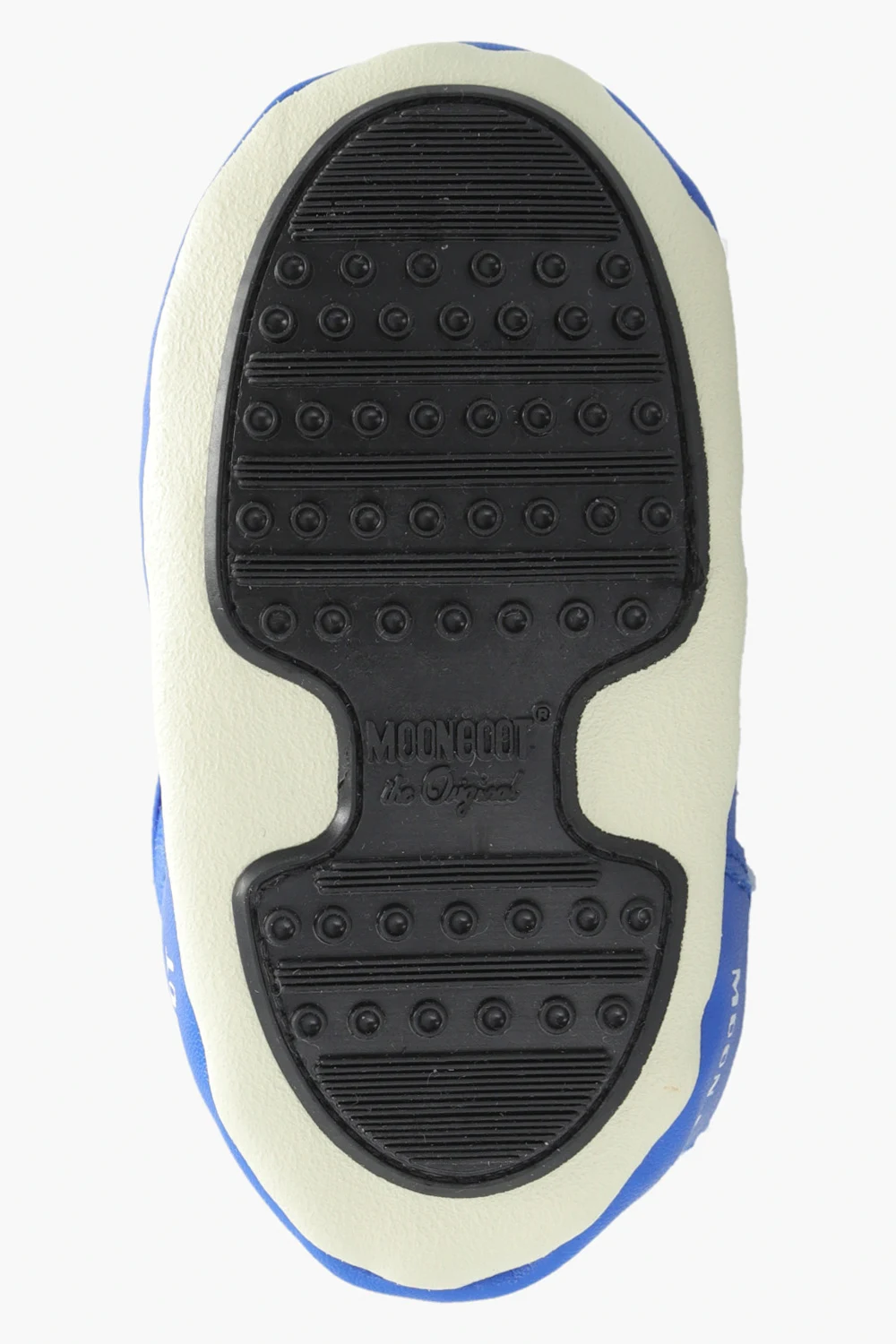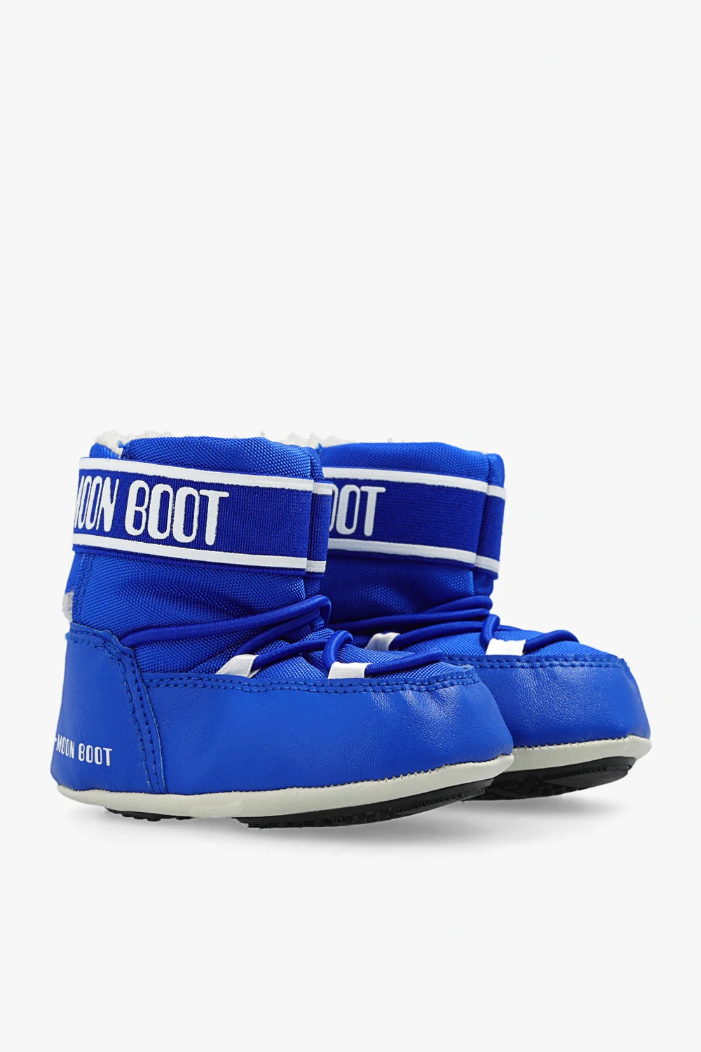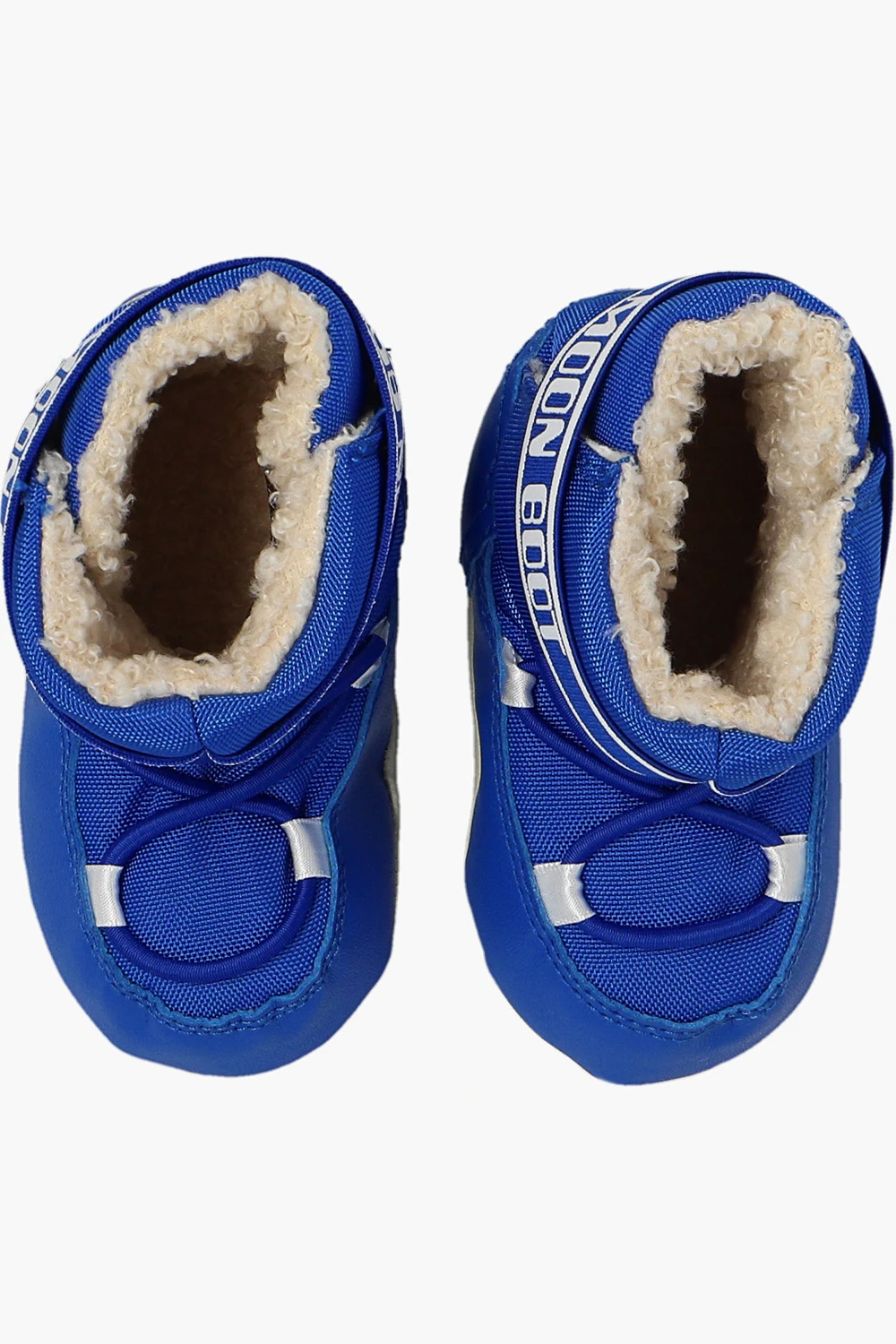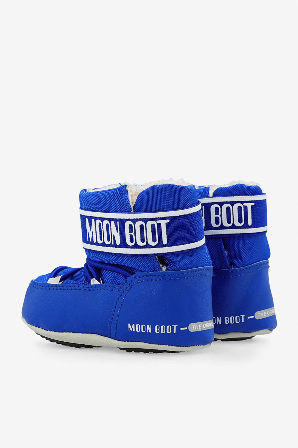 Ciemnoniebieskie śniegowce, model 'Crib’ Moon Boot. Wykonane z wodoodpornego materiału. Ozdobione logo i elastyczną taśma z nadrukowanym białym logo. Z przodu elastyczne troki. Warstwa wewnętrzna wykończona sztucznym futrem. Kremowa, skórzana podeszwa wykończona czarną gumą.