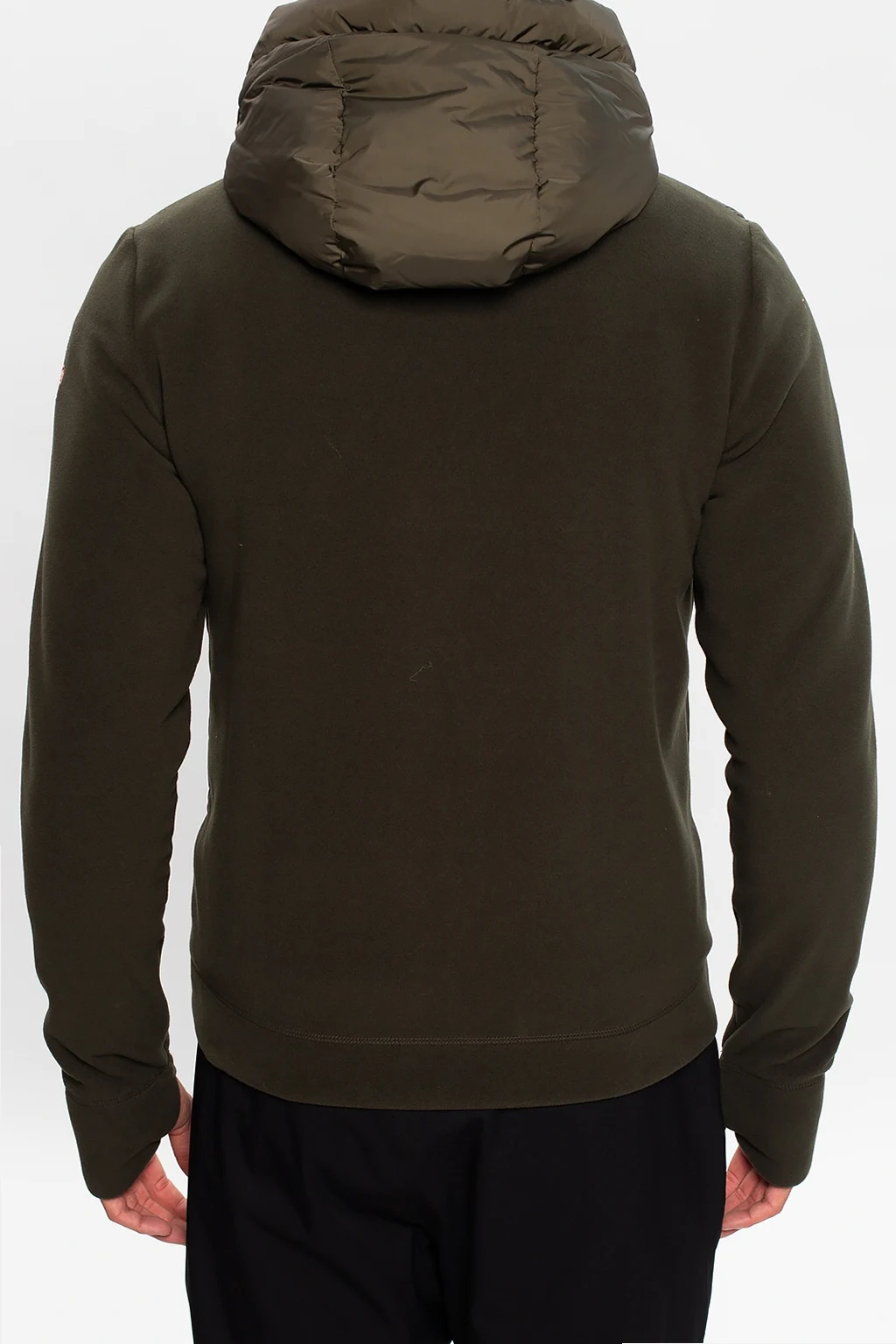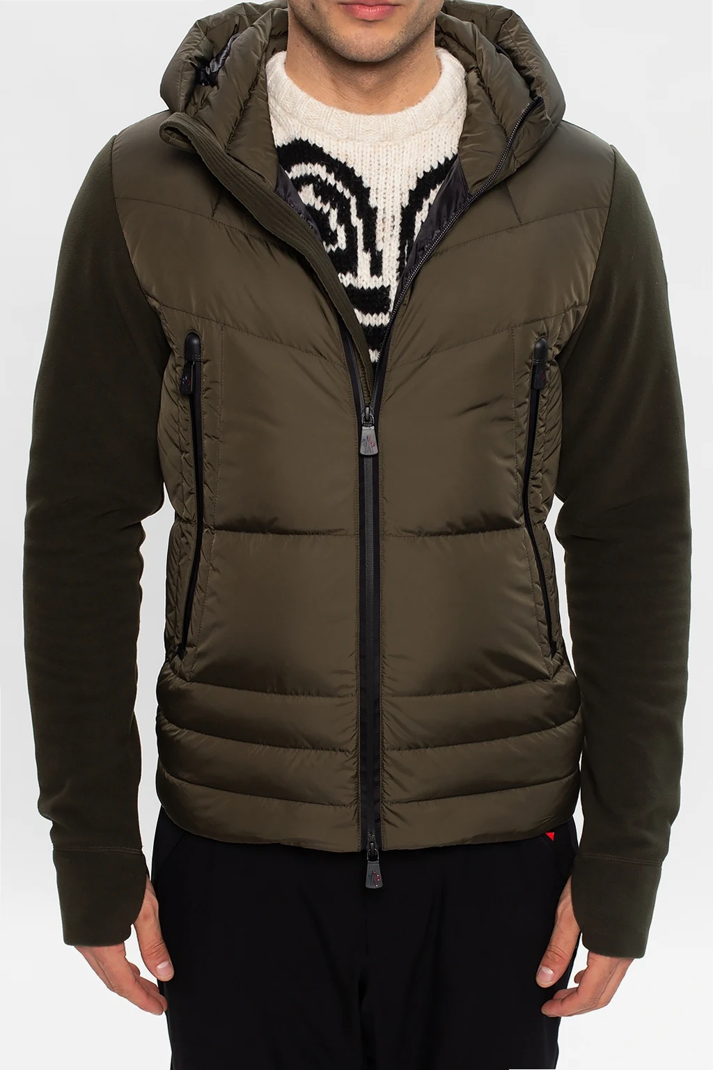 Zielona bluza z pikowanym przodem Moncler Grenoble. Zapinana na dwubiegunowy zamek. Kaptur ściągany trokami. Z przodu dwie kieszenie zapinane na zamek. Długie rękawy, na jednym kolorowa naszywka z logo.