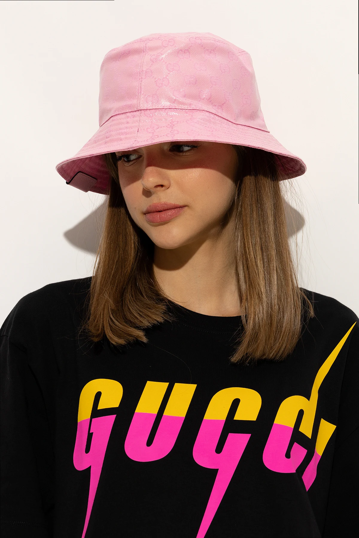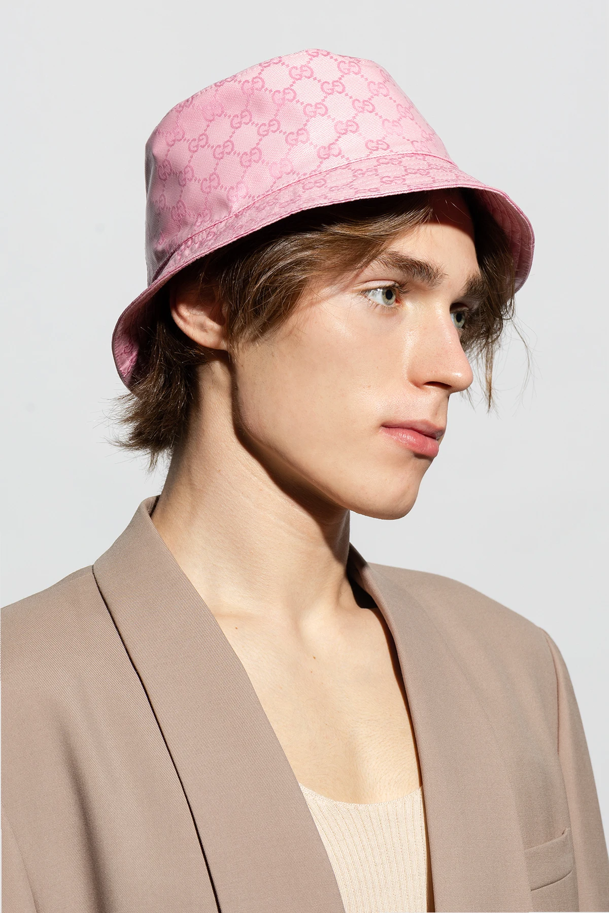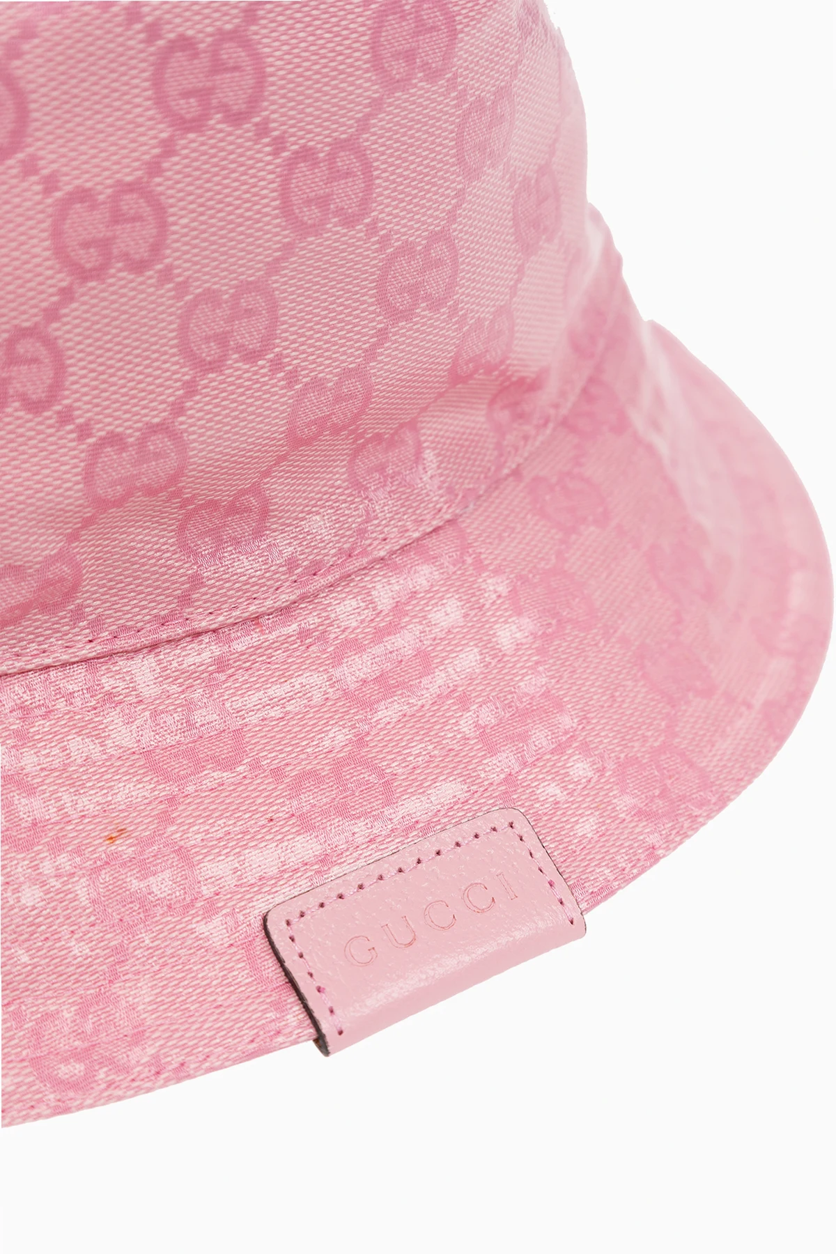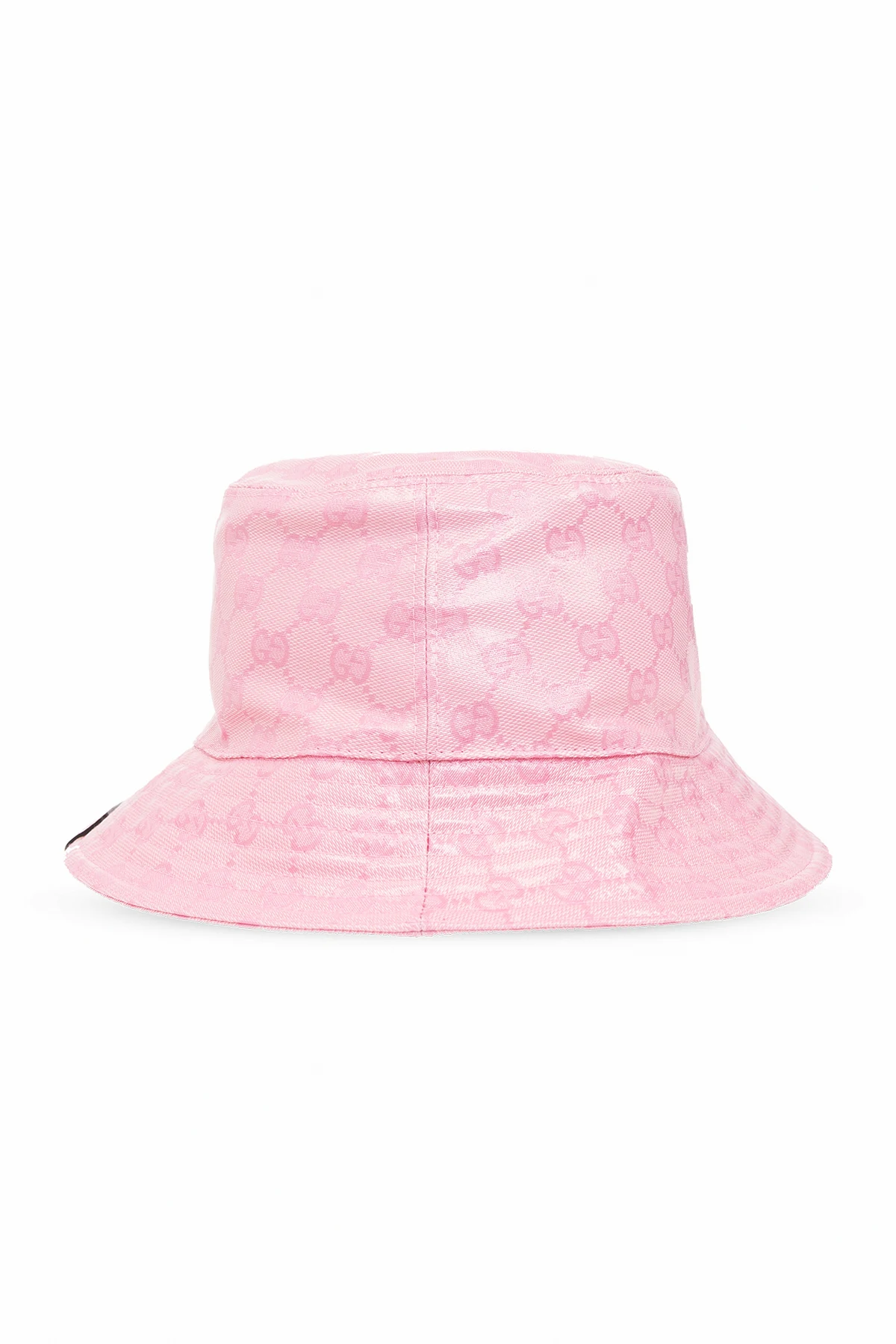 Różowy kapelusz Gucci. Wykonany z płótna ‘GG Crystal’. Ozdobiony naszywką z logo.