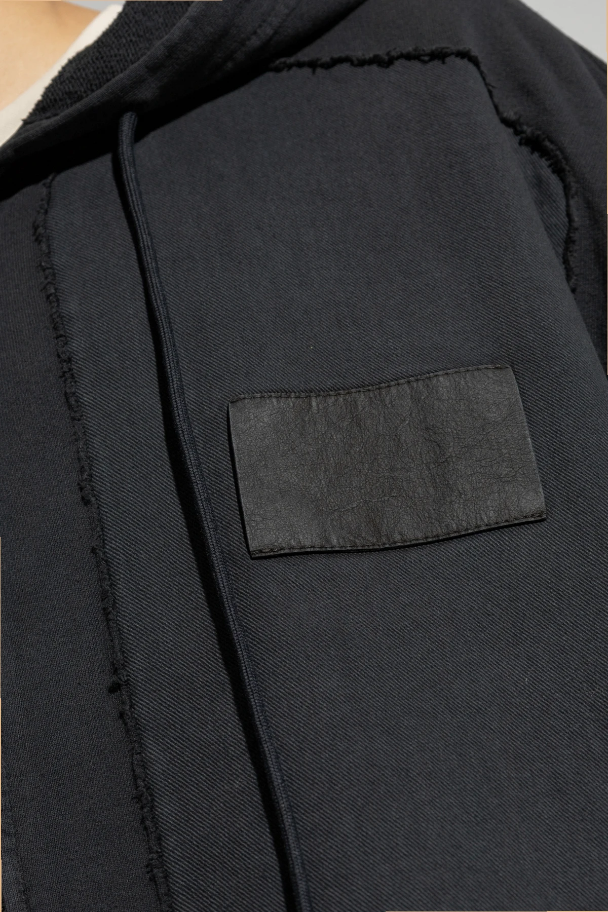 Głównym kolorem bluzy jest czarny, co w połączeniu z delikatnie postrzępionymi szwami tworzy unikalny i awangardowy wygląd. Naszywka w kolorze czarnym na lewej piersi jest subtelnym, ale wyróżniającym się detalem.