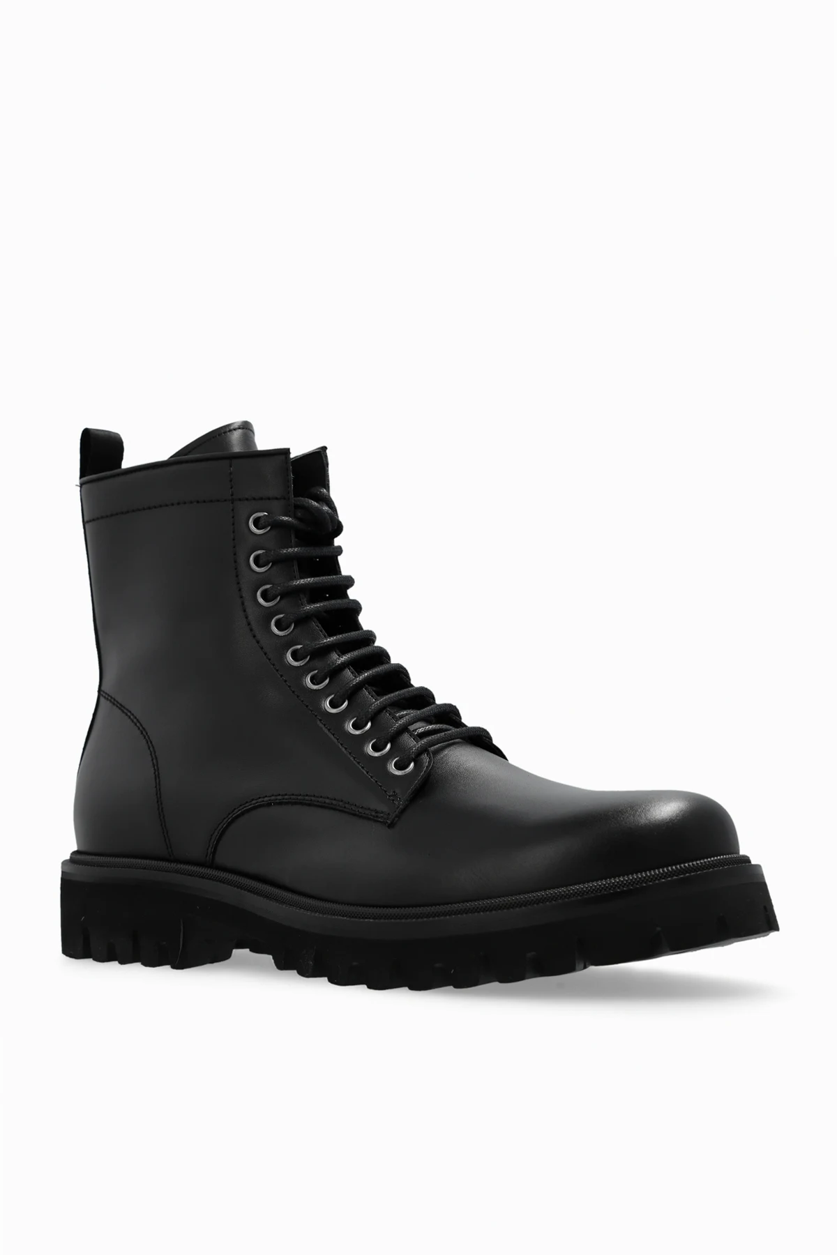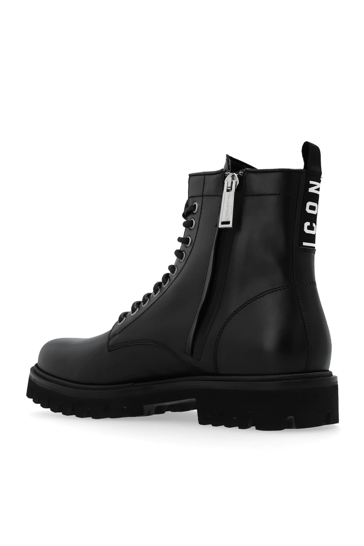 Czarne, sznurowane botki na platformie Dsquared2. Wykonane z cielęcej skóry. Zapinane z boku na zamek w kolorze srebrnym. Z tyłu czarny, rypsowy pasek z wypukłym nadrukiem ‘Icon’ w kolorze białym. Czarna, gumowa podeszwa.