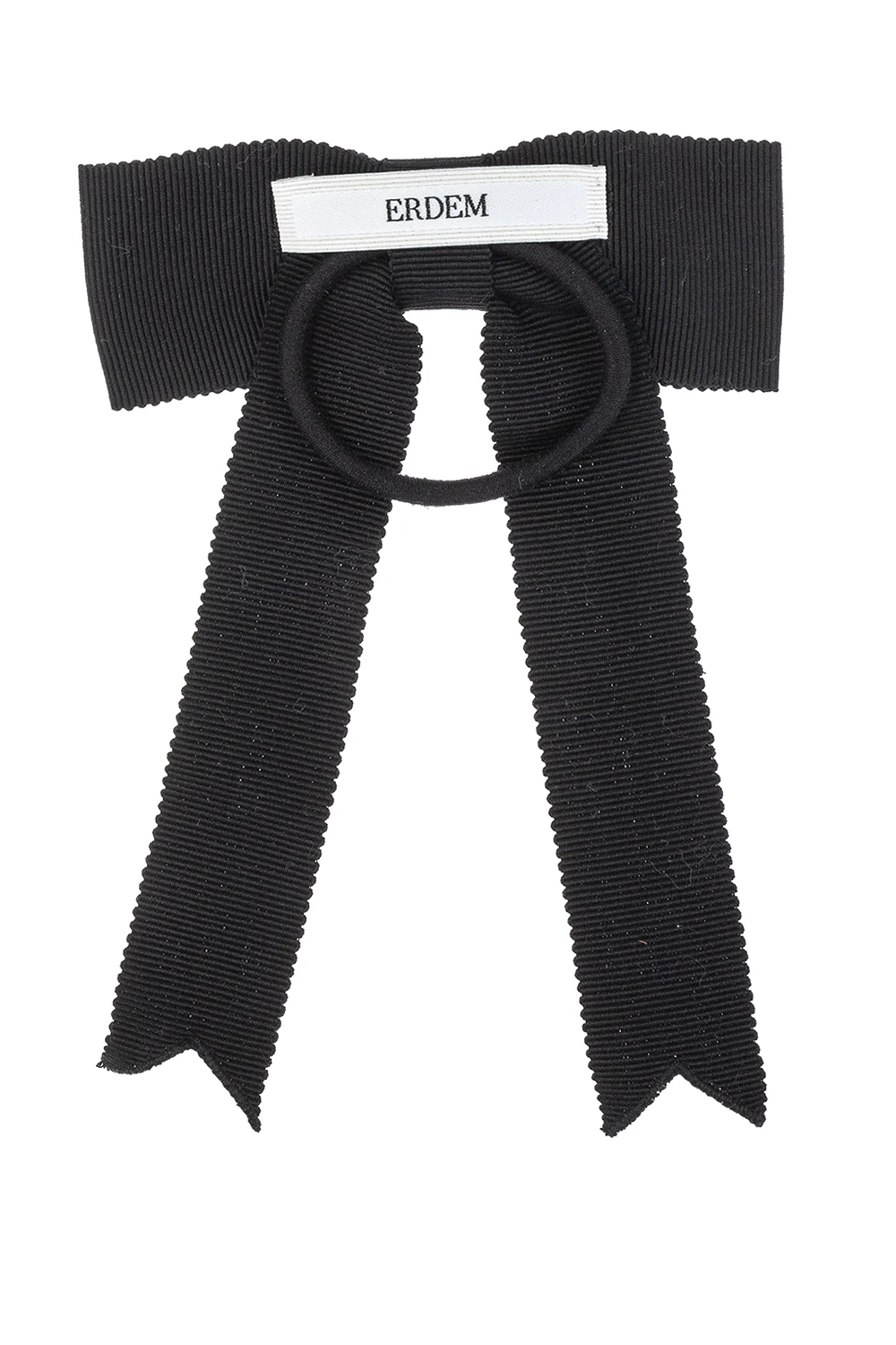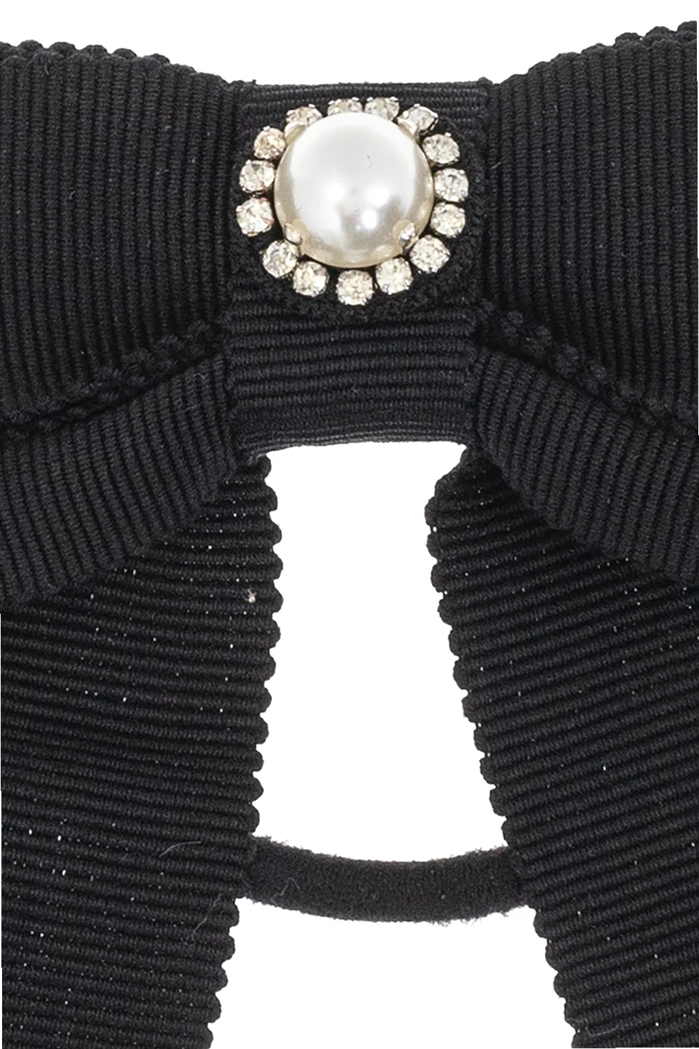 Czarna gumka do włosów Erdem. Ozdobiona aplikacją w kształcie kokardy, wykończona sztuczną perłą oraz połyskującymi kamieniami.