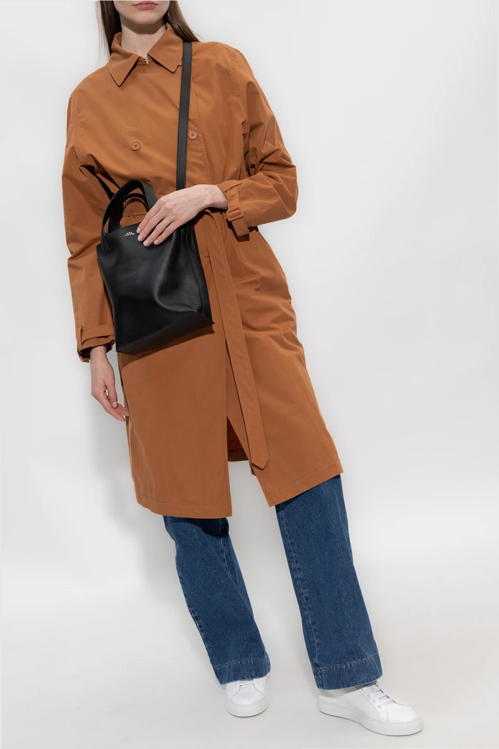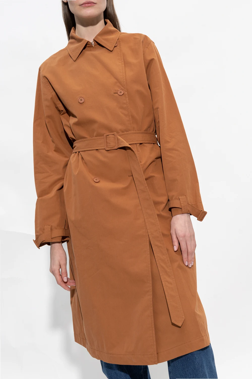 Brązowy, dwurzędowy trencz, model 'Coetz' A.P.C. Wykonany z bawełny. Zapinany na guziki. Otwarte klapy. W talii wiązany pasem. Długie rękawy zakończone regulowanym paskiem z klamrą. Dwie wsuwane kieszenie. Z tyłu pojedyncze rozcięcie.