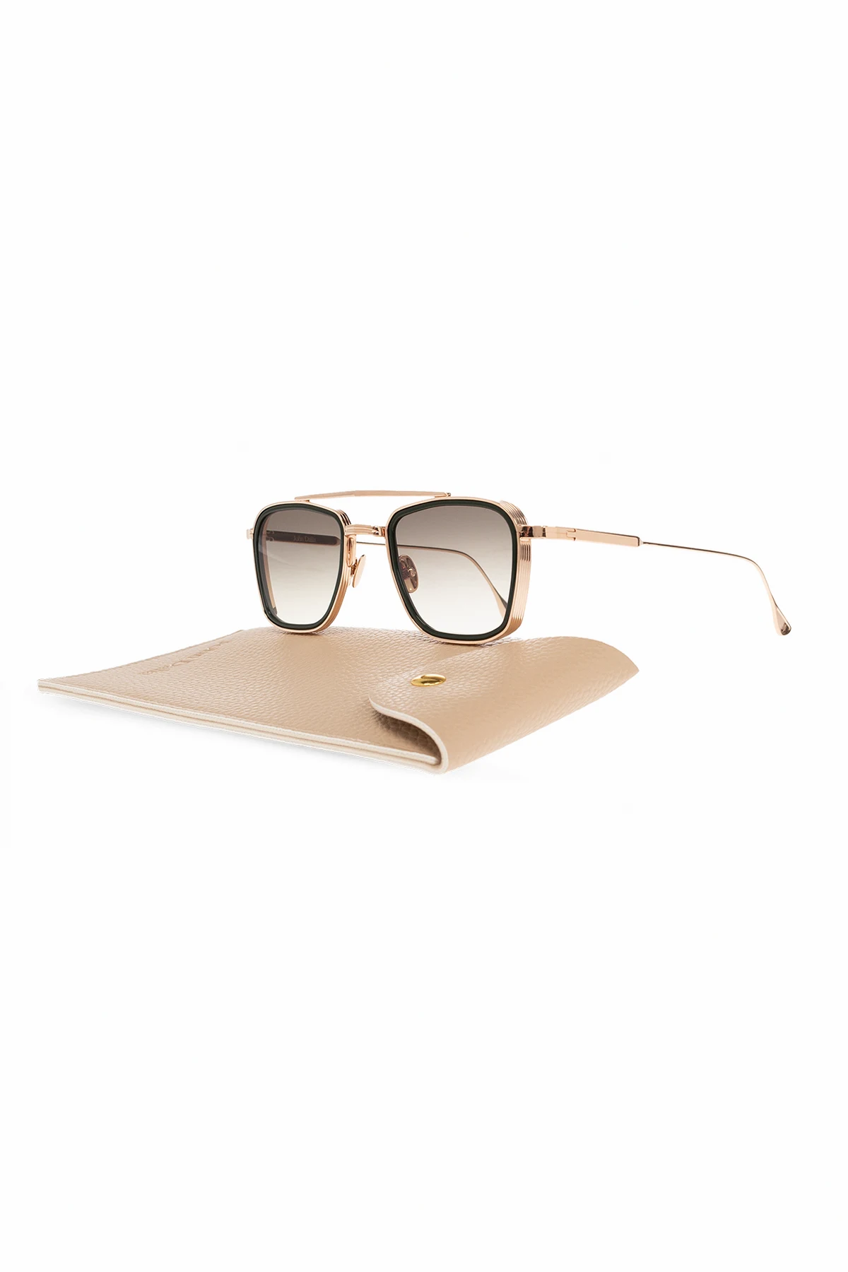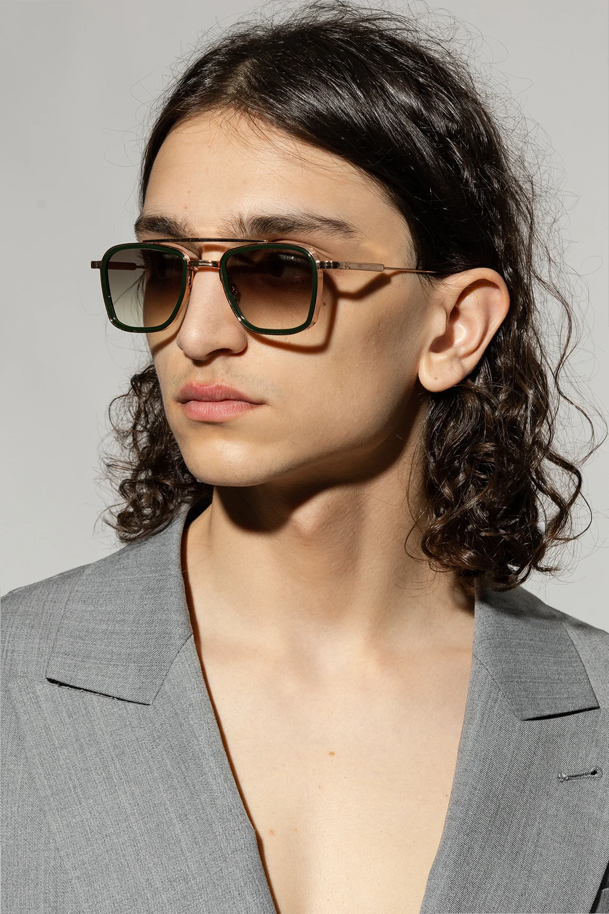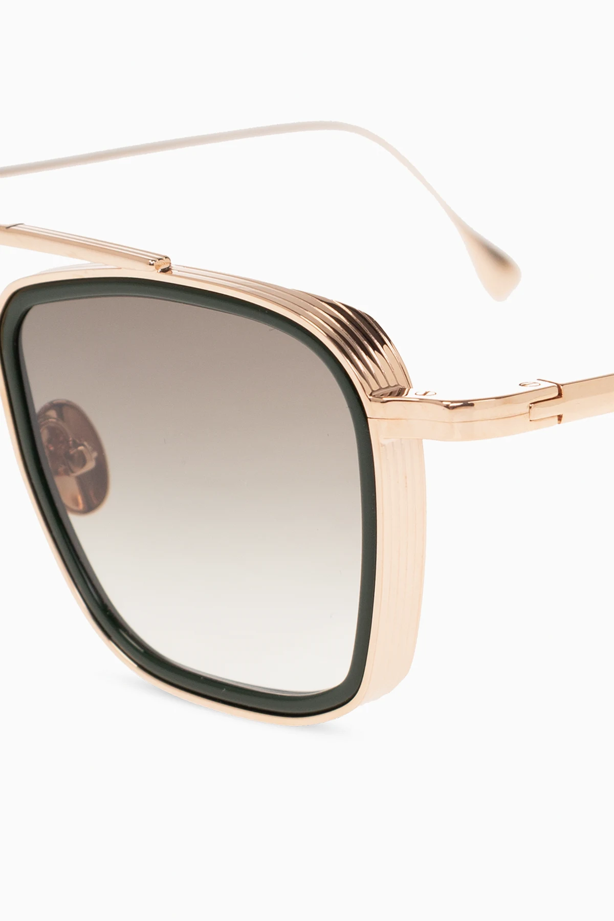 Okulary przeciwsłoneczne w kolorze złoto-zielonym, model ‘Robert’ John Dalia. Pokryte różowym złotem. Prostokątne oprawki z obręczami wyciętymi z grawerowanego metalowego paska o grubości 8 mm. Charakterystyczny podwójny mostek ozdobiony wygrawerowanym logo. Regulowane noski. Cienkie zauszniki z końcówkami z logo. Zielone, antyrefleksyjne soczewki CR39 z ochroną przeciw promieniom UV. Dołączone etui. Ręcznie wykonane we Francji.