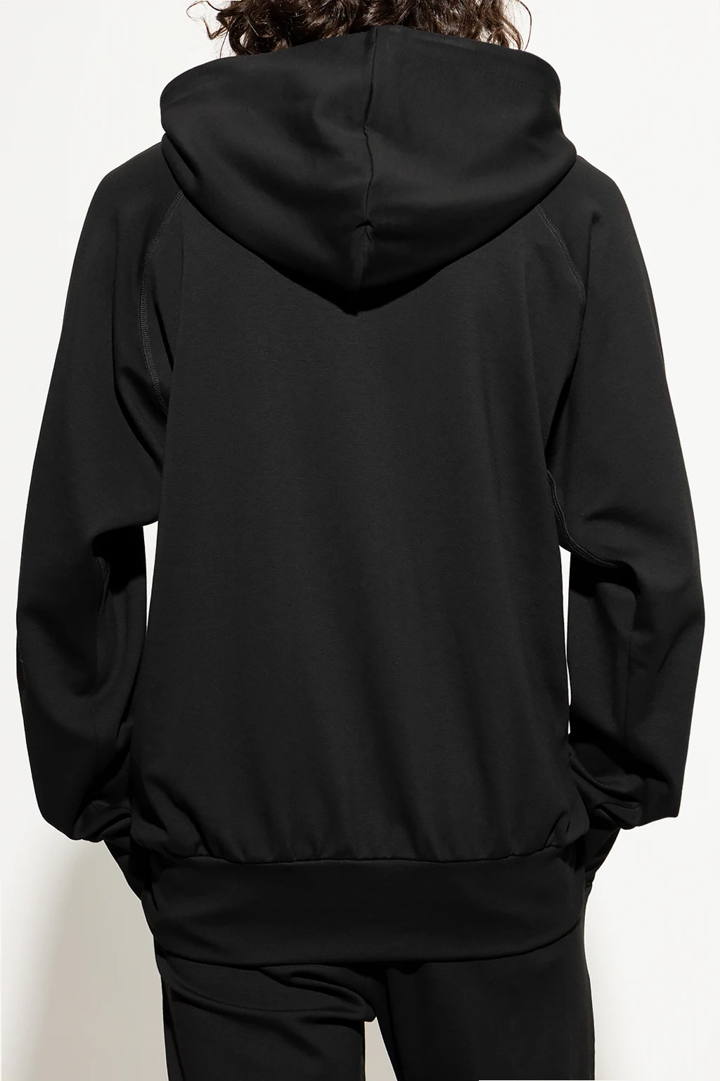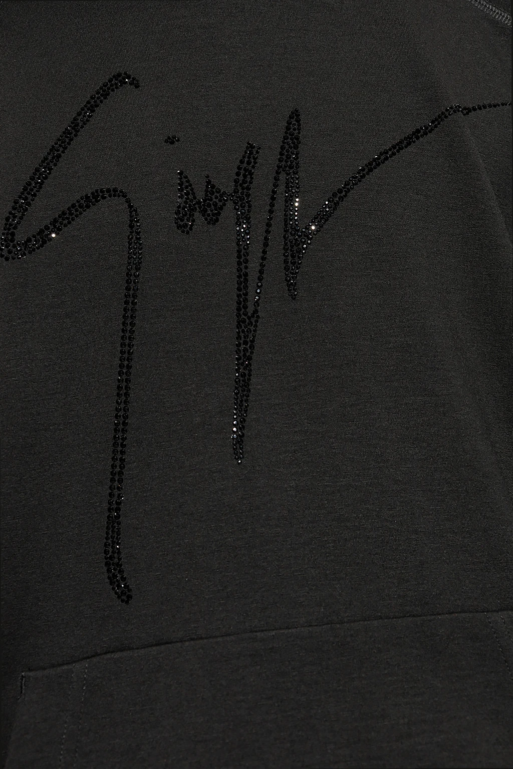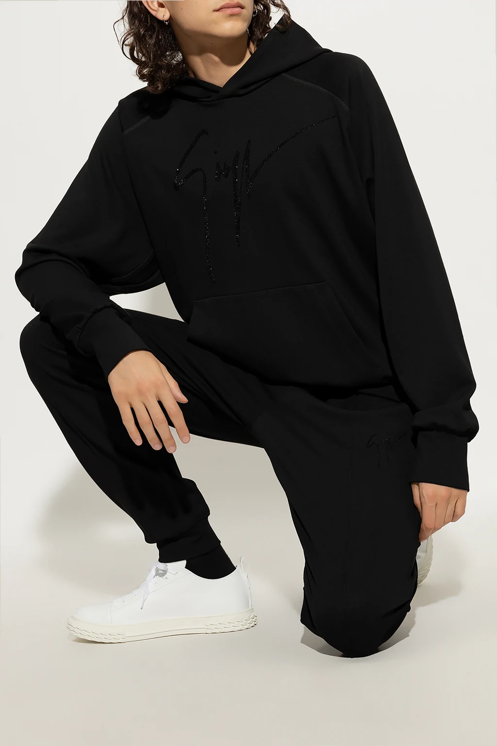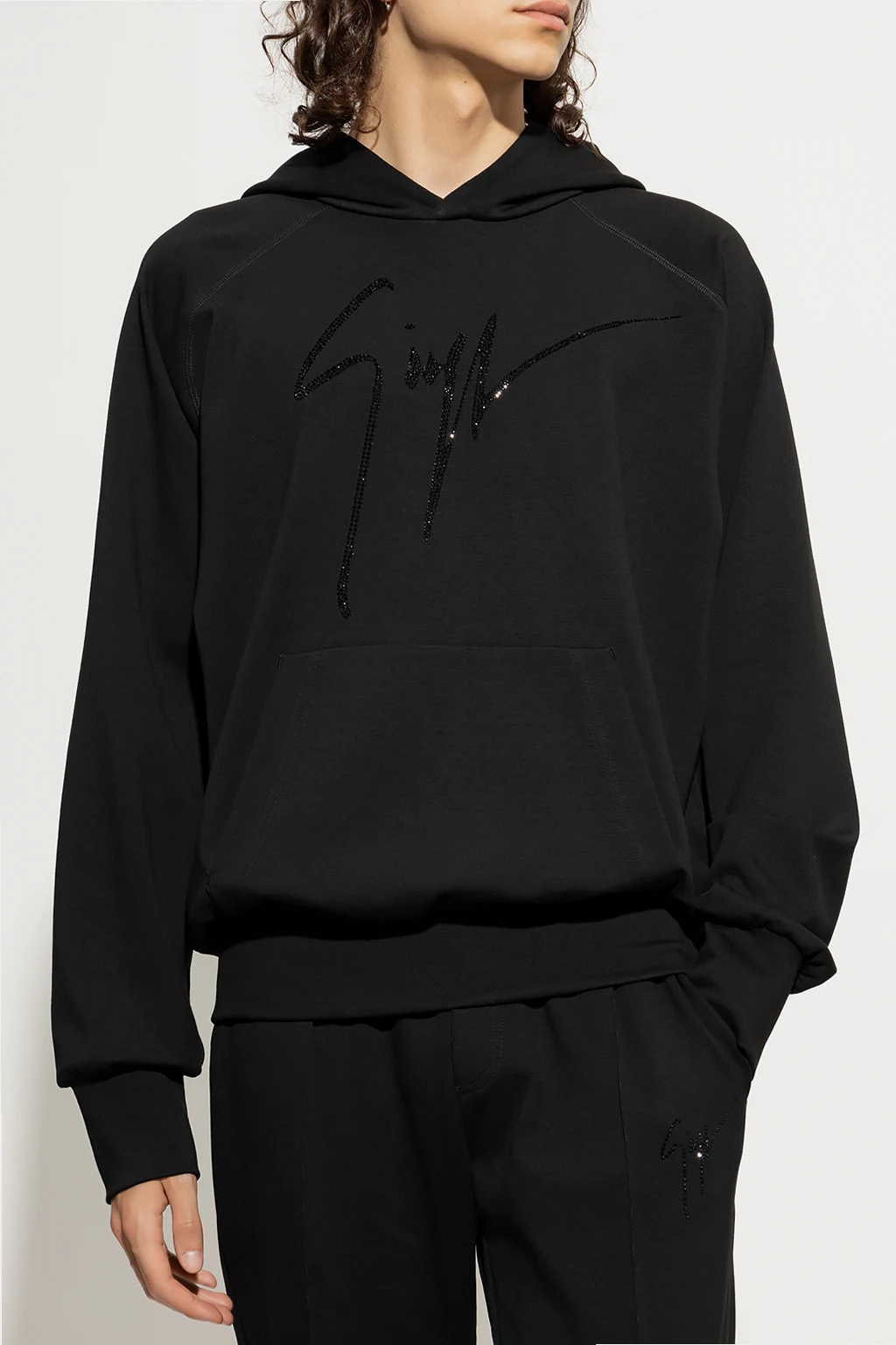 Czarna bluza z kapturem Giuseppe Zanotti. Z przodu ozdobiona połyskującymi aplikacjami układającymi się w logo. Z przodu wsuwana kieszeń. Długie rękawy oraz dół wykończone ściągaczem.
