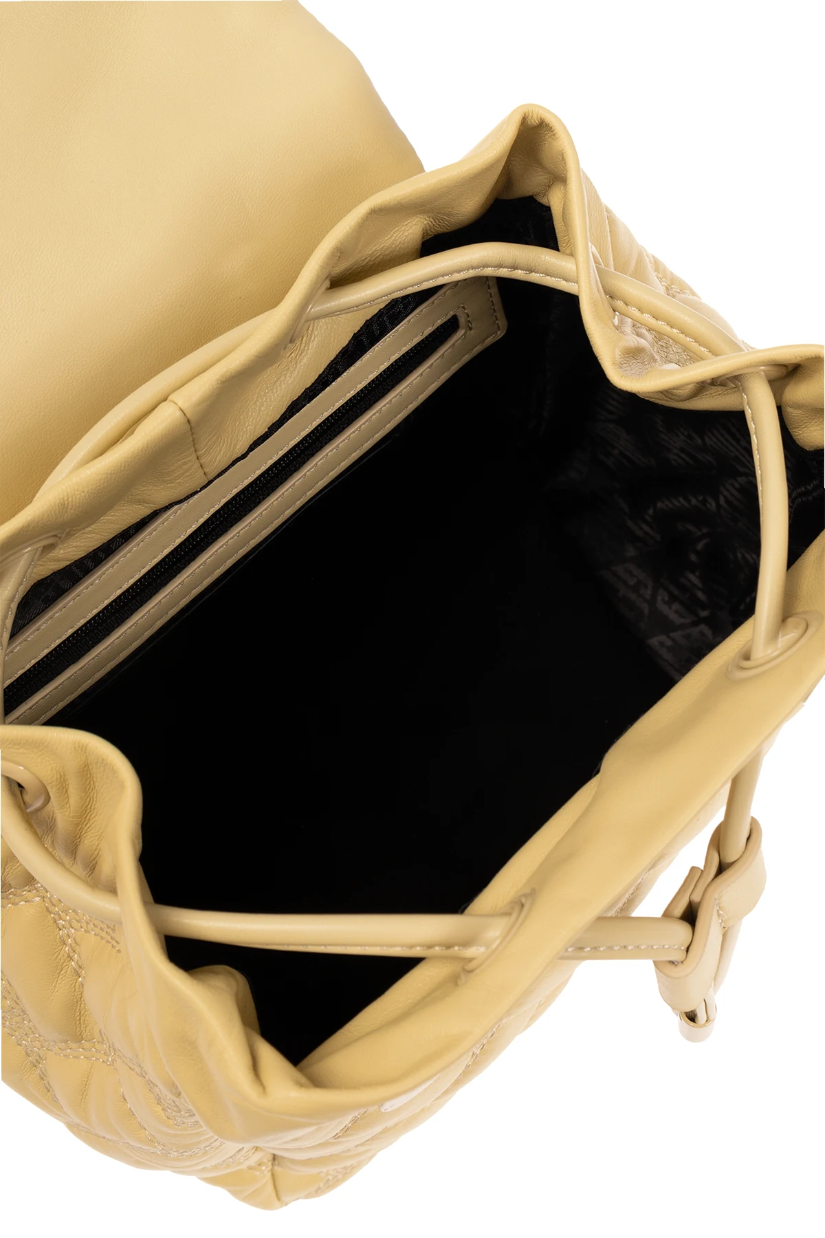 Wnętrze, wyłożone ciemnym materiałem, tworzy kontrast z jasną zewnętrzną stroną i oferuje obszerną przestrzeń wraz z praktycznymi kieszonkami bocznymi. Metalowe detale, harmonizujące z barwą plecaka, dopełniają jego wyrafinowanego wyglądu.