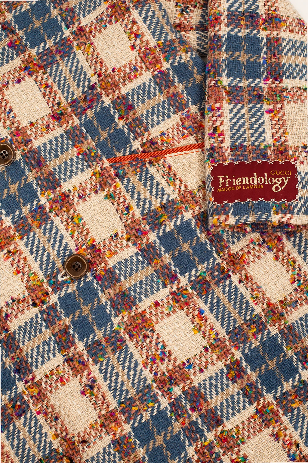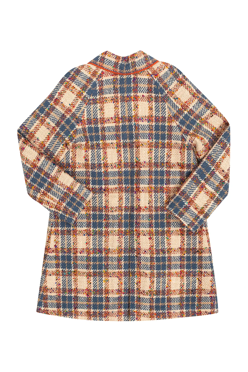 Kolorowy, tweedowy płaszcz Gucci Kids. Zapinany na guziki. Ozdobiony wzorem w kratę. Z przodu dwie wsuwane kieszenie. Beżowa warstwa wewnętrzna.