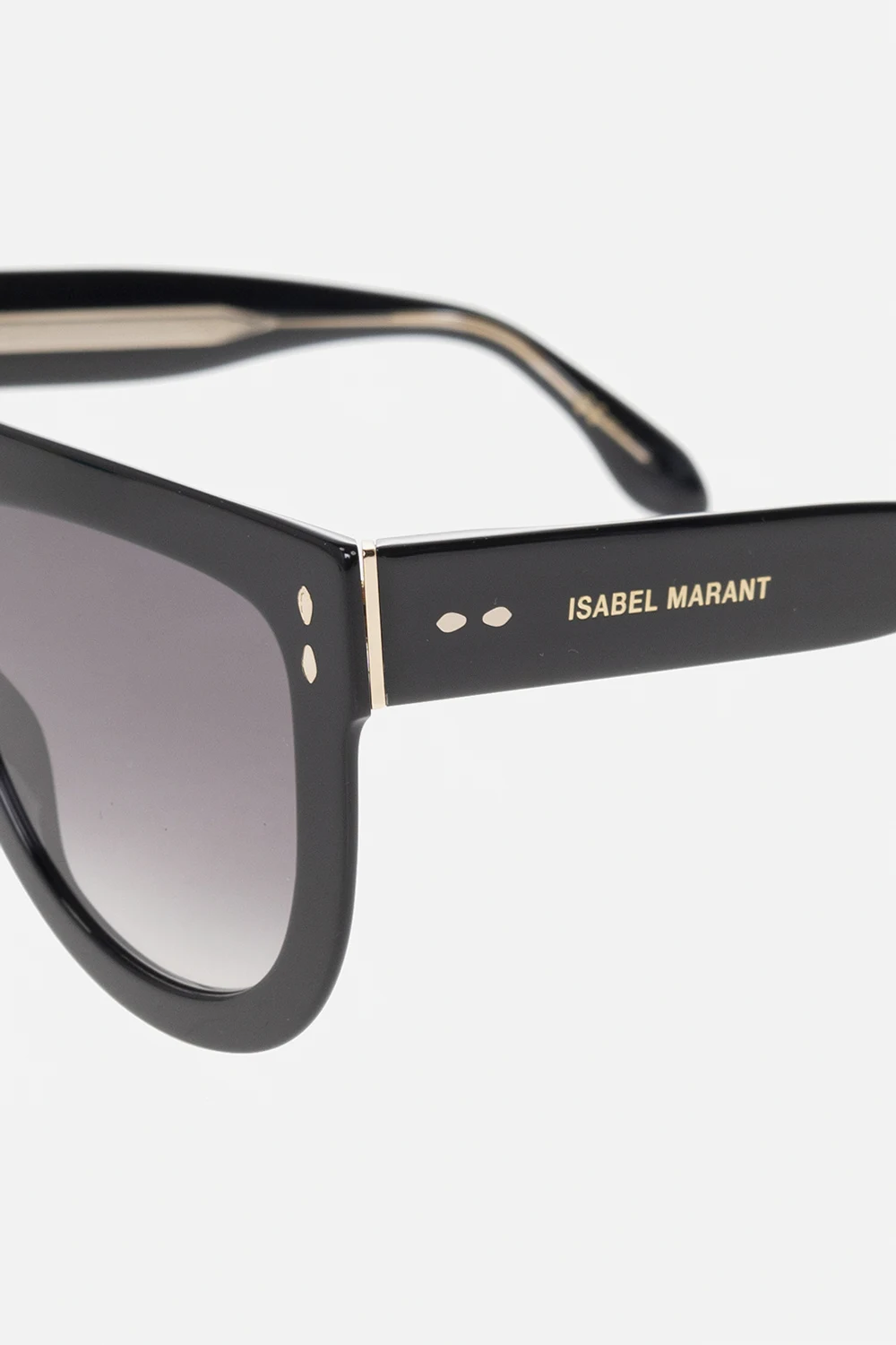 Czarne okulary przeciwsłoneczne, model ‘Emmy’ Isabel Marant. Oprawki typu pilotki z pojedynczym mostkiem ozdobione aplikacjami w kolorze złotym. Zauszniki ozdobione logo. Szare, gradientowe szkła ze 100% ochroną przeciw promieniom UV. Dołączone etui.