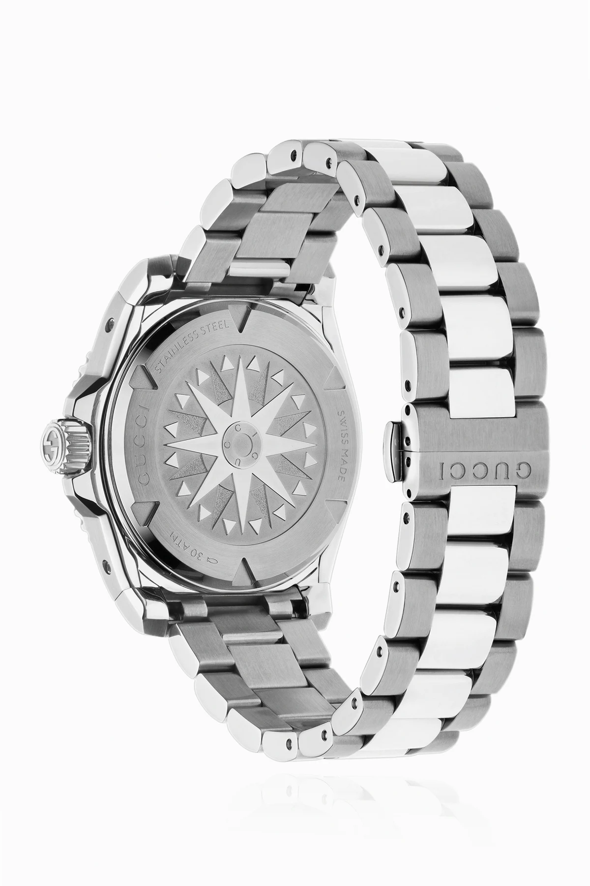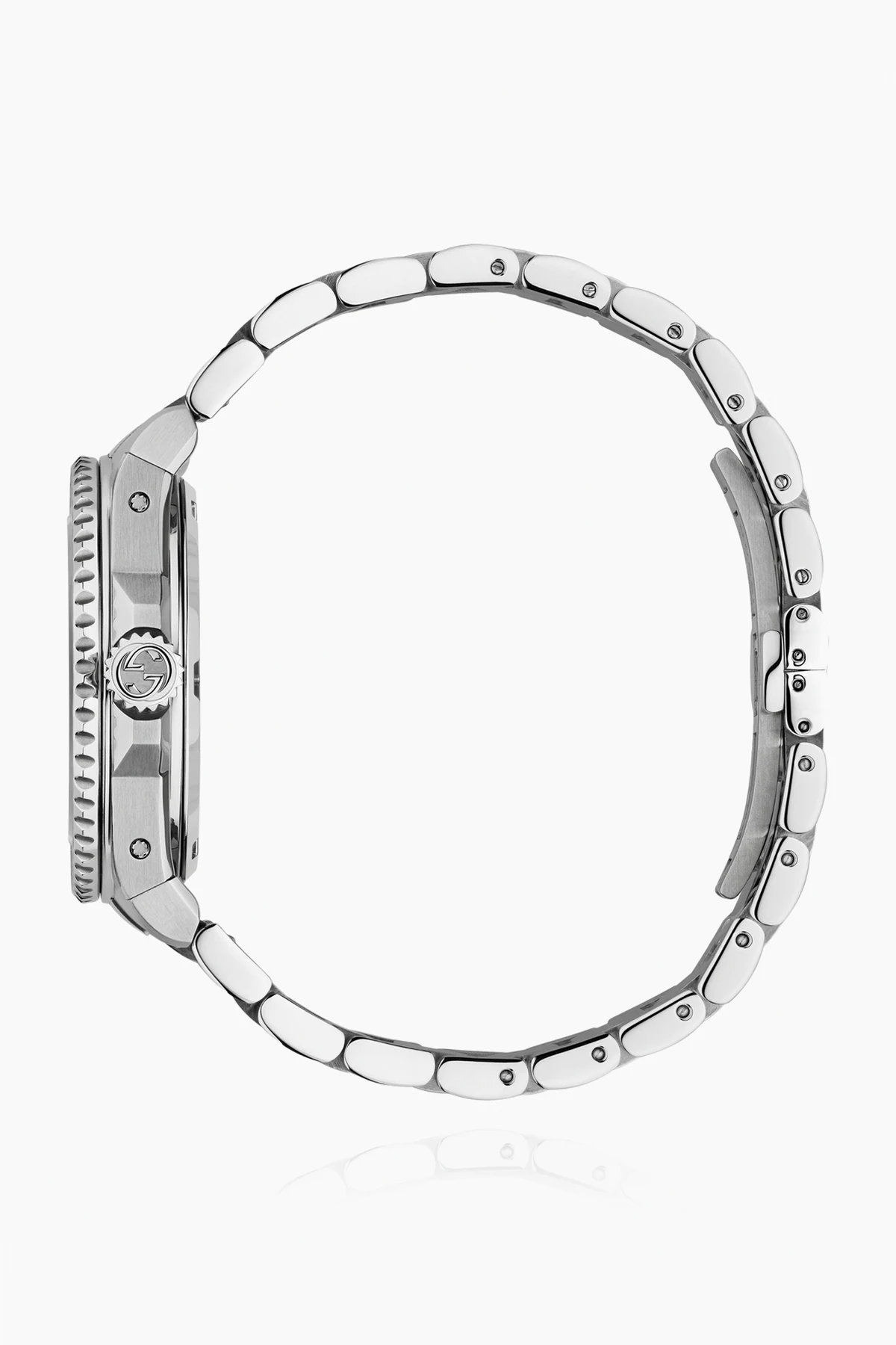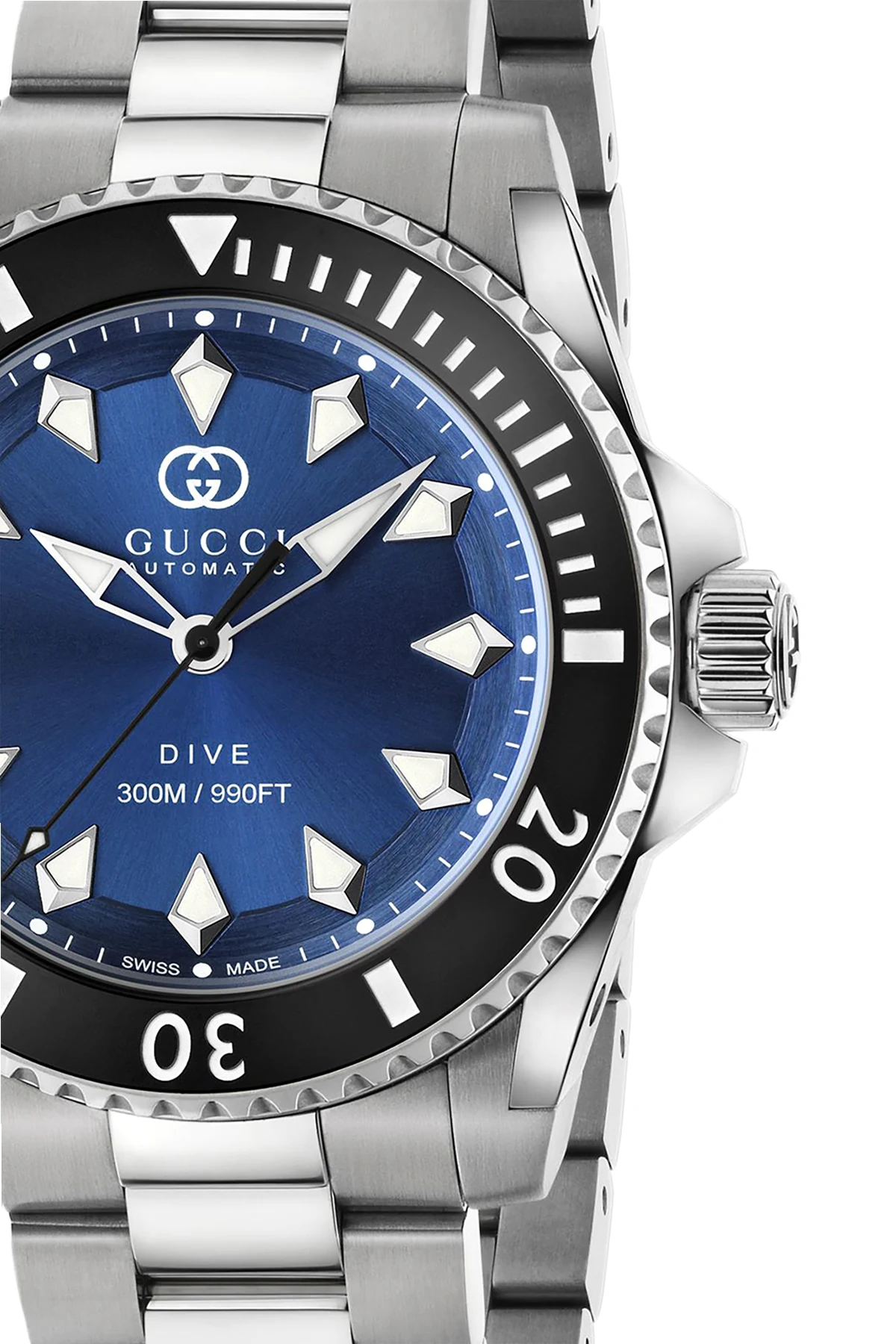 Na tarczy widoczne jest logo Gucci oraz napisy: "GUCCI", "AUTOMATIC", "DIVE", "300M/990FT", "SWISS MADE". Koronka, umieszczona po prawej stronie koperty, posiada teksturowany uchwyt ułatwiający ustawienie czasu. Przezroczysty dekiel ukazuje mechanizm zegarka i jest ozdobiony wzorem przypominającym kompas.