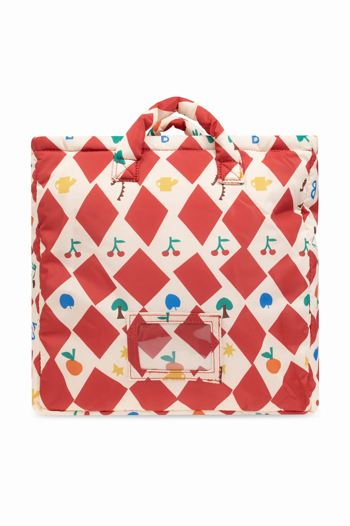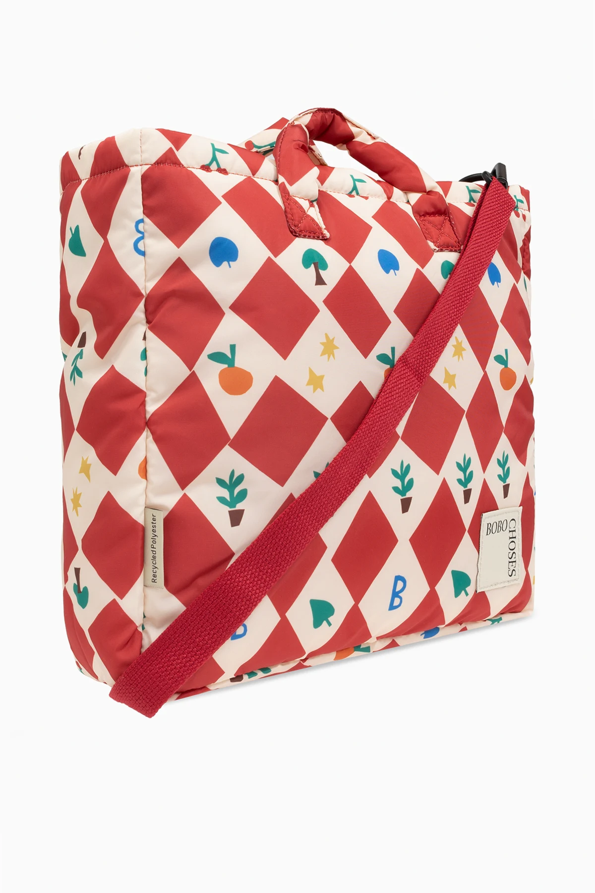 Torba posiada czerwony, regulowany pasek na ramię oraz dwa krótsze uchwyty do noszenia w ręce. Na przedniej części znajduje się naszywka z logo projektanta "Bobo Choses", a z tyłu przezroczysta kieszonka na identyfikator. Wnętrze torby, wykończone materiałem w kolorze czerwonym, kryje komorę oraz kieszeń z zamknięciem na zamek, gwarantując funkcjonalność i łatwy dostęp do zawartości.