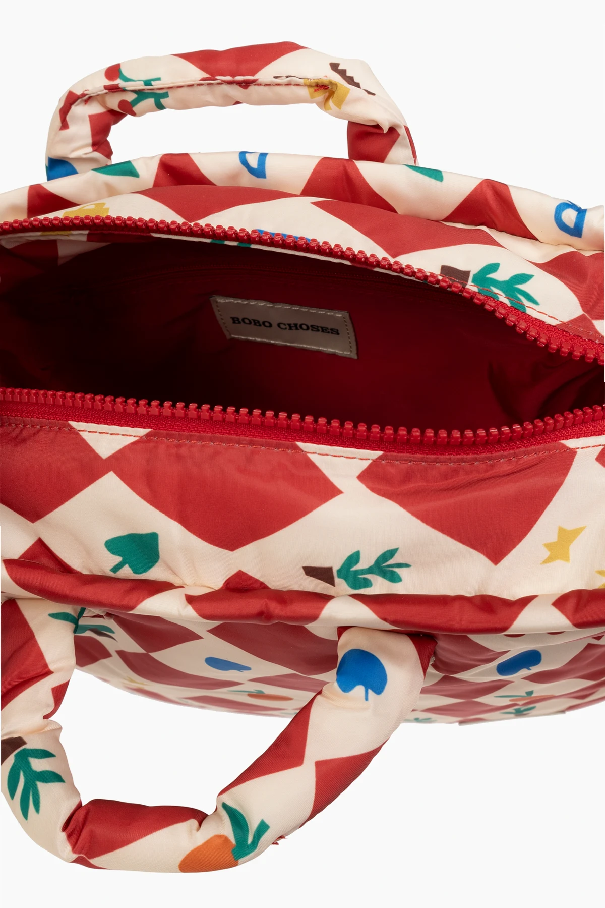 Przedstawiamy torbę na ramię z kolekcji dla dzieci od renomowanego projektanta Bobo Choses . Produkt ten, wykonany z recyklingowanego poliamidu, łączy w sobie wytrzymałość i estetykę. Prostokątny kształt torby oraz wzór przypominający szachownicę, z czerwonymi rombami na białym tle, z pewnością przyciągną uwagę. W rombach znajdują się różnorodne kolorowe motywy, takie jak drzewa, kwiaty, gwiazdki, grzybki i litery, nadające torbie zabawny i dziecięcy charakter.