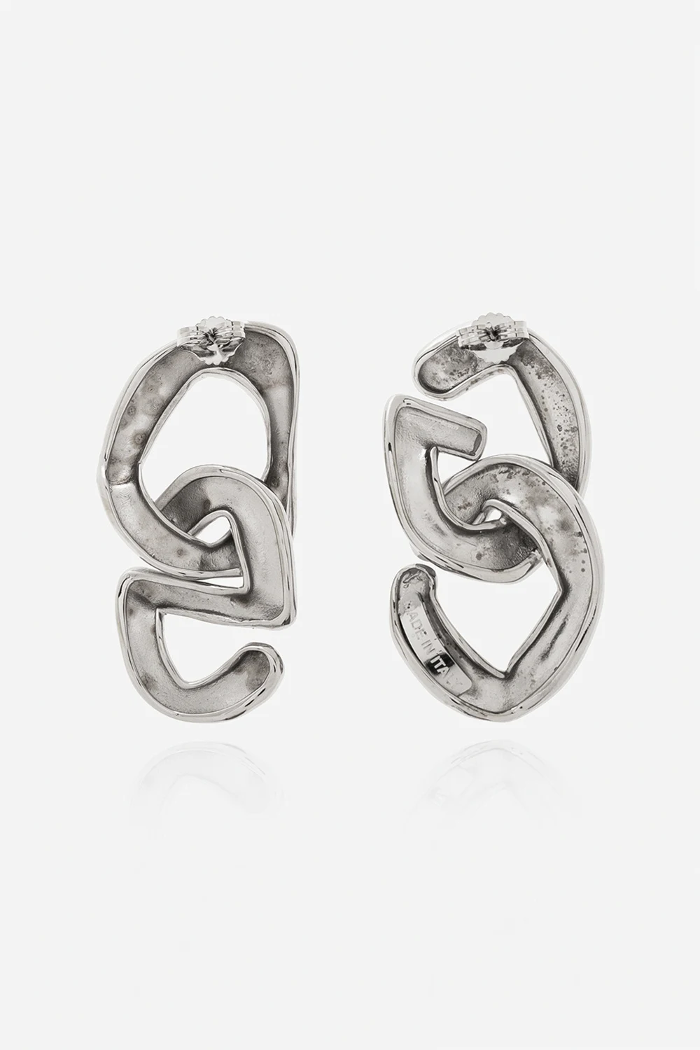Kolczyki w kolorze srebrnym GCDS. Wykonane z mosiądzu. Dekoracyjne ogniwa w kształcie logo. Zapinane na sztyft.