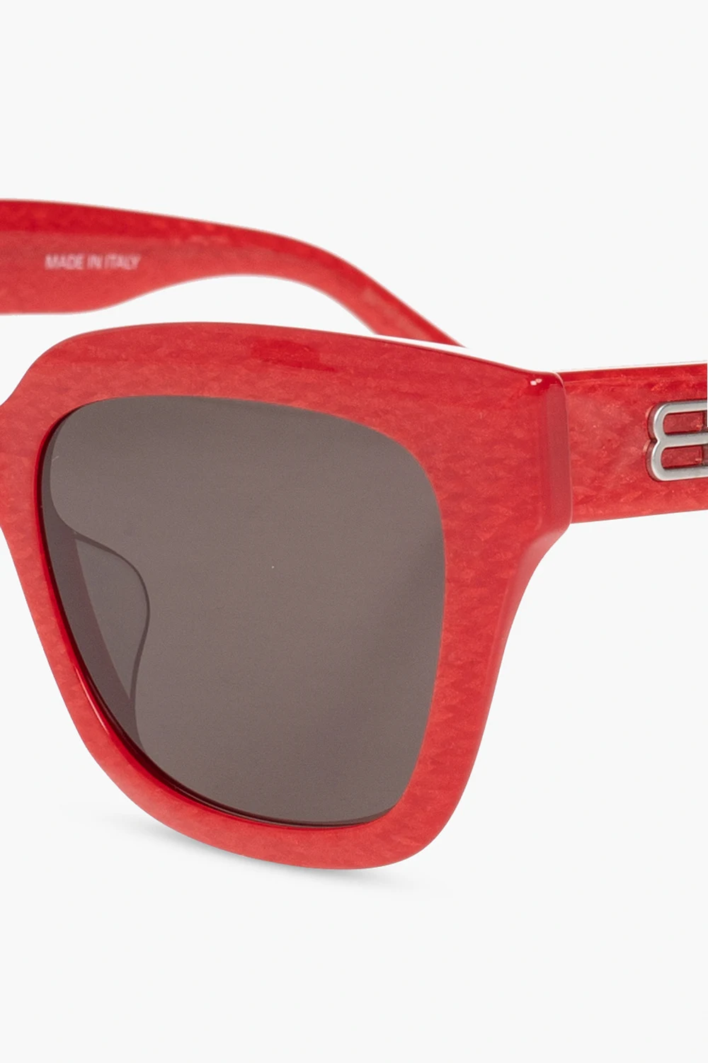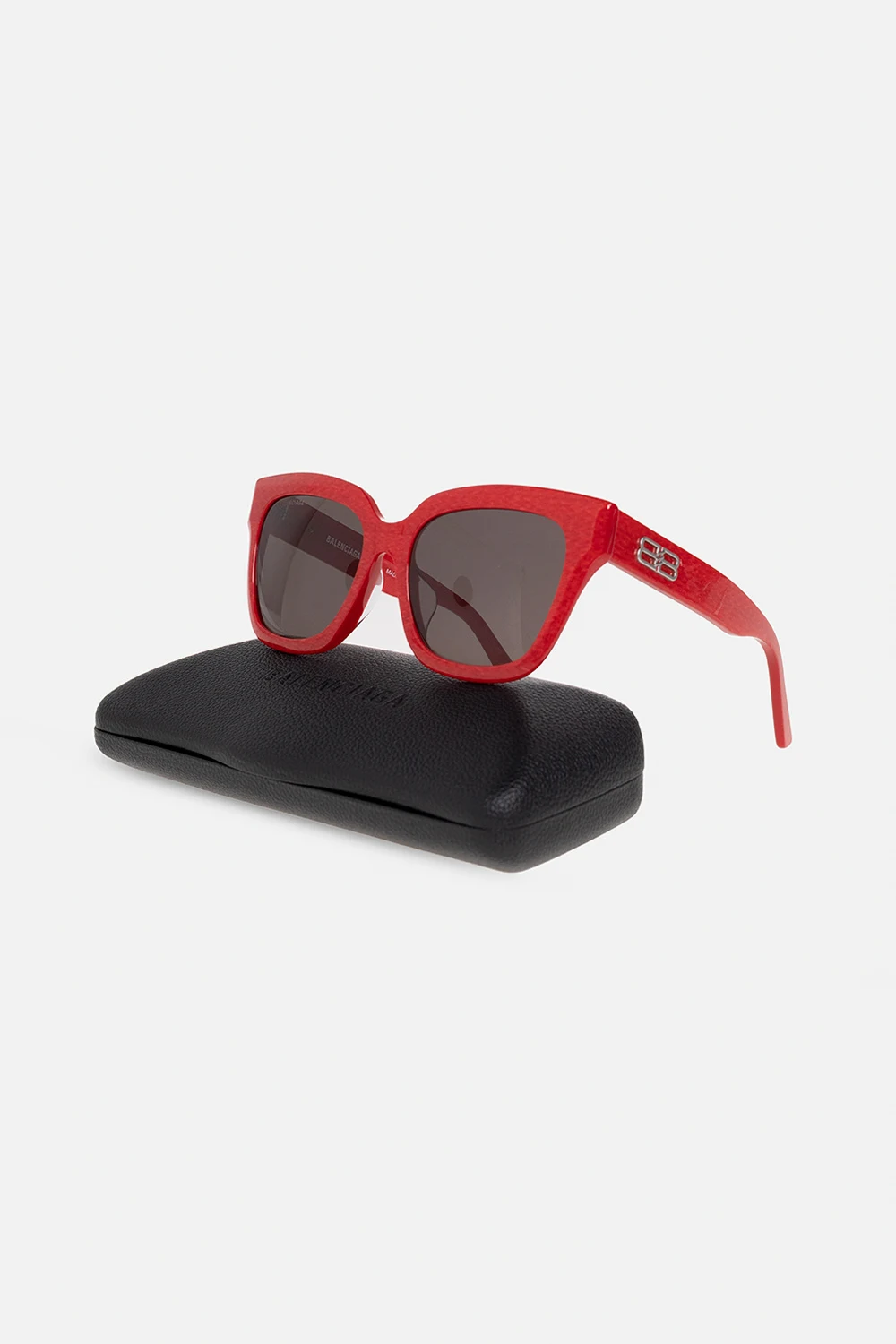 Czerwone okulary przeciwsłoneczne, model ‘Rive G D-Frame’ Balenciaga. Oprawki w kształcie litery ‘D’ oraz zauszniki wykonane z połyskującego poliwęglanu ozdobionego delikatnym wzorem. Po bokach metalowa aplikacja w kształcie logo ‘BB Icon’ w kolorze srebrnym. Ciemnoszare soczewki ze 100% ochroną przed promieniami UV ozdobione logo. Dołączone etui.