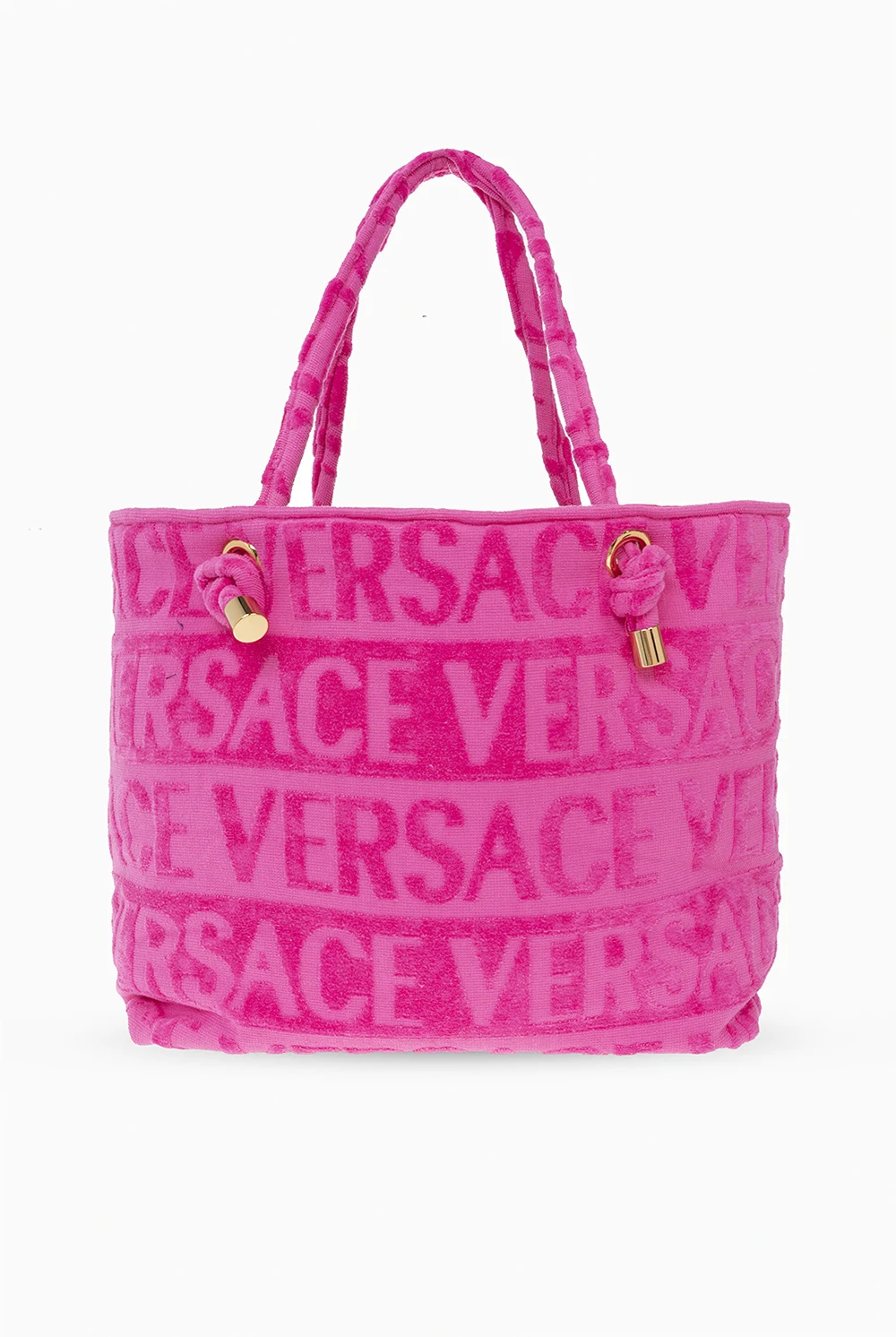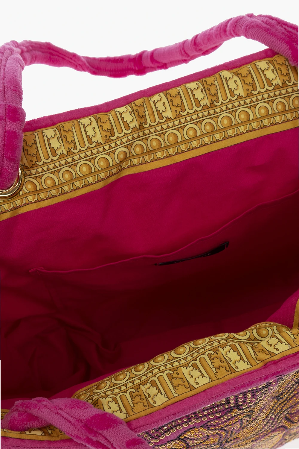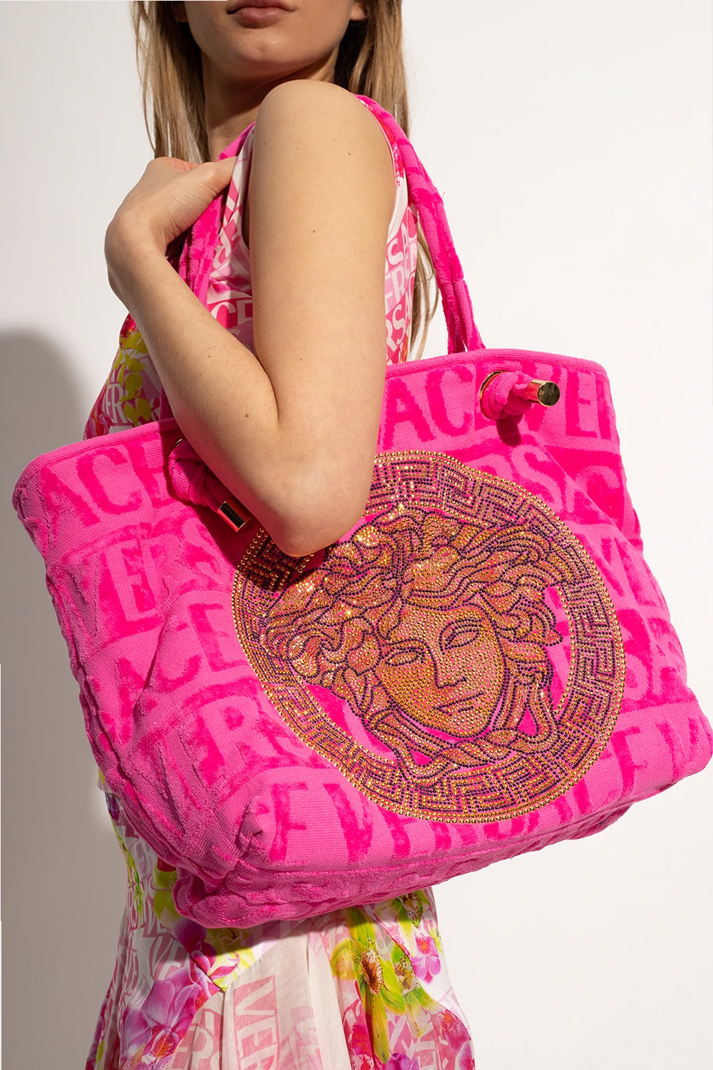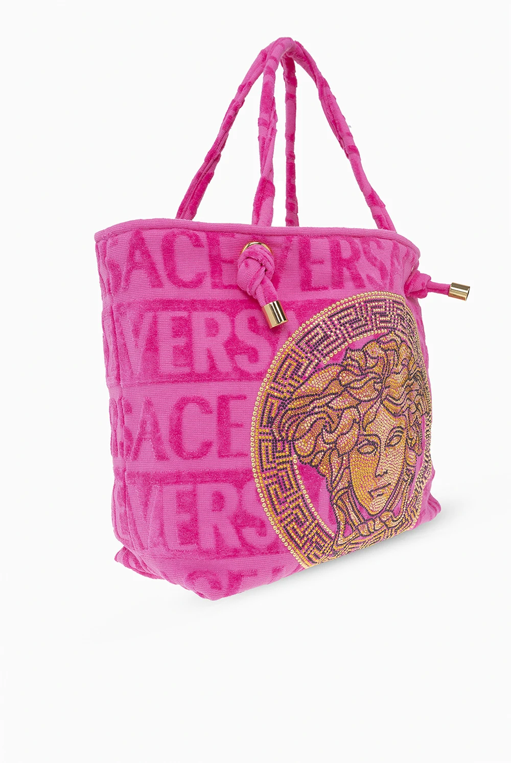 Różowa torba typu ‘shopper’ Versace Home. Wykonana z bawełny typu frotte. Ozdobiona monogramem. Z przodu charakterystyczna głowa Meduzy wykończona połyskującymi cekinami. Dwa półokrągłe paski. Wewnątrz komora i dwie wsuwane kieszenie. Metalowe elementy w kolorze złotym.