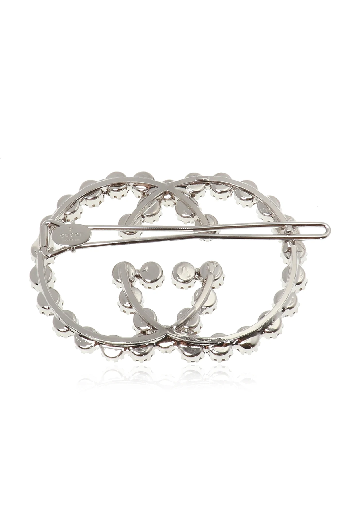 Spinka do włosów z logo w kolorze srebrnym Gucci. Wysadzana dekoracyjnymi elementami w kolorze białym.