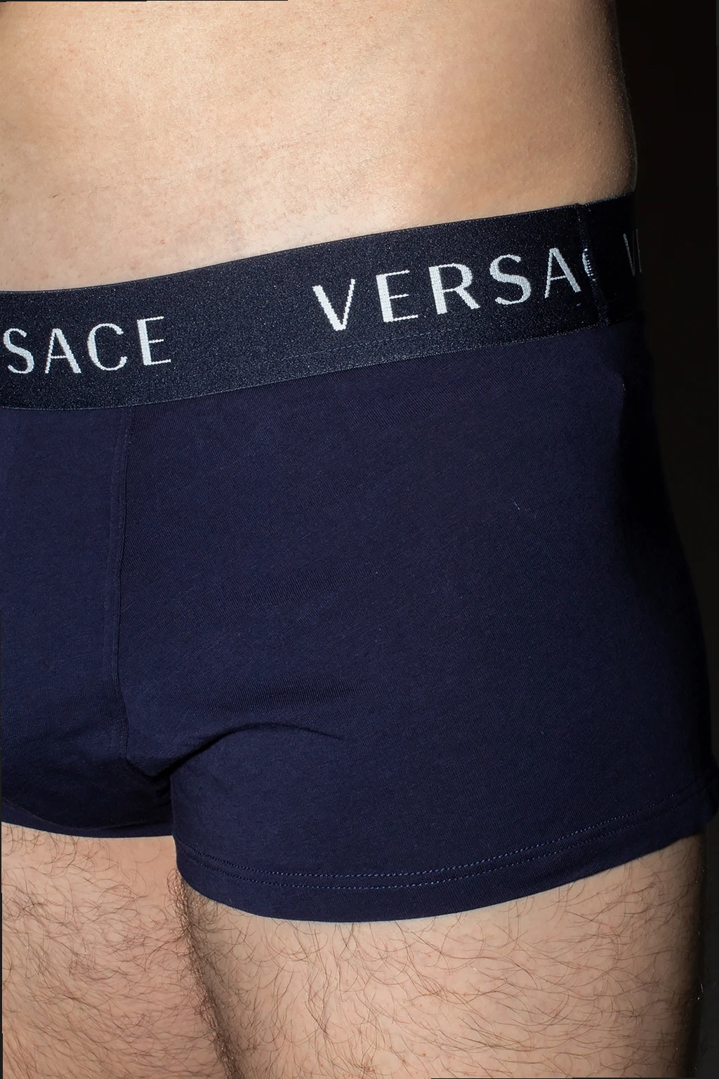 Trójpak granatowych, bawełnianych bokserek Versace. W pasie wszyta granatowa guma z logo w kolorze białym.