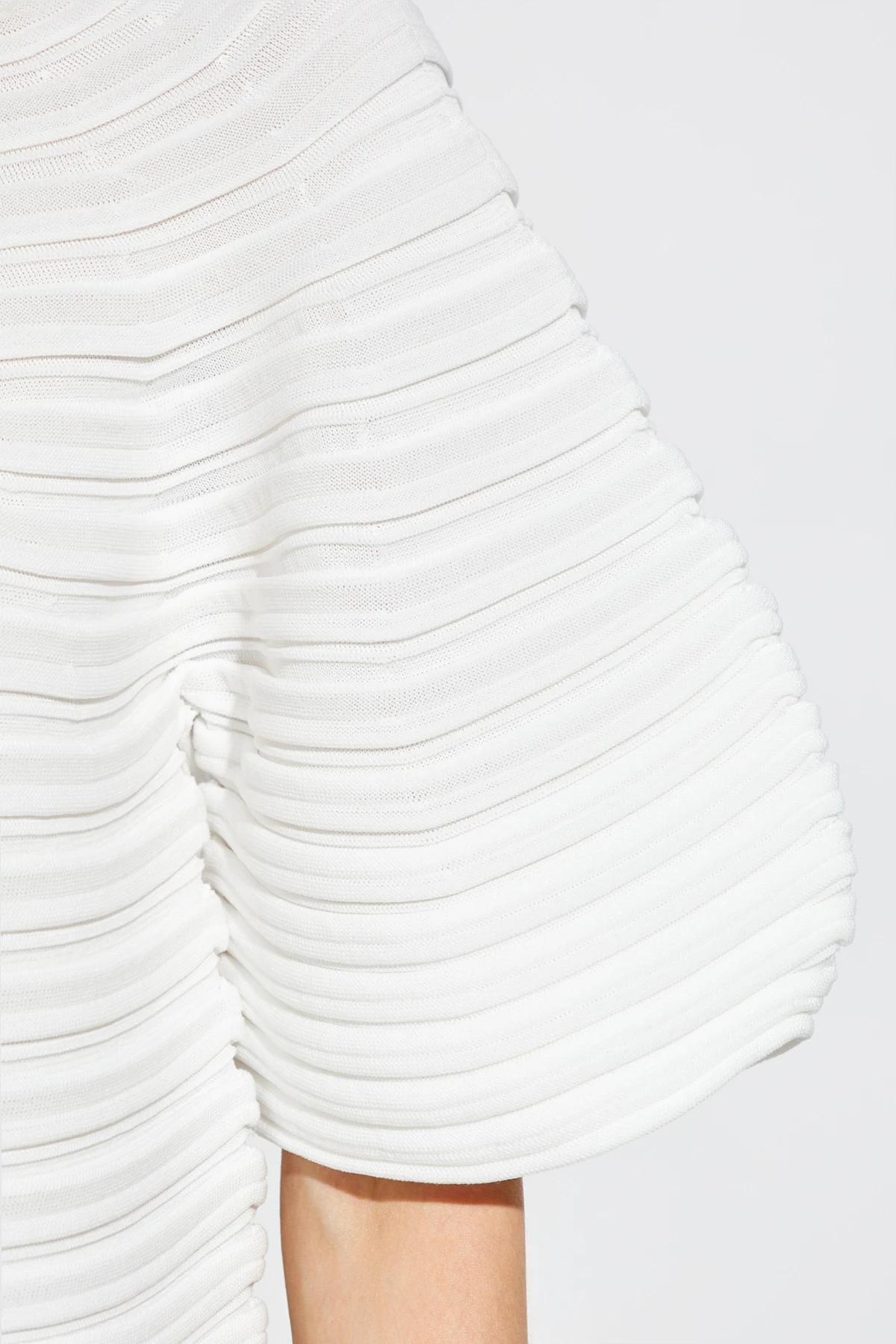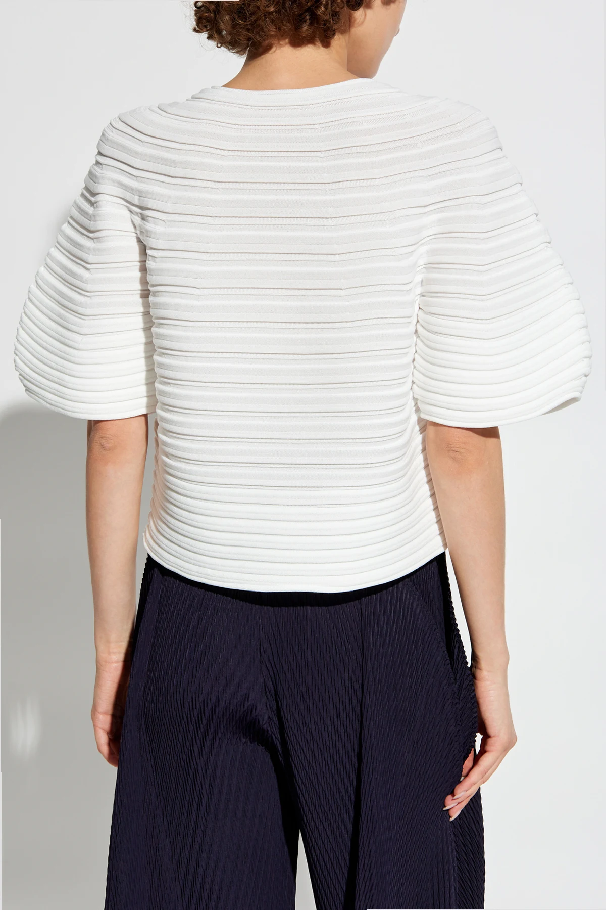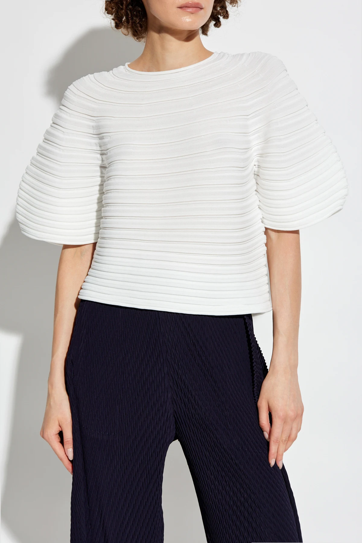 Top charakteryzuje się prostym, lekko skróconym fasonem , który sięga do talii, oraz szerokimi rękawami o kształcie balonu, nadającymi mu oryginalności i efektowności. Jednolite białe tło podkreśla poziome plisowania , tworząc teksturowany efekt na całej powierzchni, a starannie wykonane wykończenia okrągłego dekoltu akcentują jego ekskluzywny charakter.