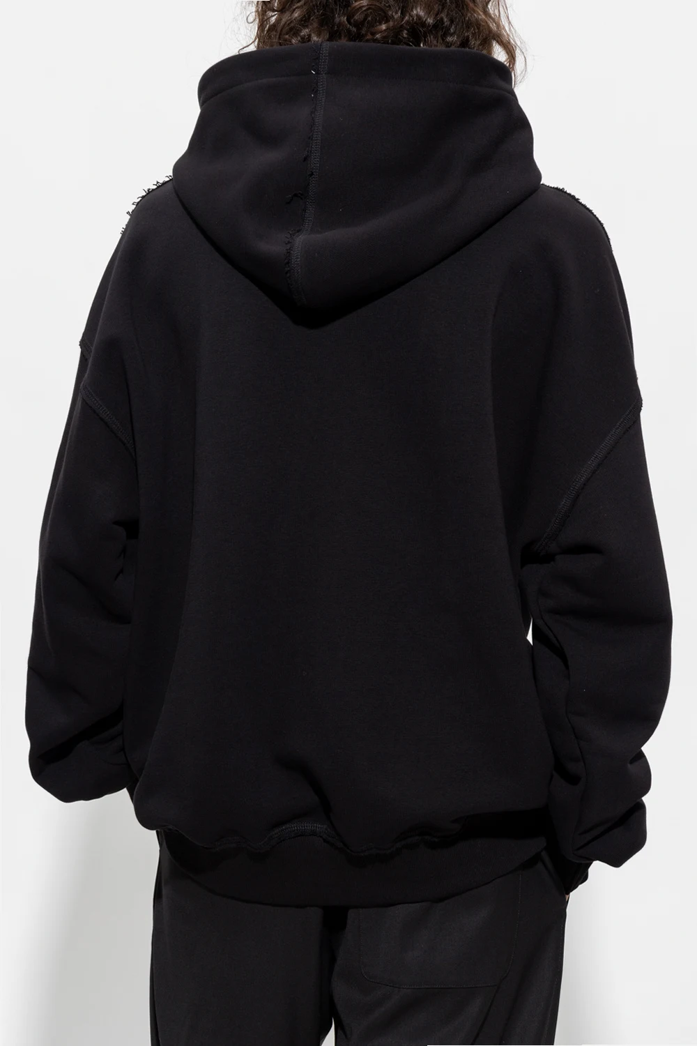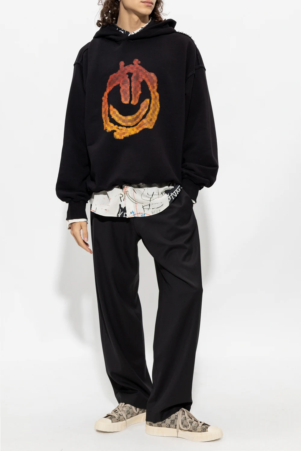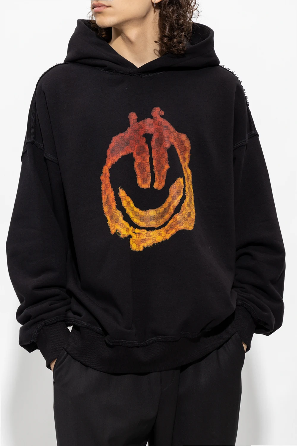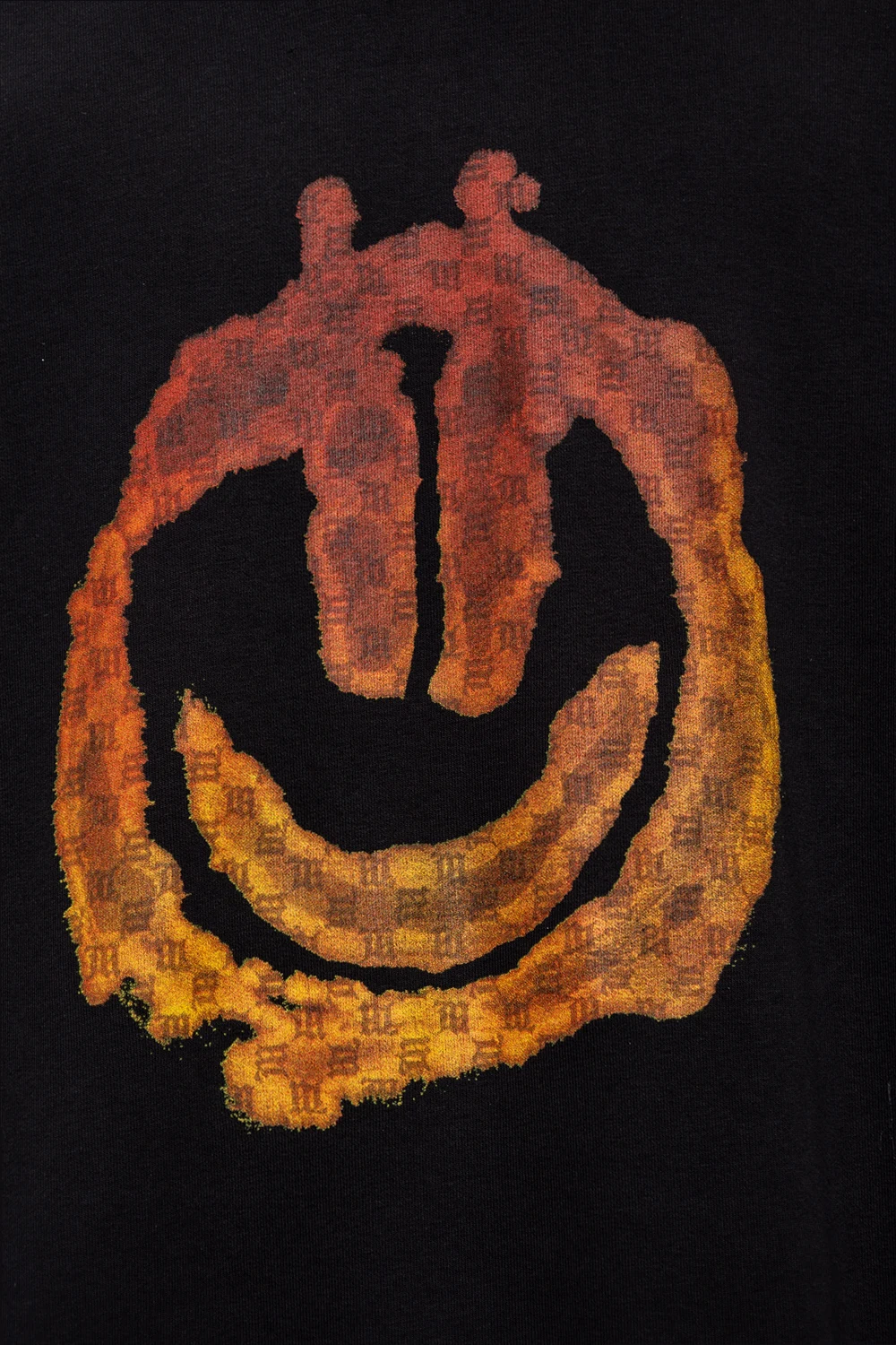 Czarna bluza o luźnym kroju MISBHV. Wykonana z bawełny. Ozdobiona czerwono-żółtym nadrukiem z monogramem. Surowe wykończenie. Długie rękawy oraz dół zakończone ściągaczem.