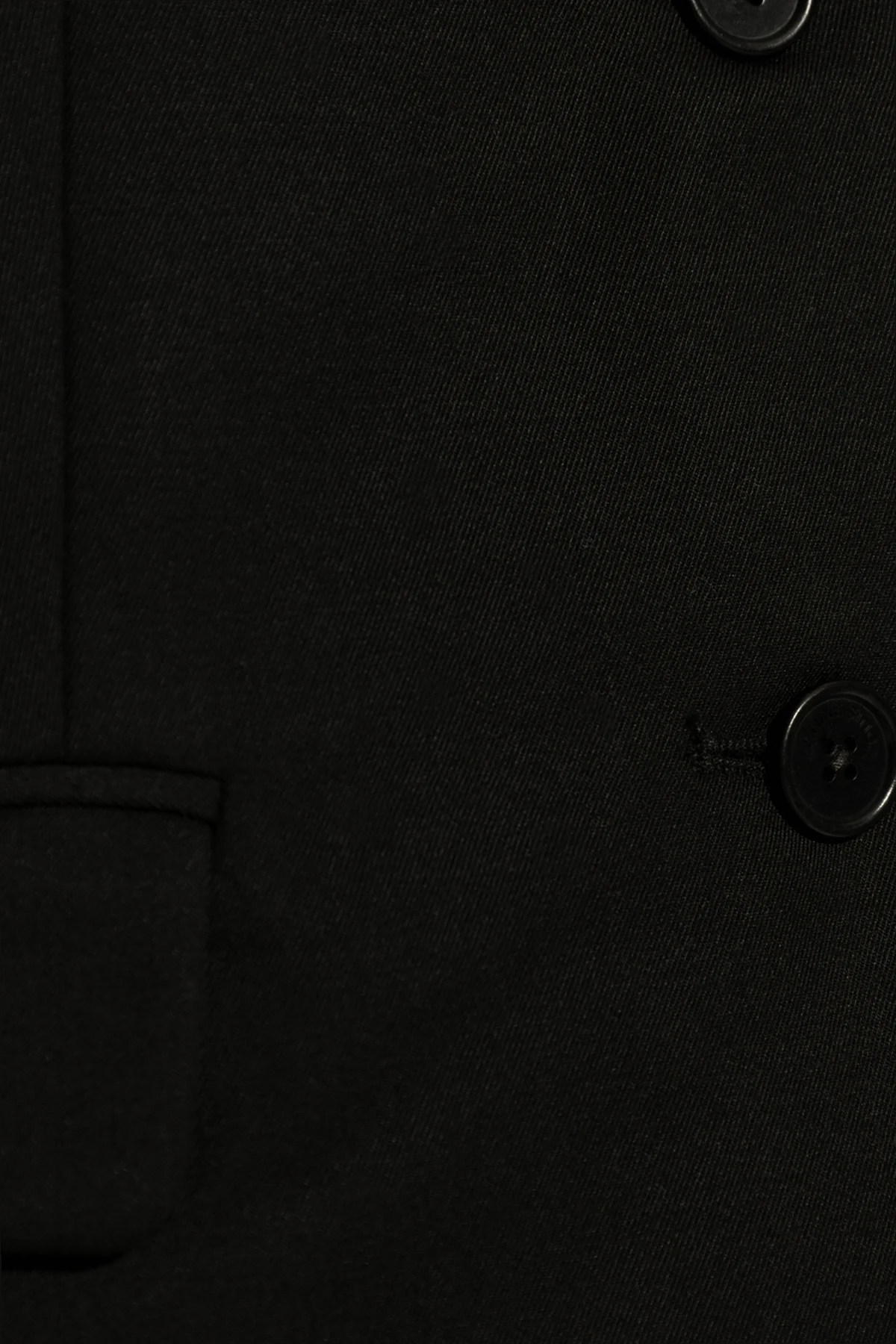 Detale takie jak dwa guziki do zapinania oraz dwie kieszenie z patkami umieszczonymi po obu stronach przodu marynarki, są świadectwem staranności wykonania i dbałości o każdy, nawet najmniejszy detal. Tekstura materiału, widoczna na zbliżeniach, uwydatnia bogactwo i jakość wykorzystanej wełny, natomiast starannie dobrany guzik harmonijnie współgra z całością projektu.