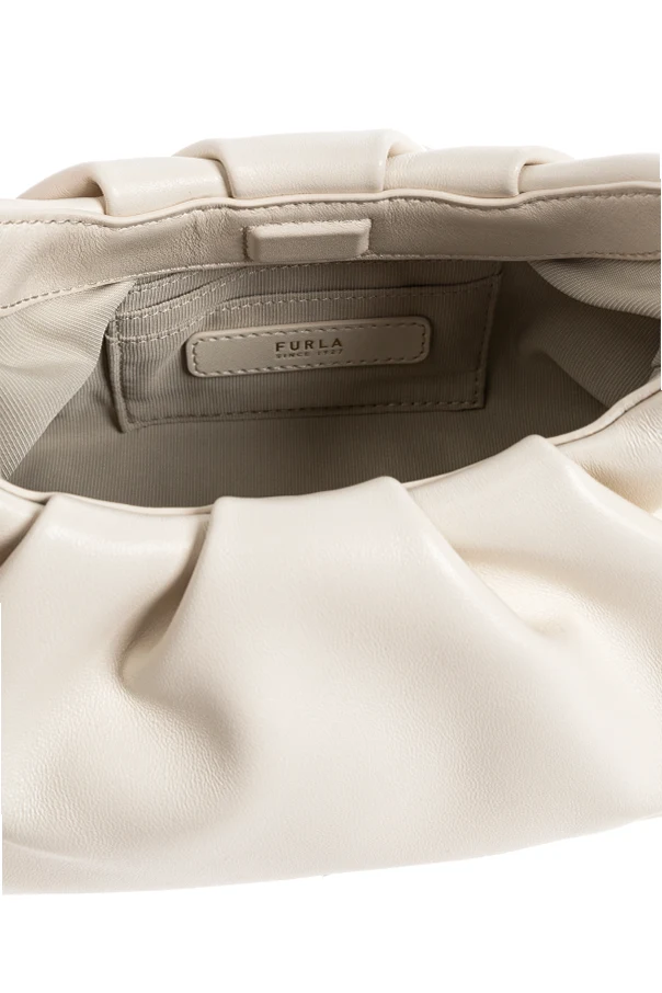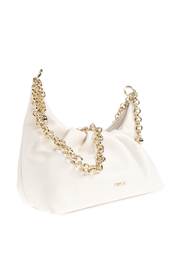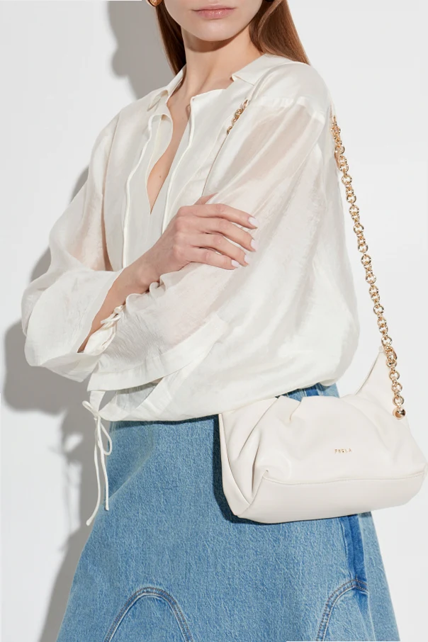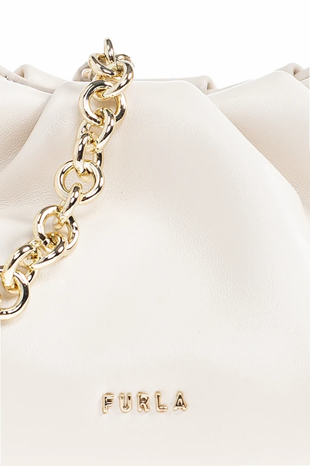 Torba została wykonana z wysokogatunkowej, gładkiej skóry licowej o nienagannej fakturze. Jej głównym atutem jest efektowny, złoty łańcuch pełniący rolę paska, który olśniewająco podkreśla ekskluzywny charakter produktu. Na froncie umieszczono minimalistyczne, złote logo „FURLA” – dyskretny znak prestiżowego domu mody.