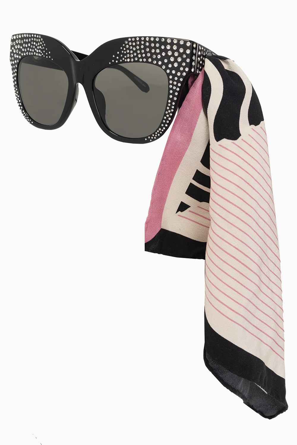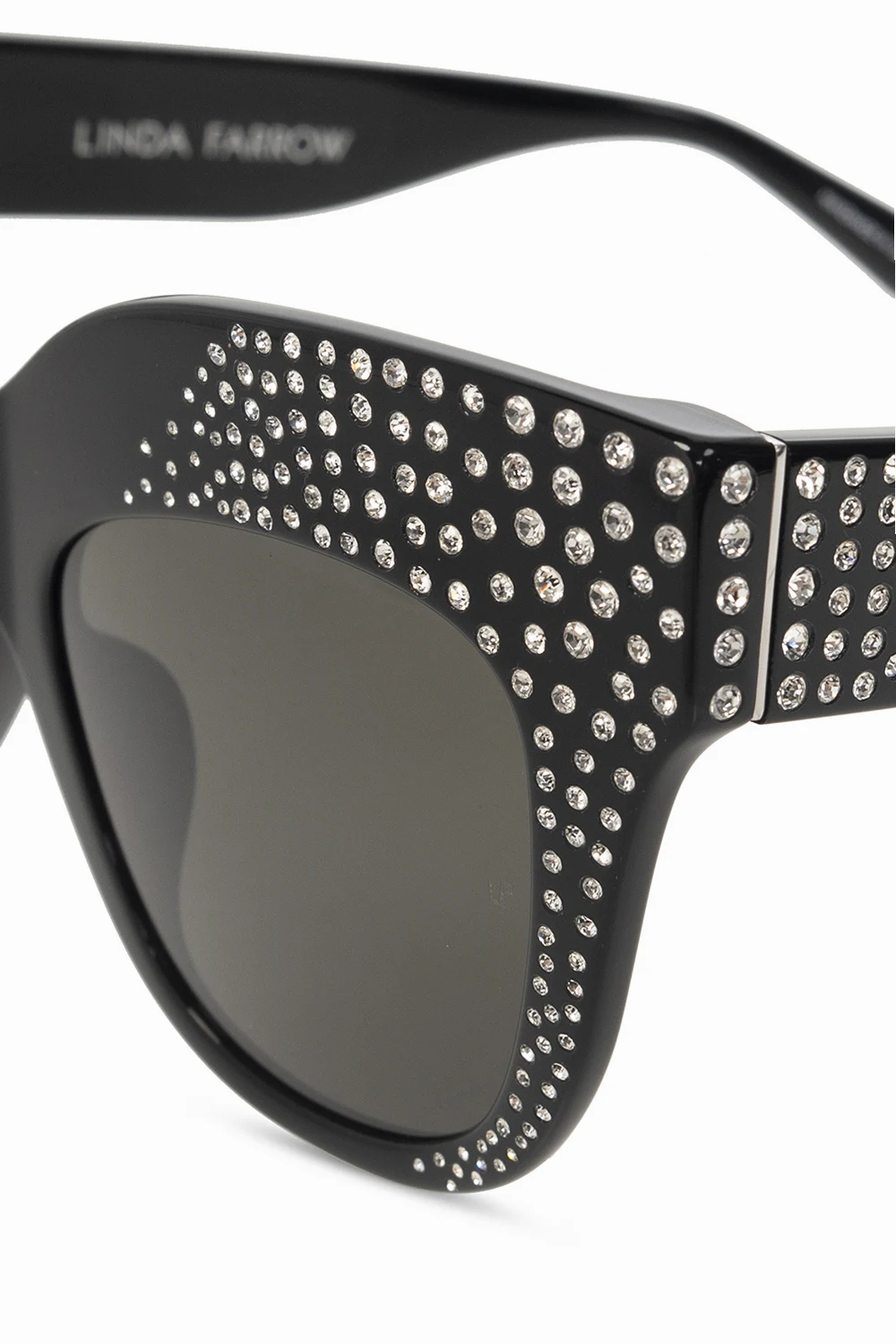 Czarne okulary przeciwsłoneczne, model ‘Dunaway’ Linda Farrow. Ozdobione połyskującymi kamieniami. Po bokach dekoracyjne wycięcia w kolorze srebrnym z wygrawerowanym logo. Zauszniki z wyprofilowanymi końcówkami, zapewniającymi wygodne dopasowanie. Szare soczewki w technologii ZEISS z ochroną przed odblaskami i 100% ochroną przed promieniowaniem UV. Dołączone etui. Wykonane ręcznie w Japonii.