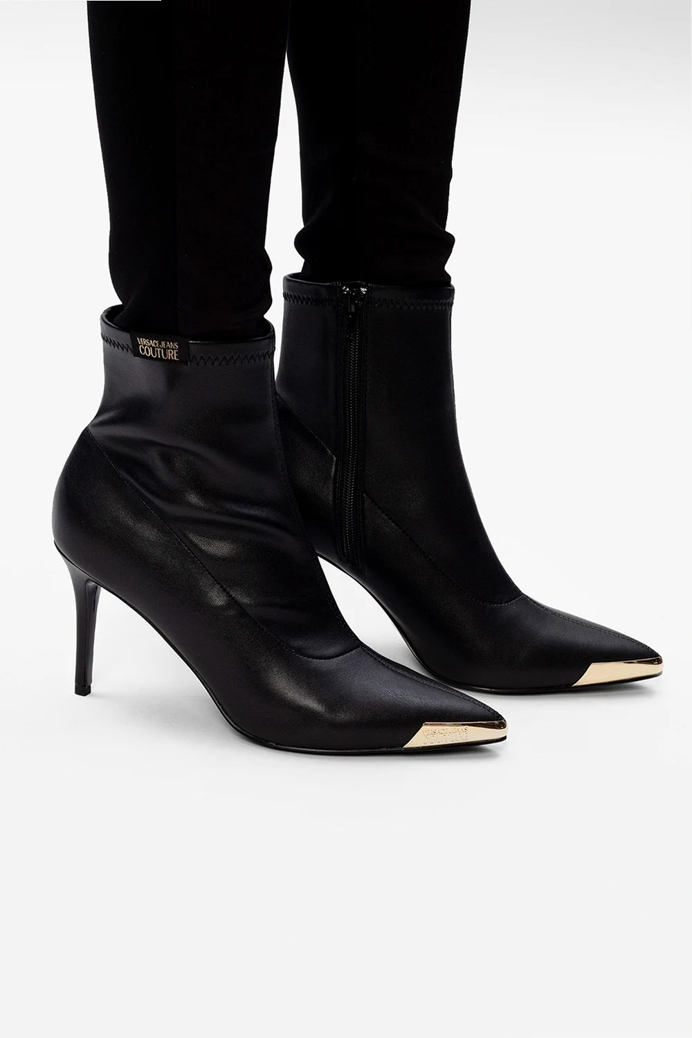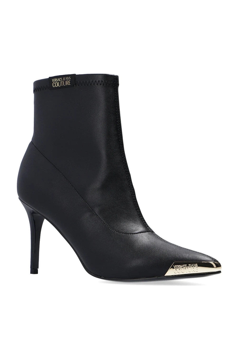 Czarne botki Versace Jeans Couture. Wykonane z materiału imitującego skórę. Z boku zamykane na zamek. Ozdobione aplikacją z logo w kolorze czarno-złotym. Czarna, gumowa podeszwa.