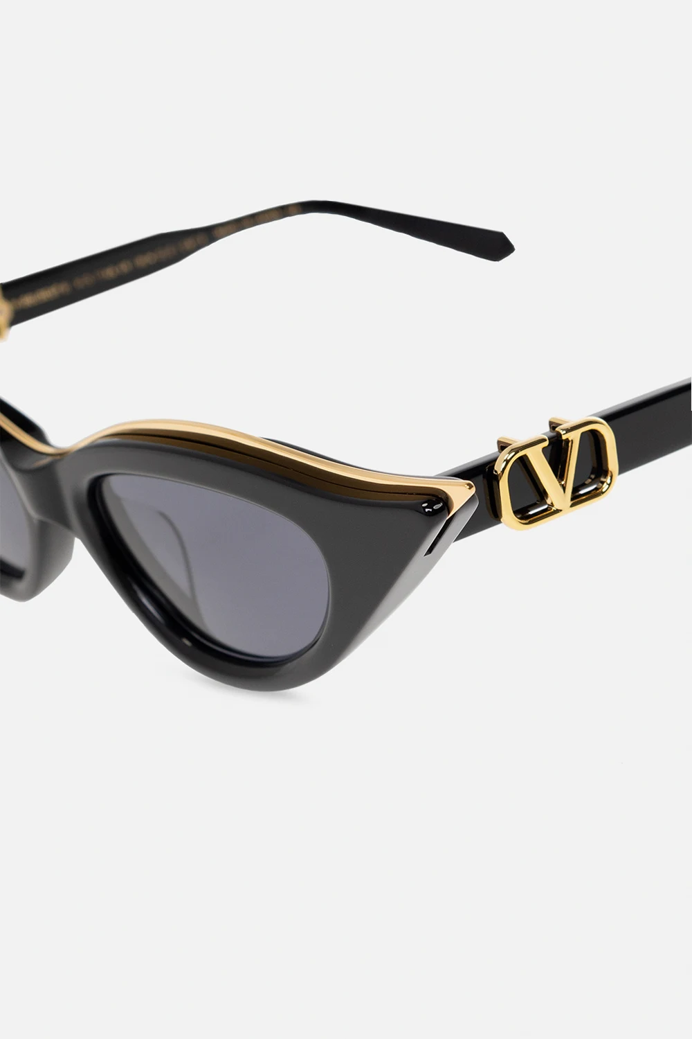 Okulary przeciwsłoneczne w kolorze czarno-złotym, model ‘V-Goldcut II’ Valentino Eyewear. Wykonane z lśniącego acetatu i tytanu. Oprawki w kształcie kocich oczu z pojedynczym mostkiem i zintegrowanymi noskami oraz dekoracyjnym wykończeniem na szczycie. Zauszniki z aplikacją w kształcie logo. Szare szkła ze 100% ochroną przed promieniowaniem UV oraz odblaskami. Dołączone etui z zapięciem na zatrzask, logo oraz odpinanym paskiem.