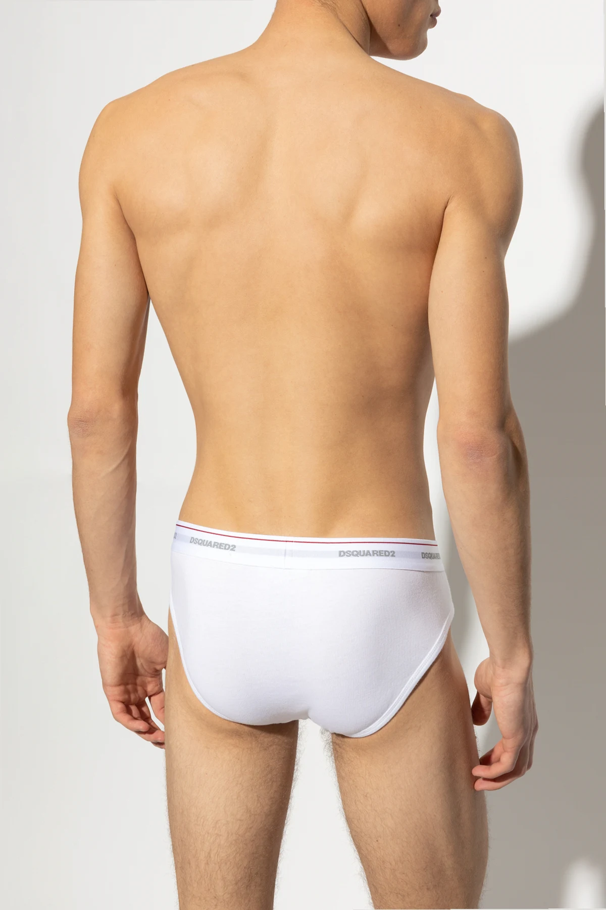 Trójpak bawełnianych slipów w kolorze białym Dsquared2. Ozdobione biało-czerwoną gumą z wyszytym logo w kolorze szarym.