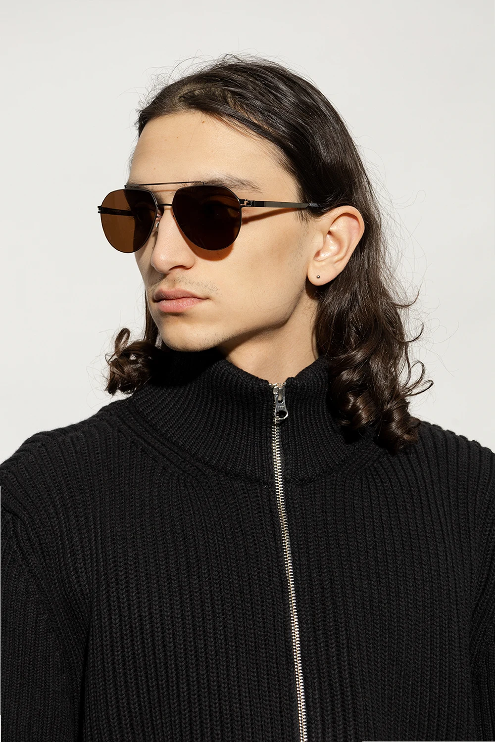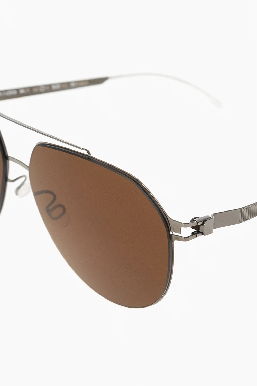 Okulary przeciwsłoneczne w kolorze ciemnego srebra i bieli, model ‘ML13’ Mykita x Leica. Wykonane ze stali nierdzewnej i mylonu - wyjątkowo lekkiego i wytrzymałego materiału. Oprawki typu ‘aviator’. Mostek ozdobiony wzorem. Brązowe szkła Leica Brown Polarized ze 100% ochroną przed promieniowaniem UV. Ręcznie wykonane w Berlinie. Dołączone etui.