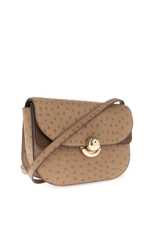 Zewnętrzna część torebki została wykonana z pieczołowicie wybieranej skóry o wypukłej fakturze imitującej skórę strusia . Regularnie rozmieszczone „kropki” ujmują ekskluzywnym charakterem, czyniąc każdą stylizację wyjątkową. Luksusowy akcent dopełnia ozdobne, półokrągłe zapięcie w kolorze złotym , na którym wygrawerowano logo projektanta.