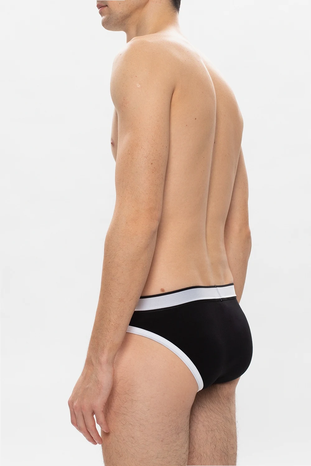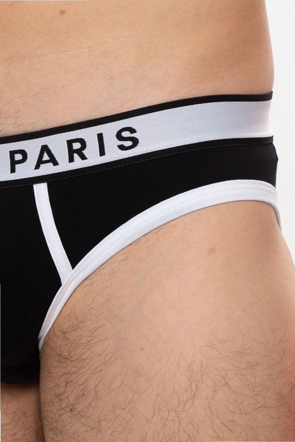 Czarno-białe slipy Balmain. Na górze wszyta guma z logo w kolorze czarnym.