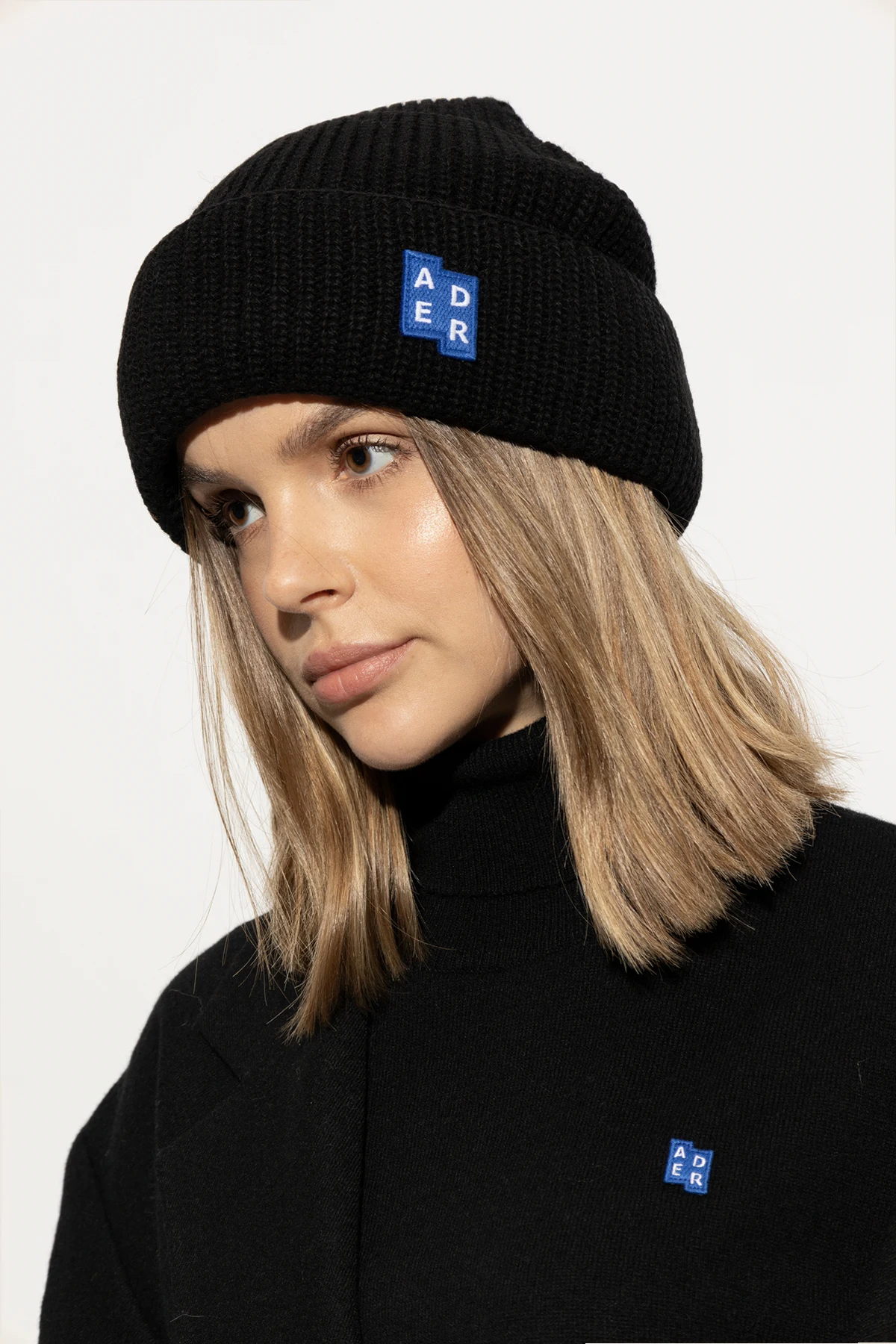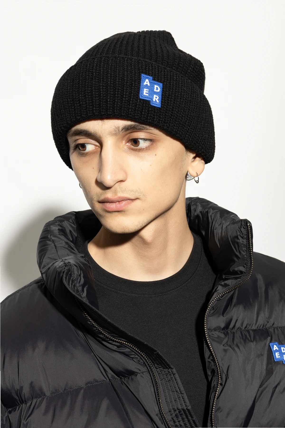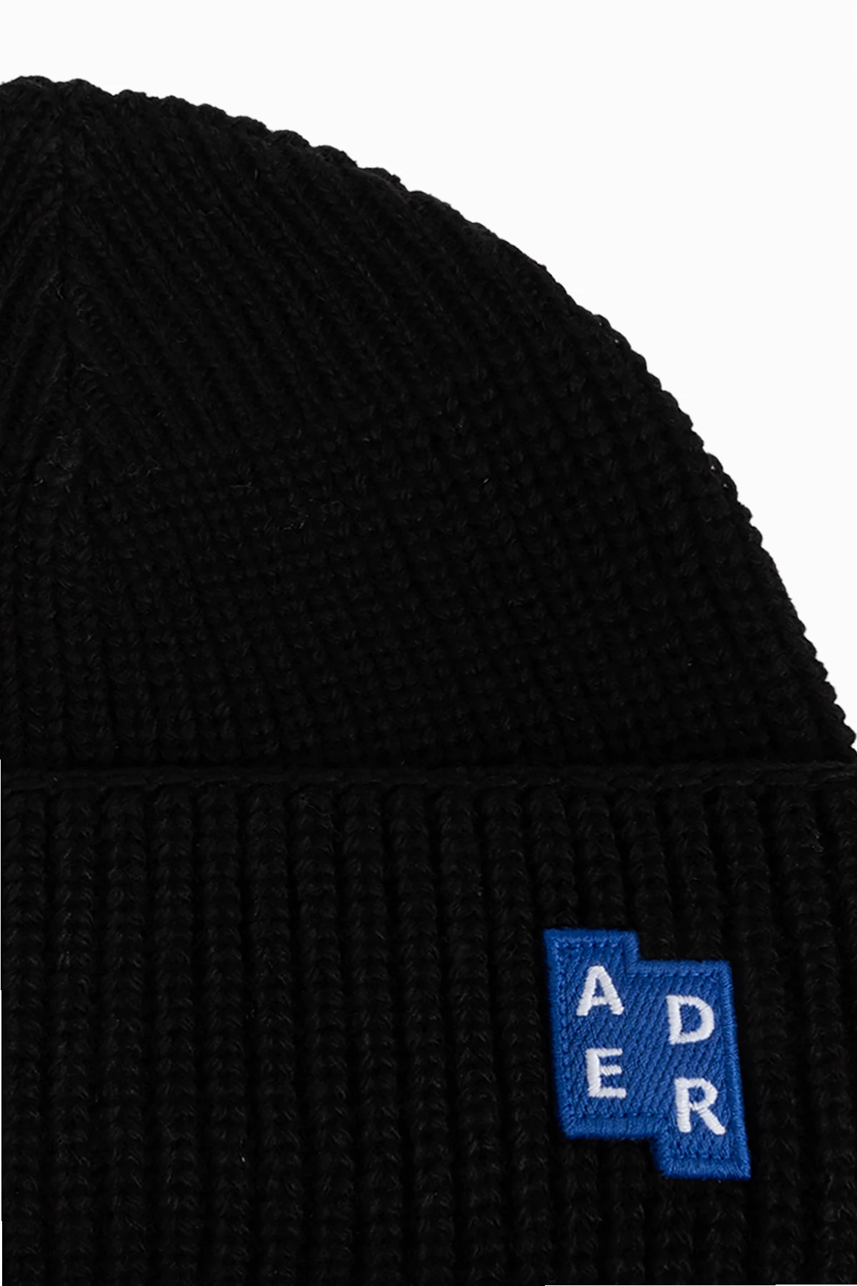 Na przedniej części czapki znajduje się subtelne, prostokątne logo projektanta w kolorze niebieskim z białymi literami "ADER", które stanowi dyskretny, aczkolwiek charakterystyczny akcent. Na innym zdjęciu widoczne jest logo w stylu graffiti, również na niebieskim tle, co podkreśla awangardowy charakter marki.