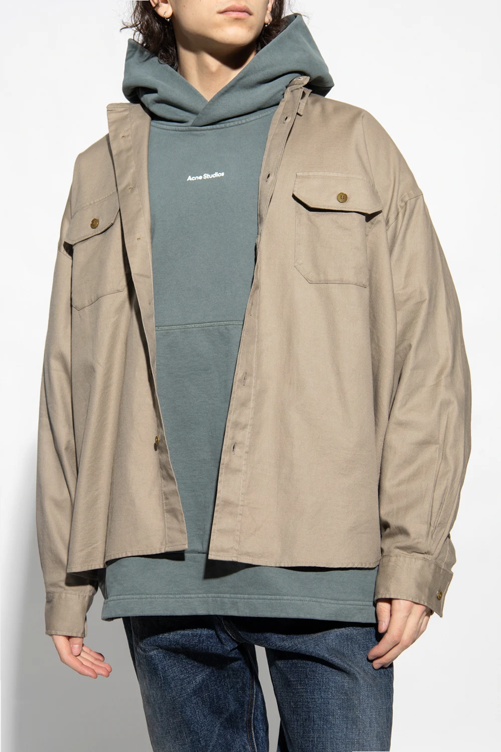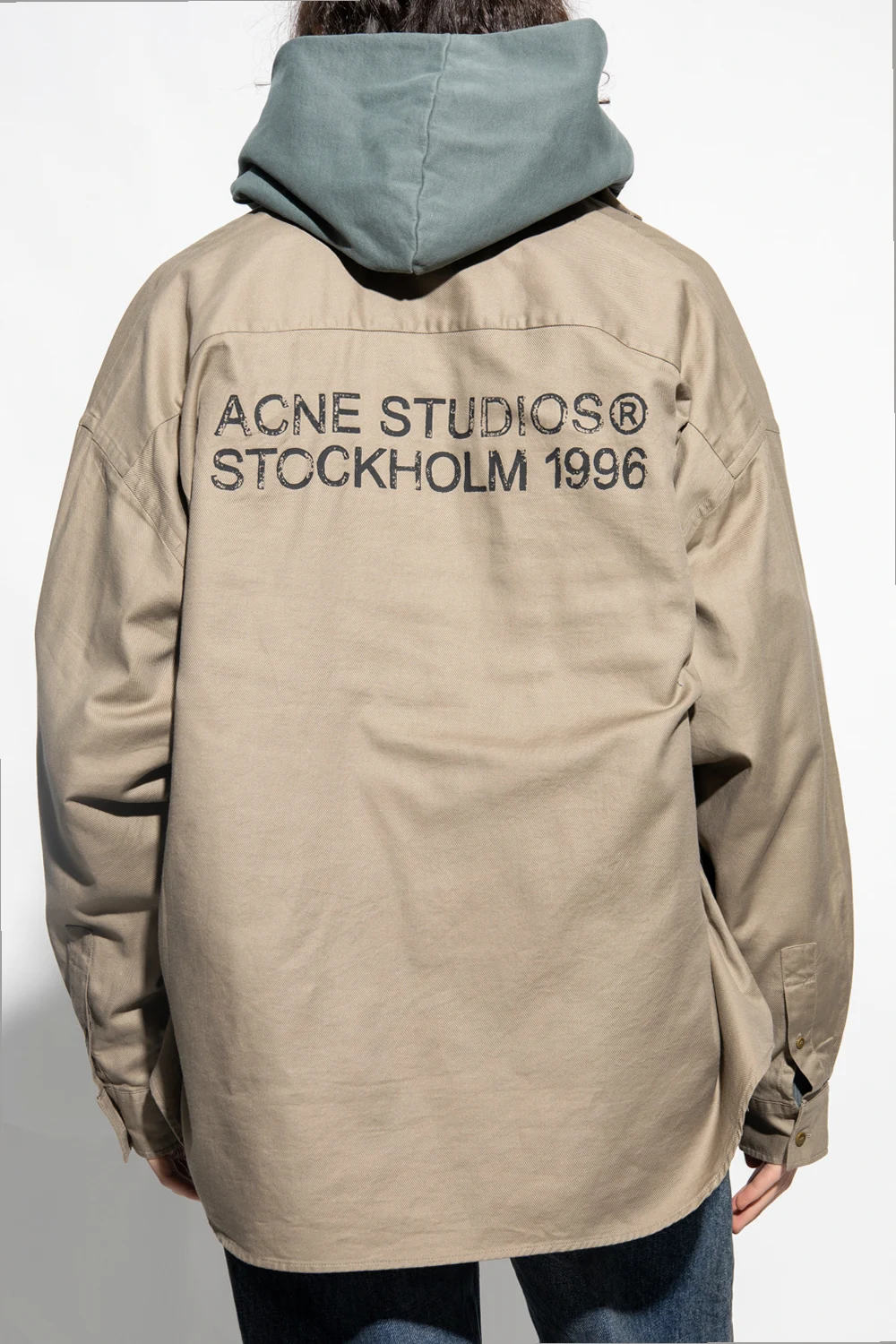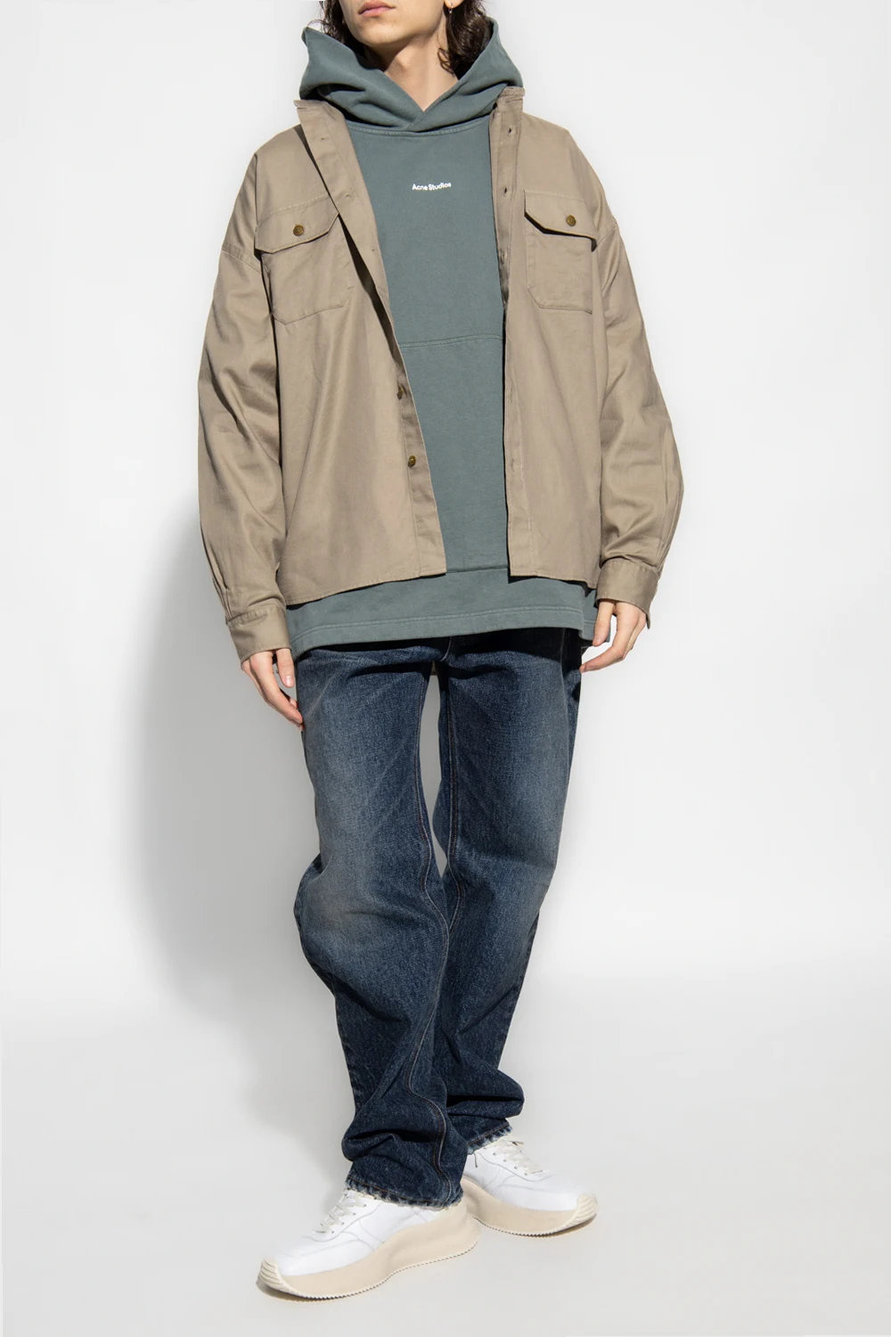 Ciemnobeżowa koszula typu ‘oversize’ Acne Studios. Wykonana z bawełny. Zapinana na guziki. Z tyłu ozdobiona czarnym nadrukiem z logo. Z przodu dwie kieszenie z patką i mankiety przy długich rękawach zapinane na guzik.