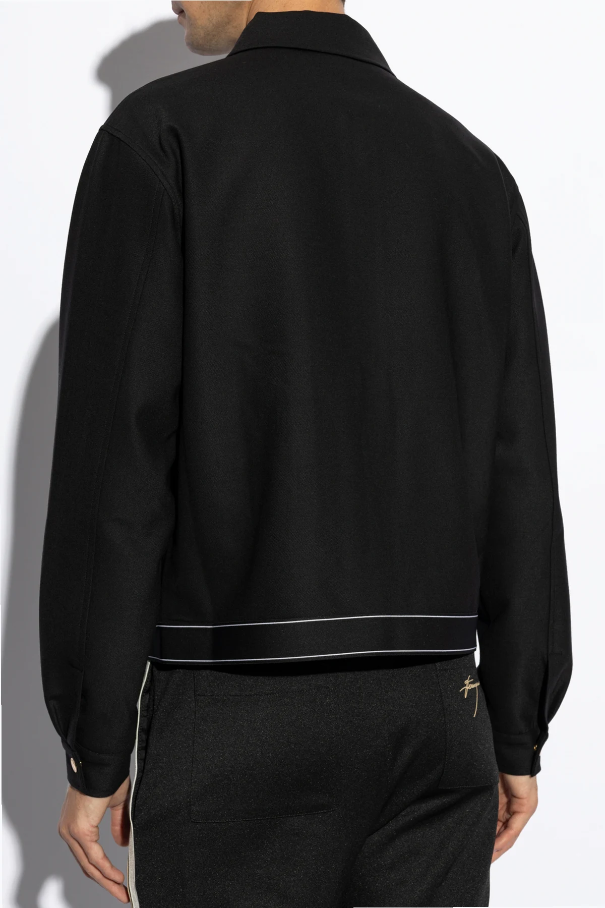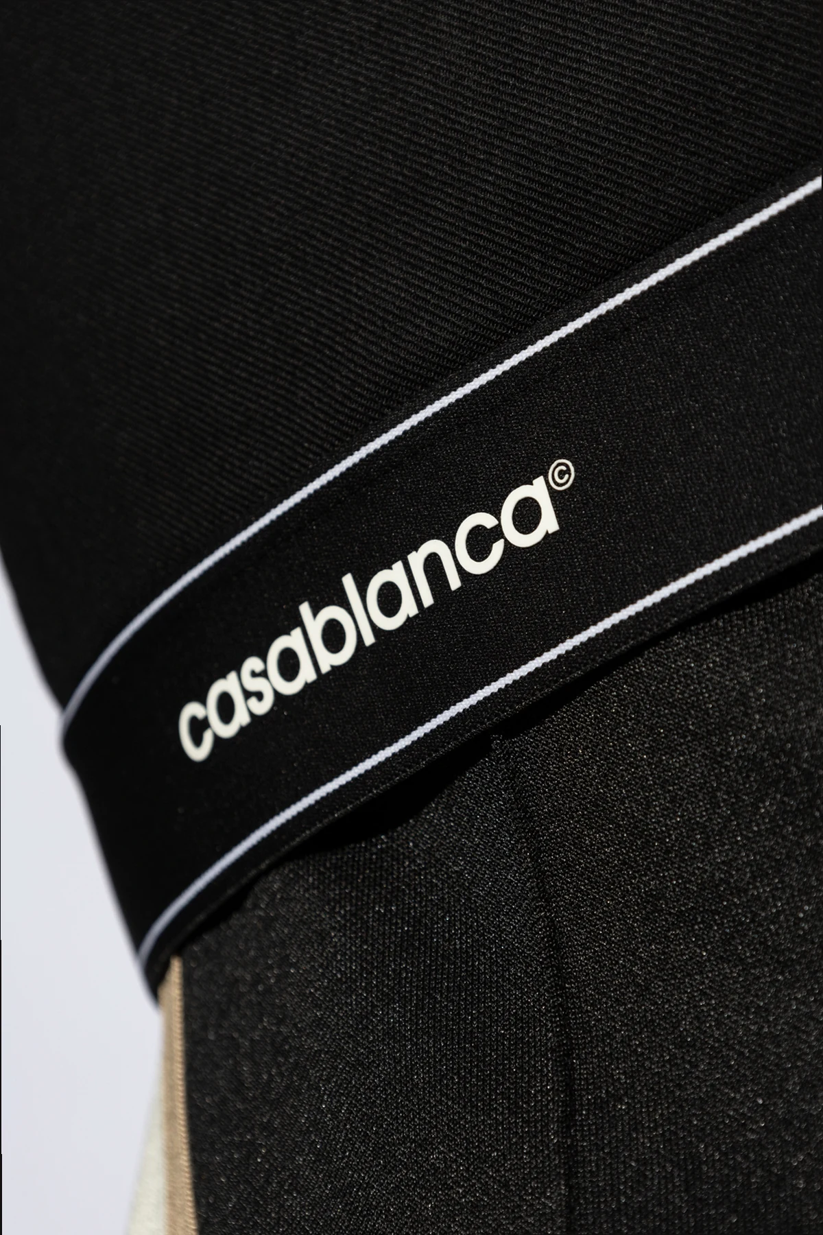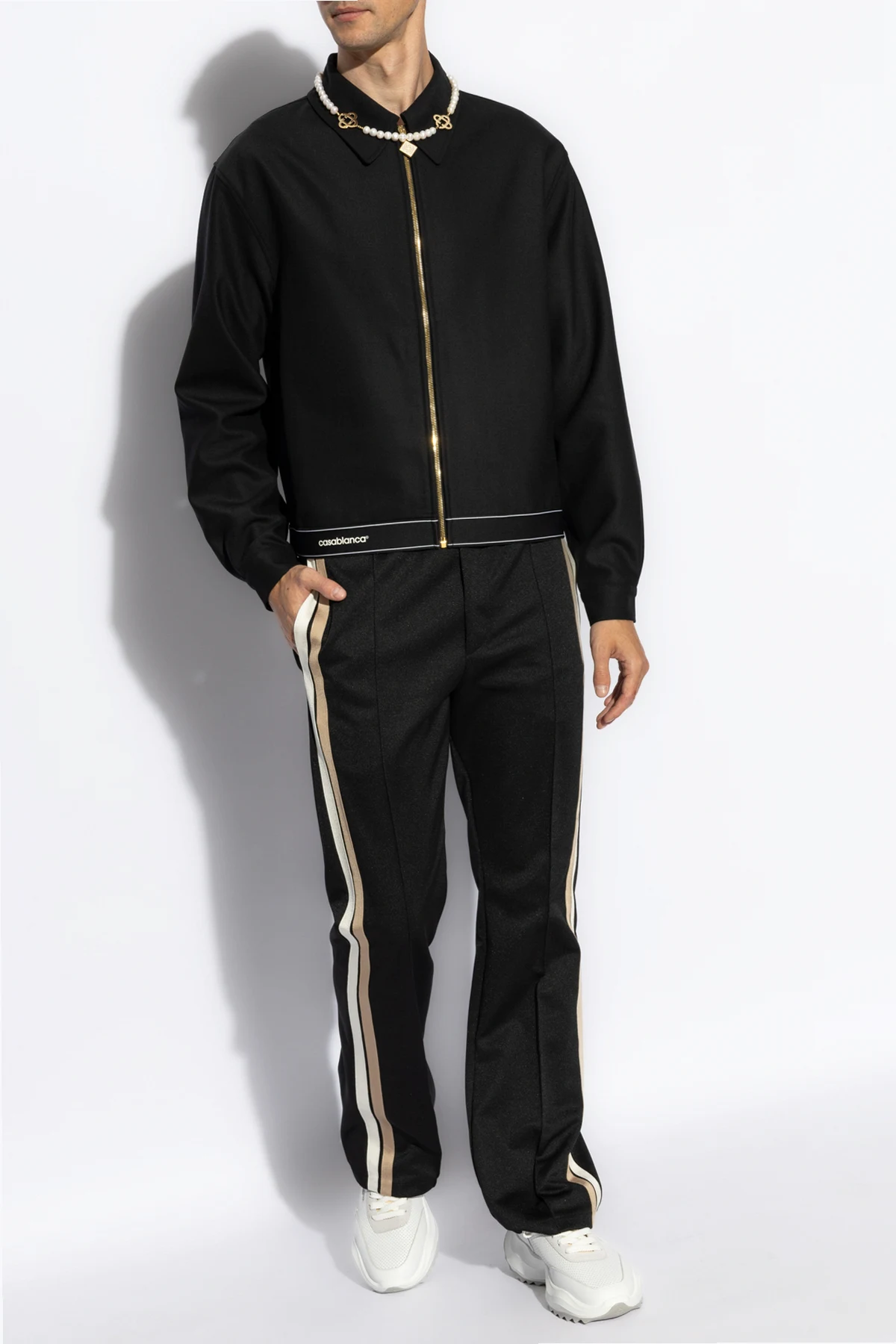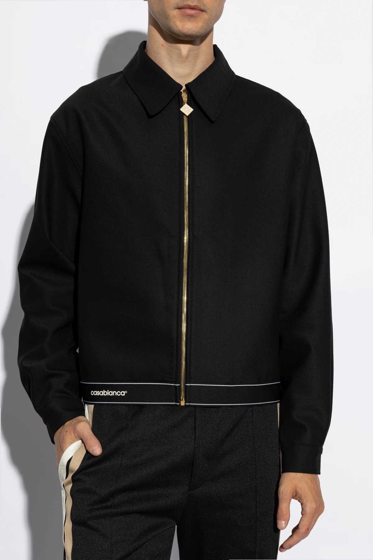 Charakterystyczny dla projektu jest złoty zamek błyskawiczny , biegnący wzdłuż całej przedniej części, kończący się elegancko na wysokości pasa. Dodaje on wyrafinowanego blasku, podkreślając unikatowy charakter kurtki. Kołnierz typu stójka oraz subtelny, ale wyrazisty pasek z nazwą projektanta na dole kurtki, obramowany czarną lamówką, akcentują prestiż marki Casablanca .