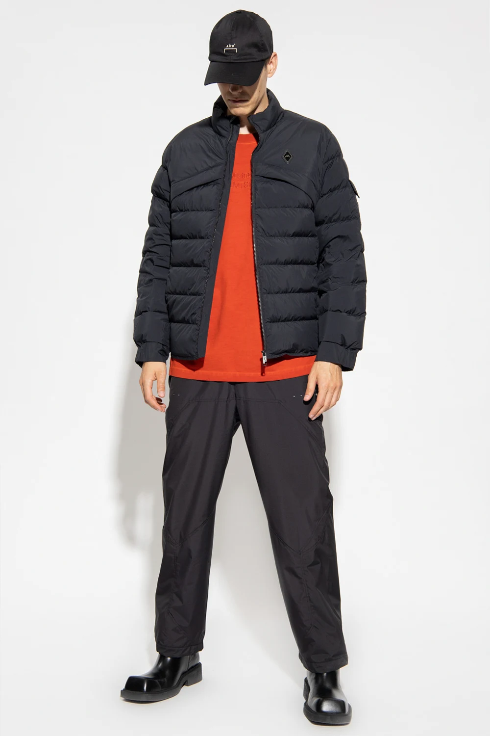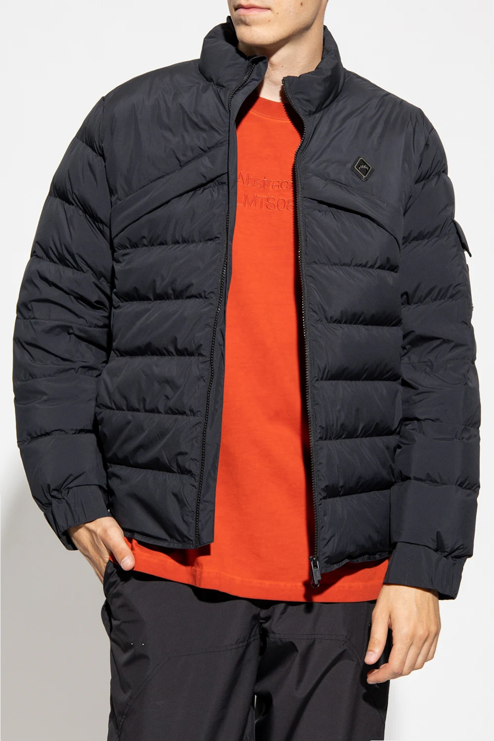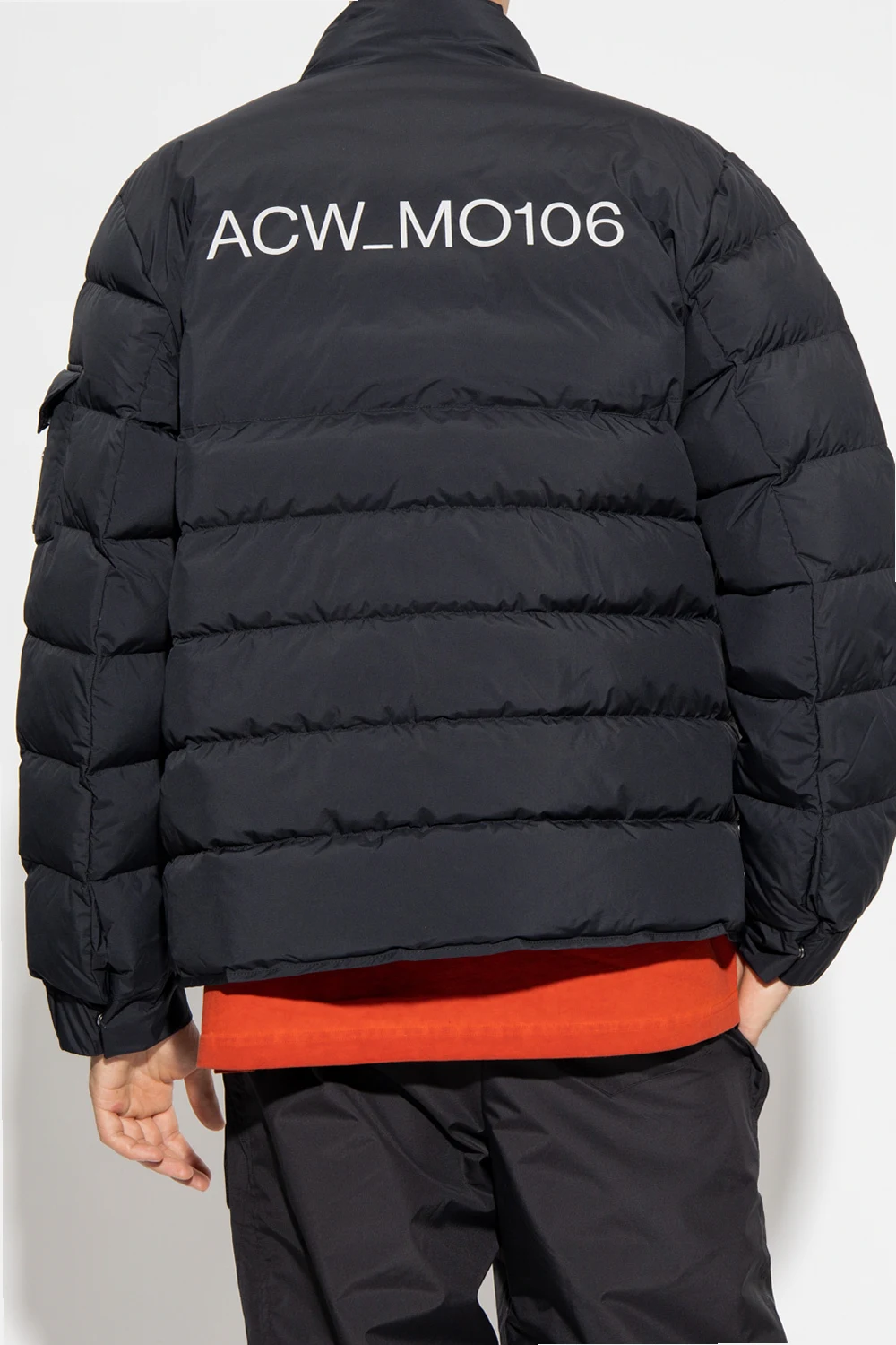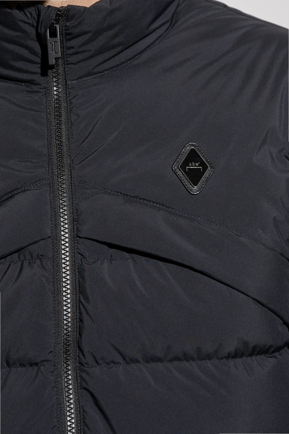 Czarna, puchowa kurtka A-COLD-WALL*. Zapinana na dwubiegunowy zamek. Ozdobiona pikowaniem oraz naszywkami z logo. Motyw powtórzony z tyłu w formie odblaskowego nadruku w kolorze srebrnym. Cztery kieszenie: dwie wsuwane oraz dwie zamykane na zamek. Dodatkowa kieszeń na rękawie z patką z zapięciem na zatrzask. Długie rękawy zakończone ściągaczem.
